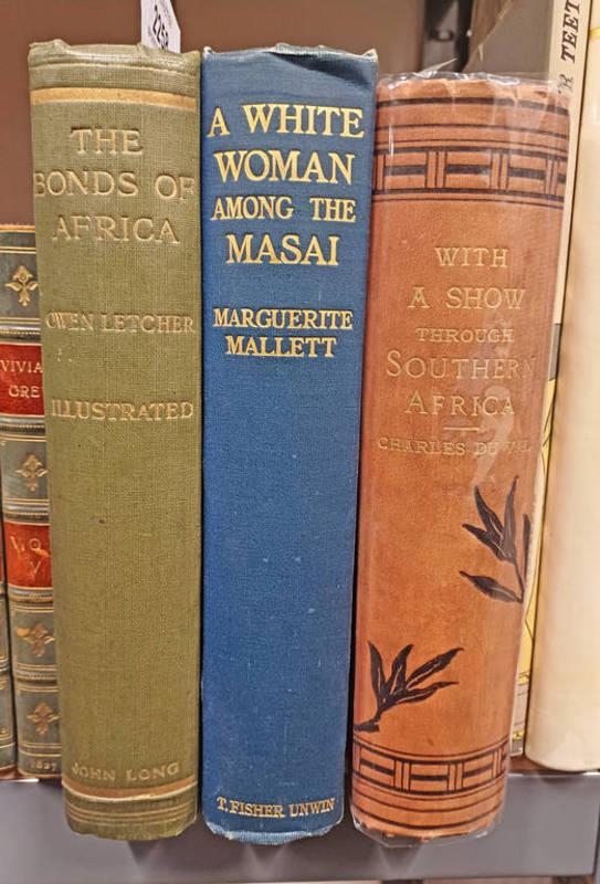 WITH A SHOW THROUGH SOUTHERN AFRICA, AND PERSONAL REMINISCENCES OF THE TRANSVAAL WAR BY CHARLES DU VAL, 2 VOLUMES BOUND AS 1 - 1882, A WHITE WOMAN AMONG THE MASAI BY MARGUERITE MALLETT - 1923, AND THE BONDS OF AFRICA, IMPRESSIONS OF TRAVEL AND SPORT FROM CAPE TOWN TO CAIRO 1902-1912 BY OWEN LETCHER - 1913 -3-