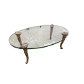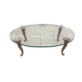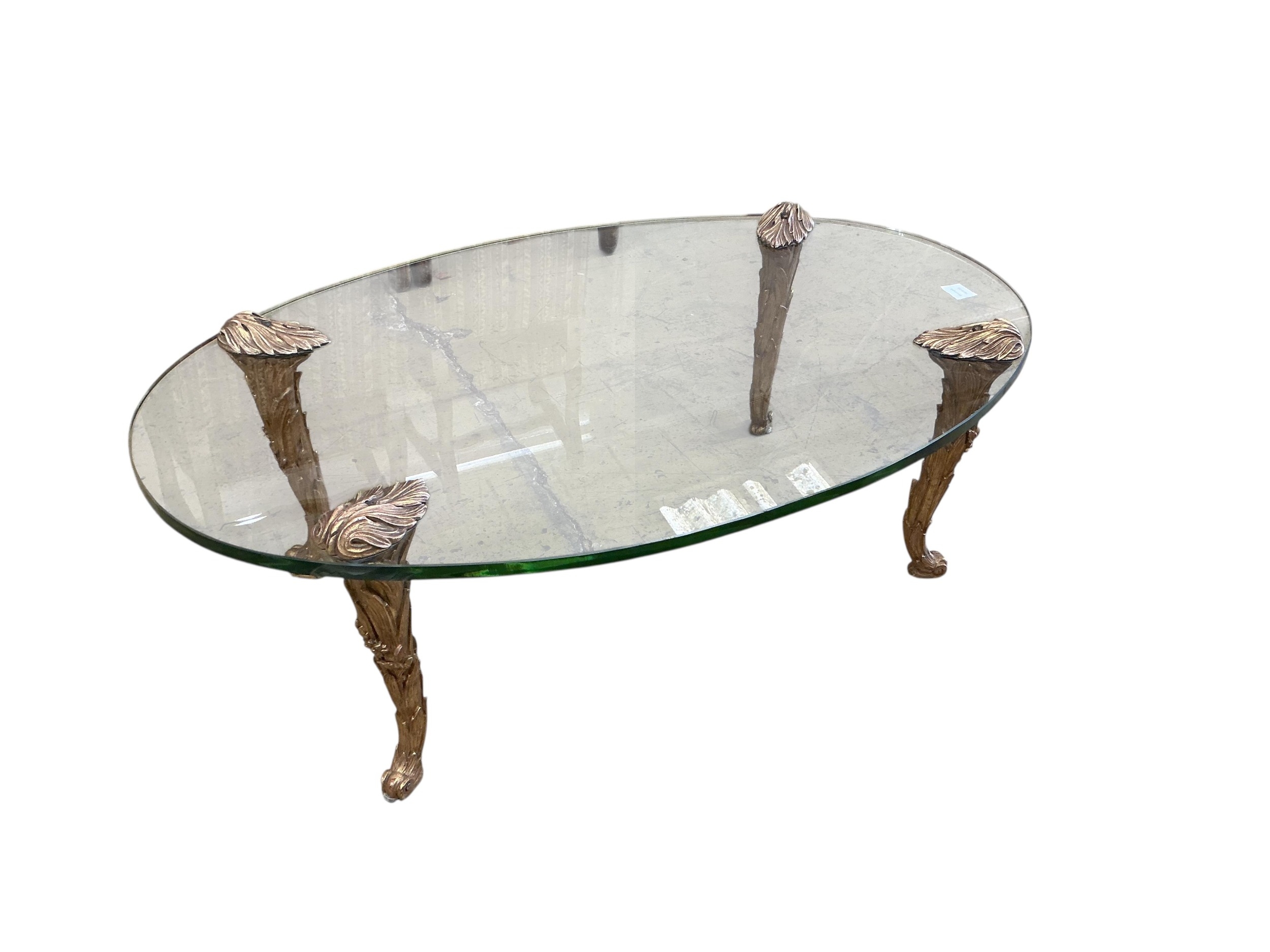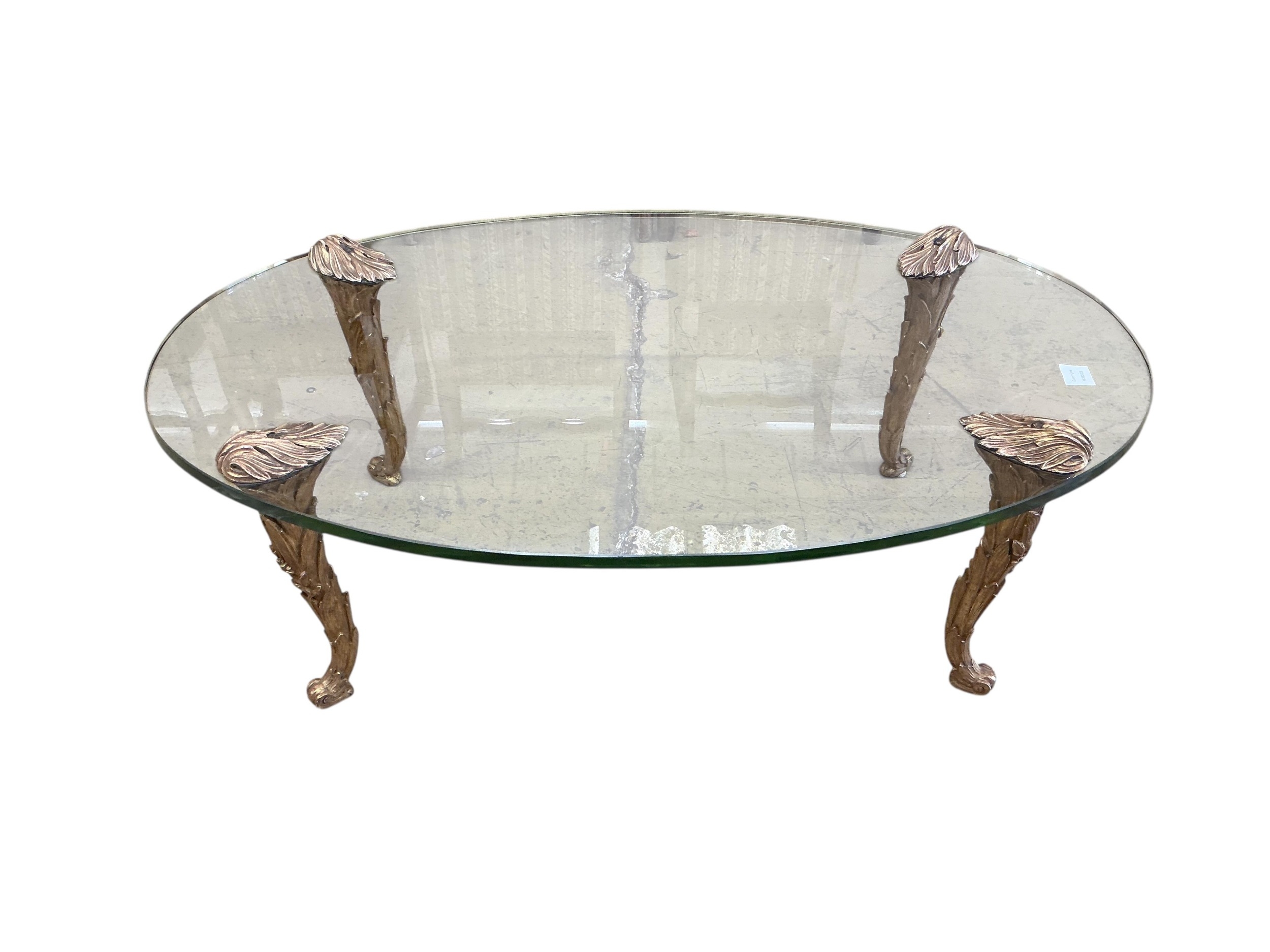 A Contemporary oval glass topped coffee table on giltwood legs, width 114cm, depth 72cm, height 38cm