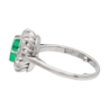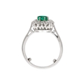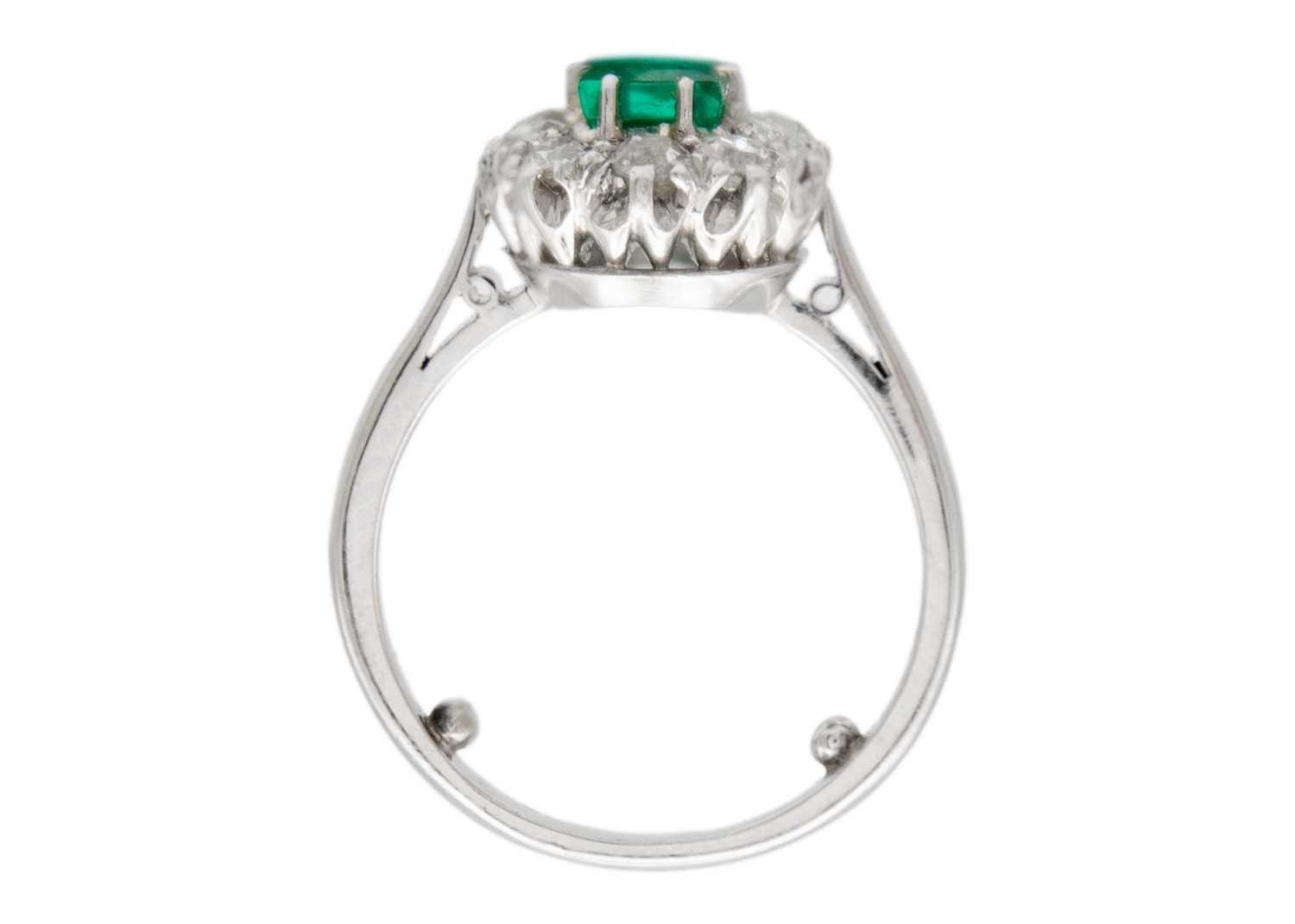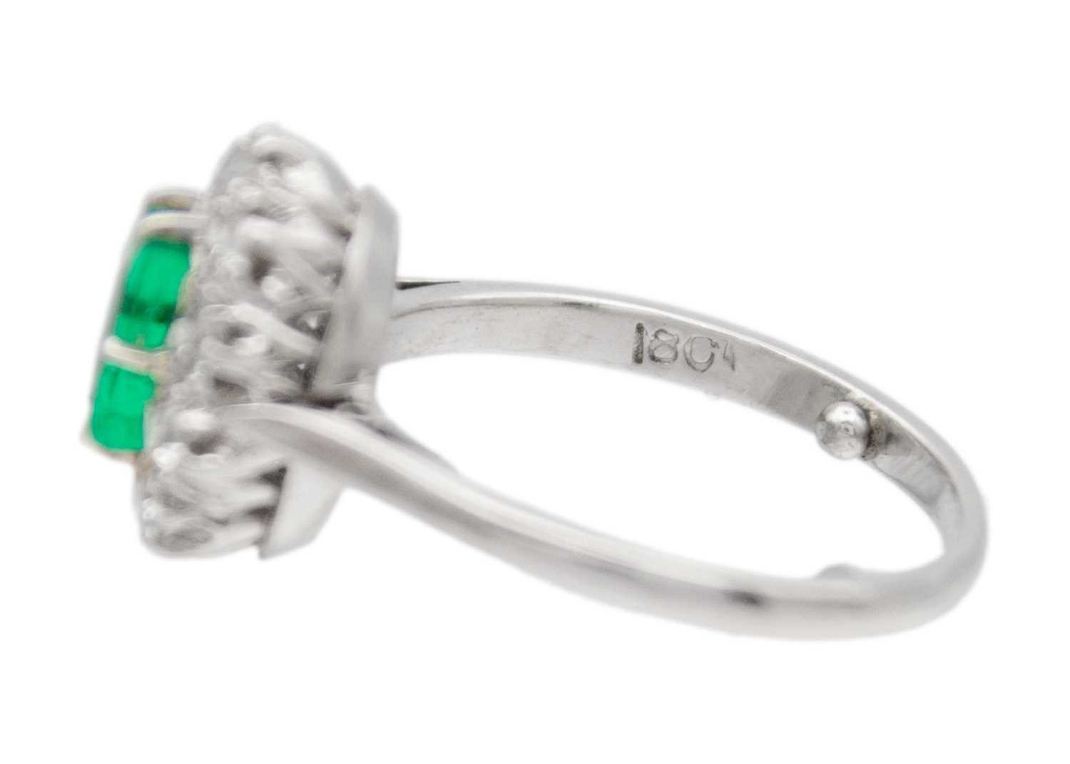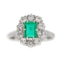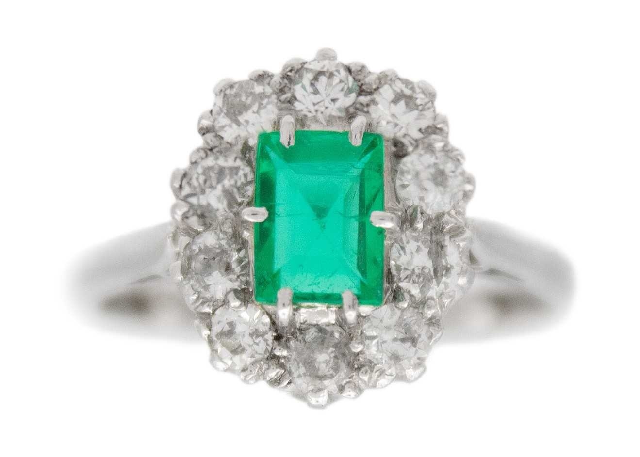 An emerald and diamond set white gold cluster ring. A rectangular step-cut, vivid, saturated green emerald, 0.75ct approx., of a high clarity, surrounded by ten round, earlier modern, brilliant-cut diamonds, diameter 2mm each approx, the head size is 10mm x 12mm, the shank is sized to J, stamped 18ct, total weight 4.49g.