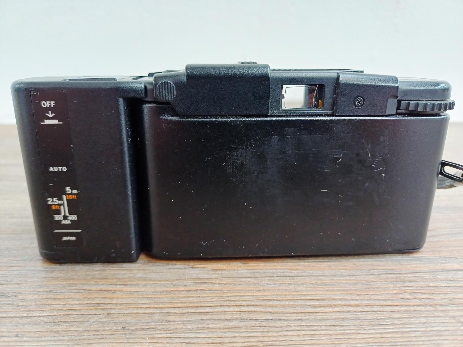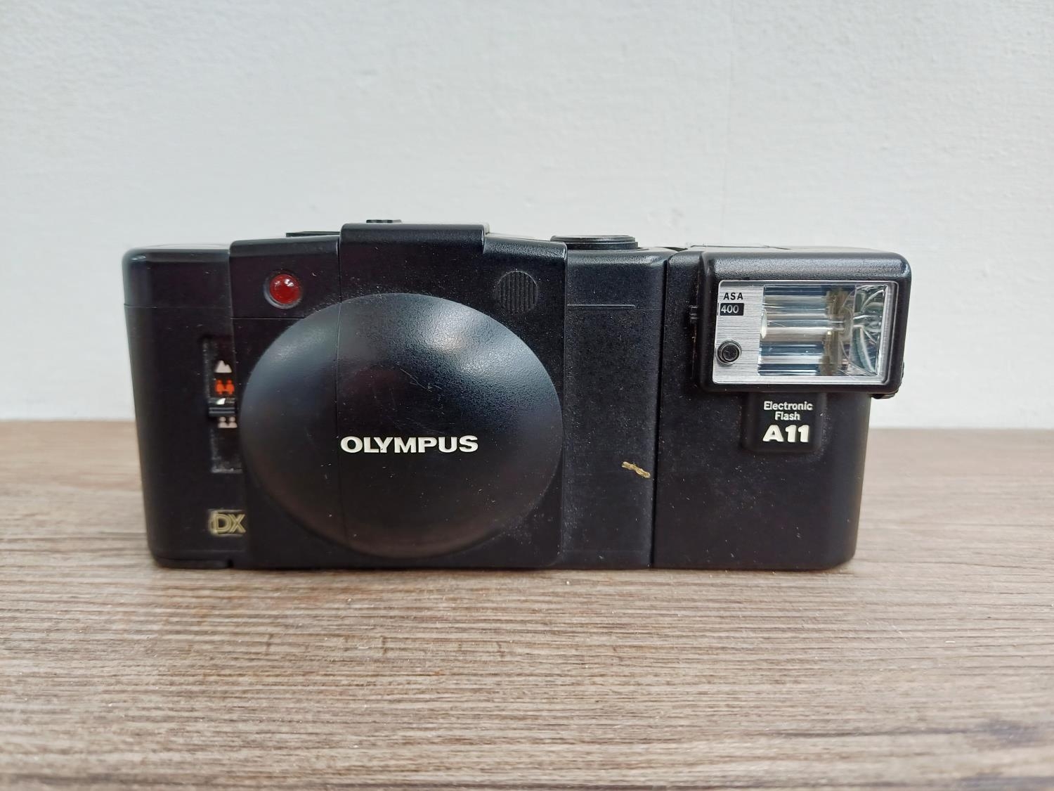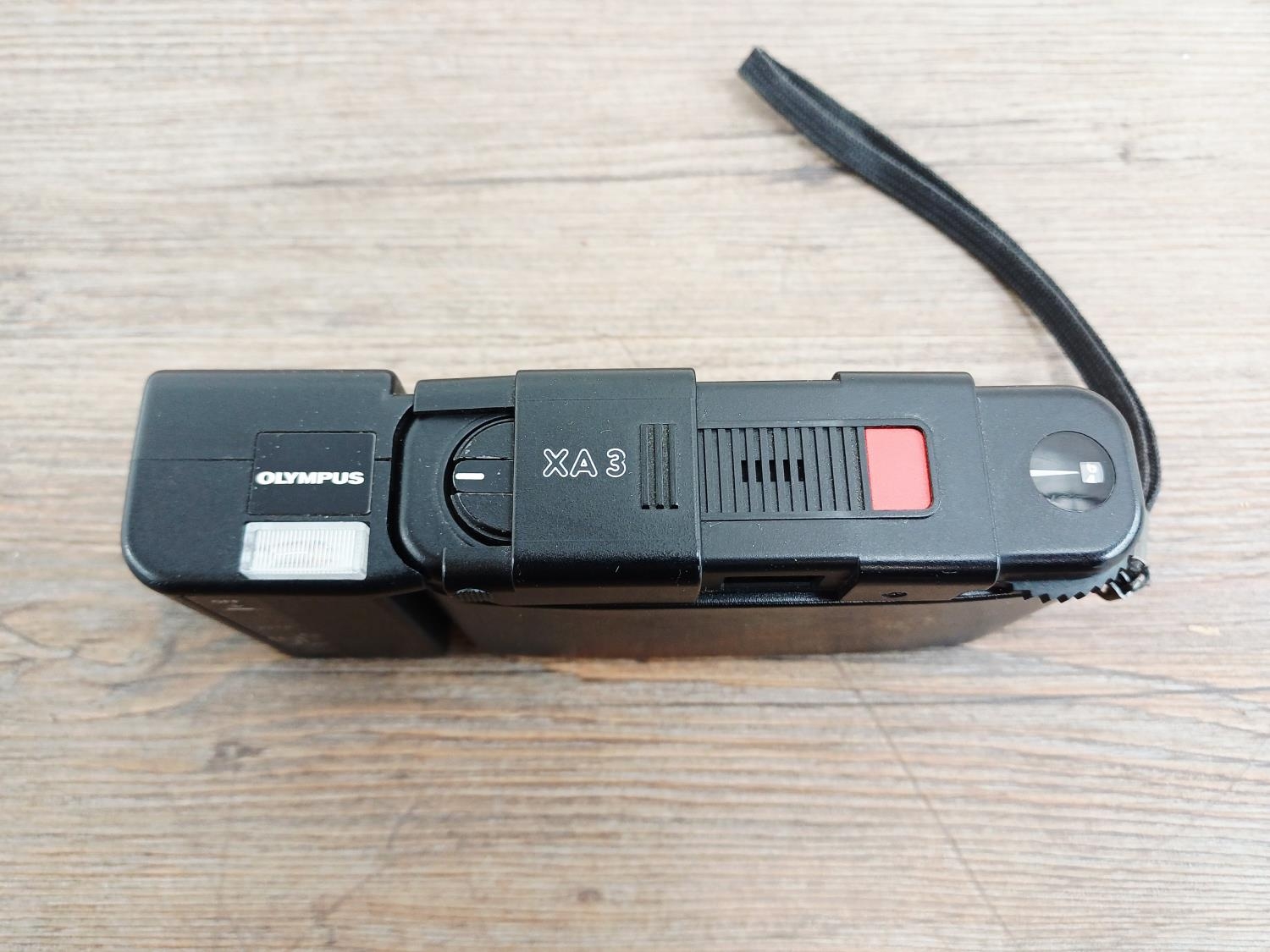 An Olympus XA3 ultra-compact 35mm viewfinder camera fitted with A11 flash