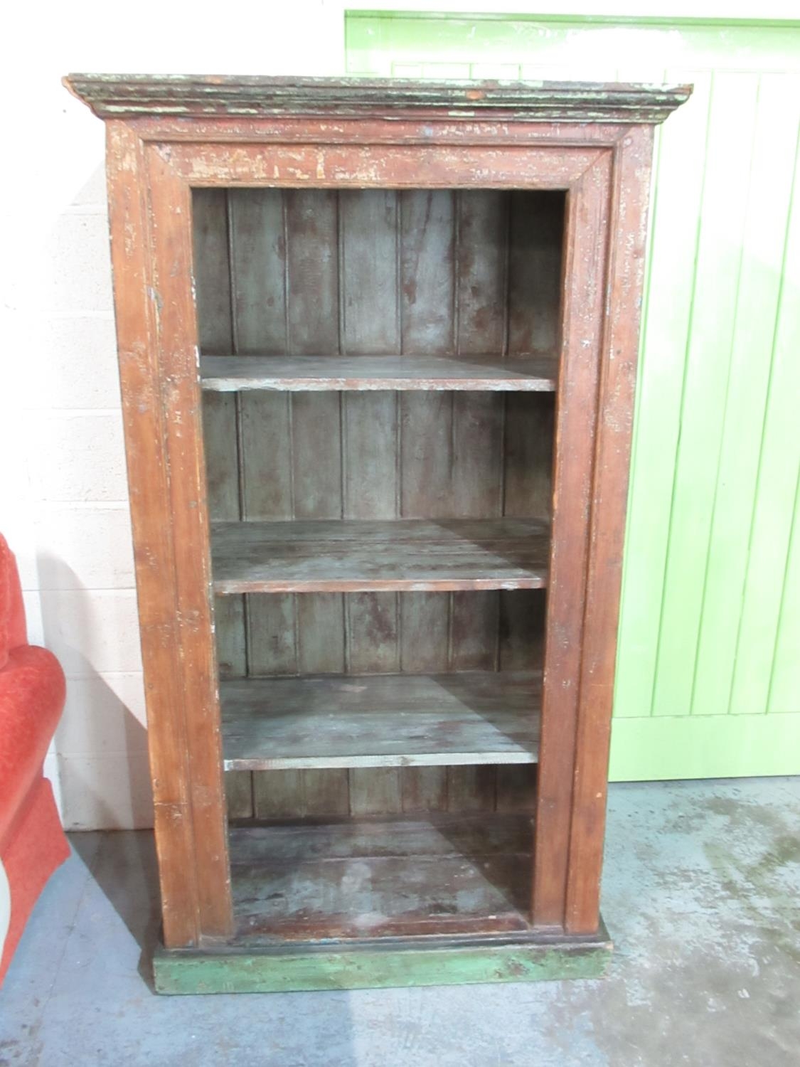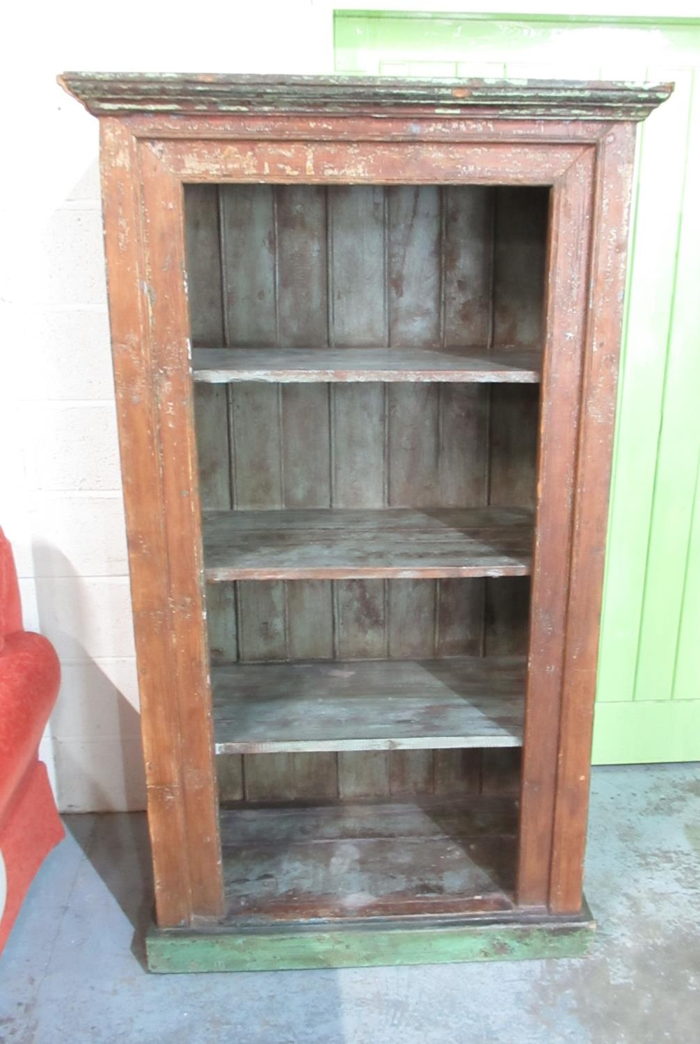 Jenny Powell Collection - Rustic painted oak open cabinet, with moulded cornice and three shelves on skirted base, W104cm D54cm H180cm