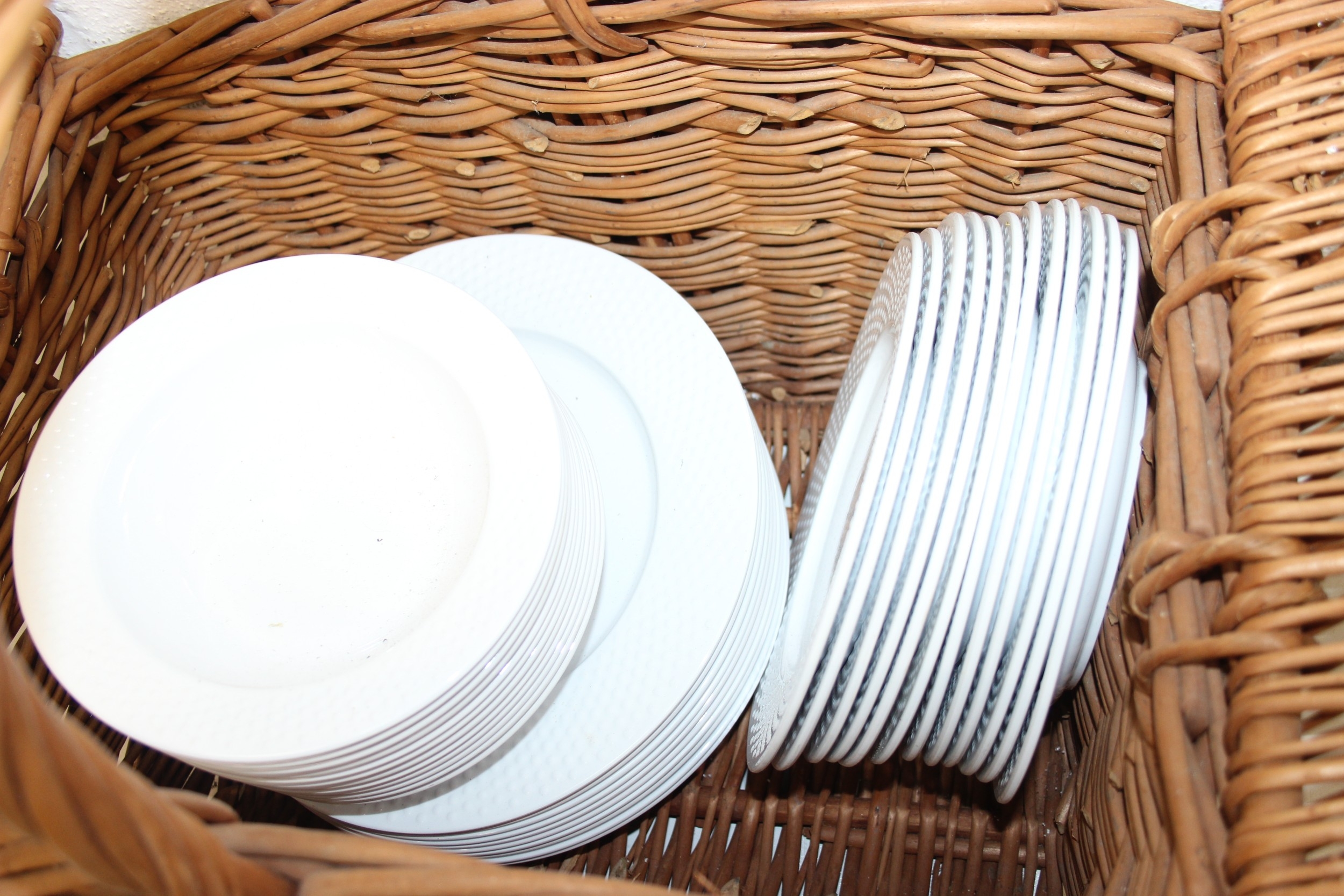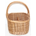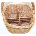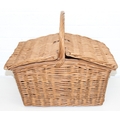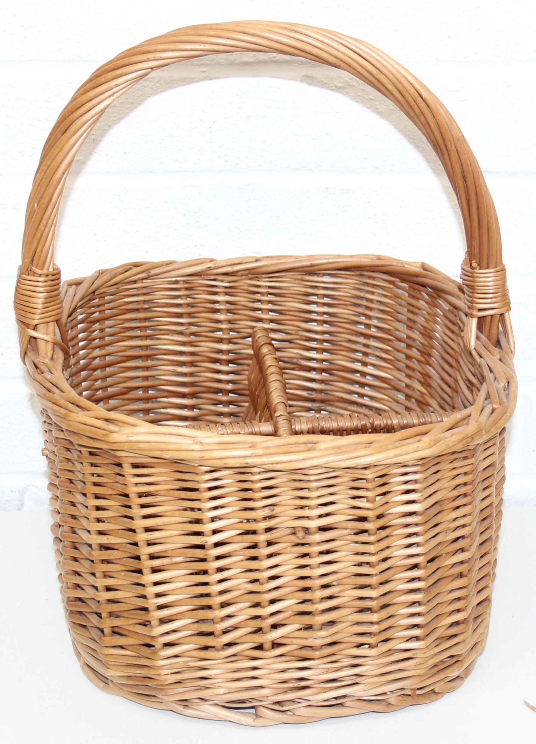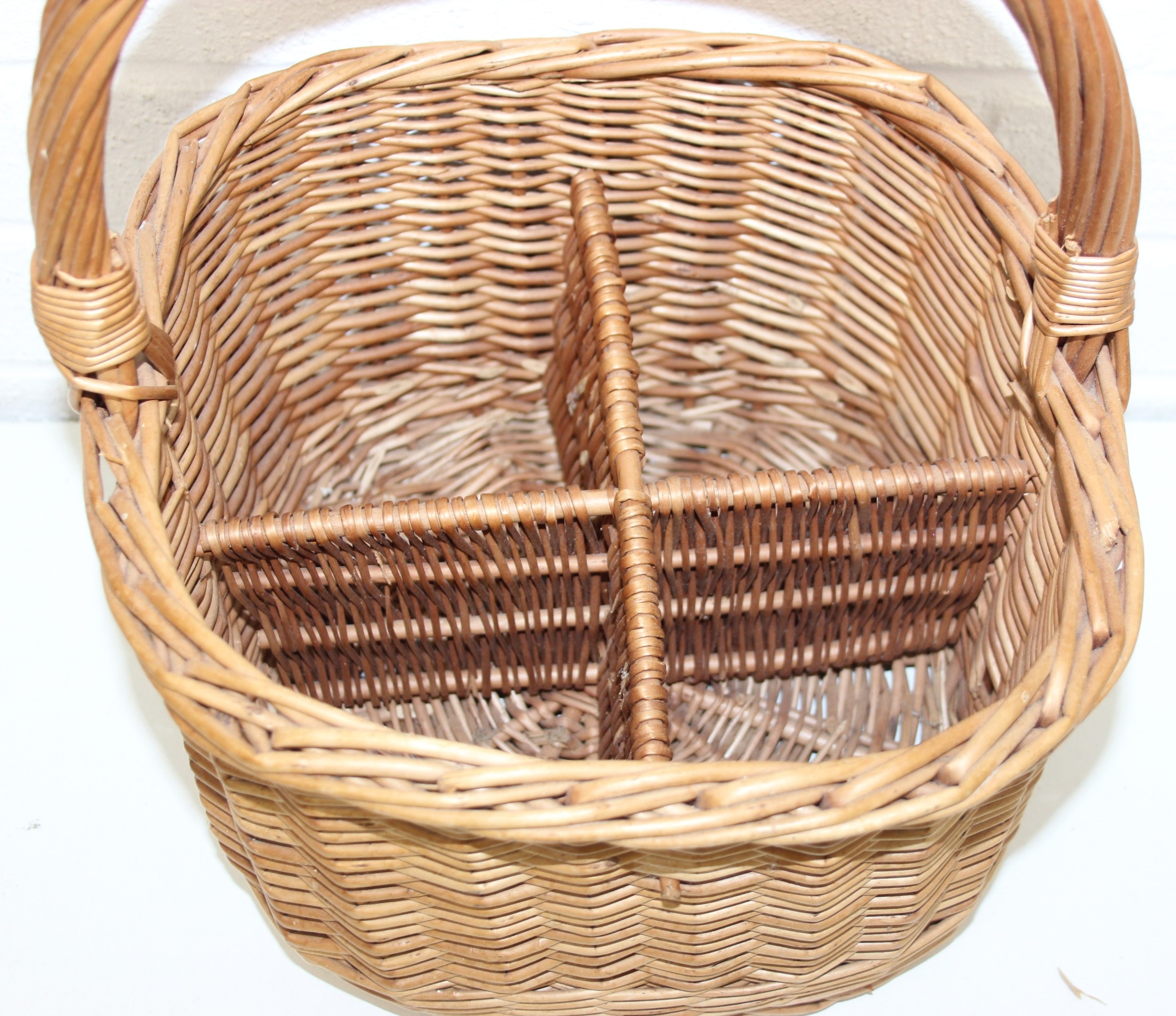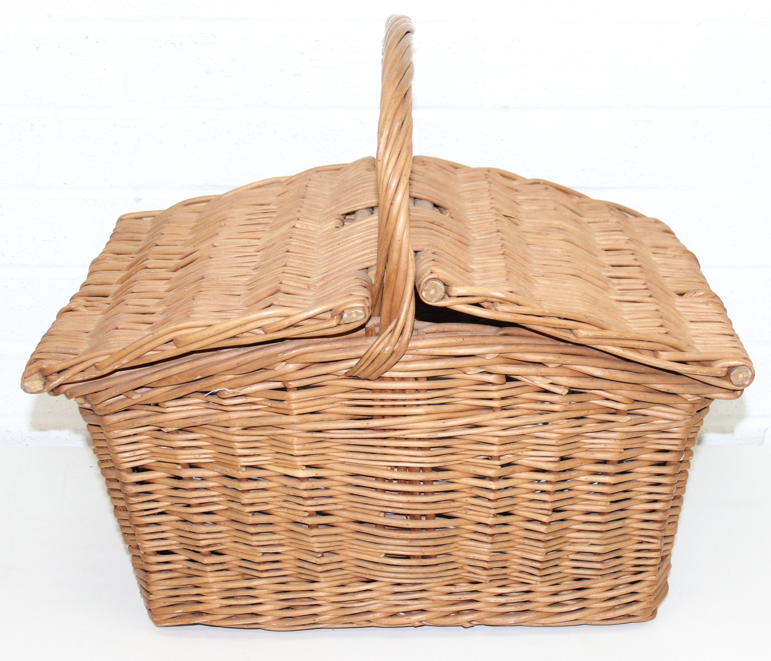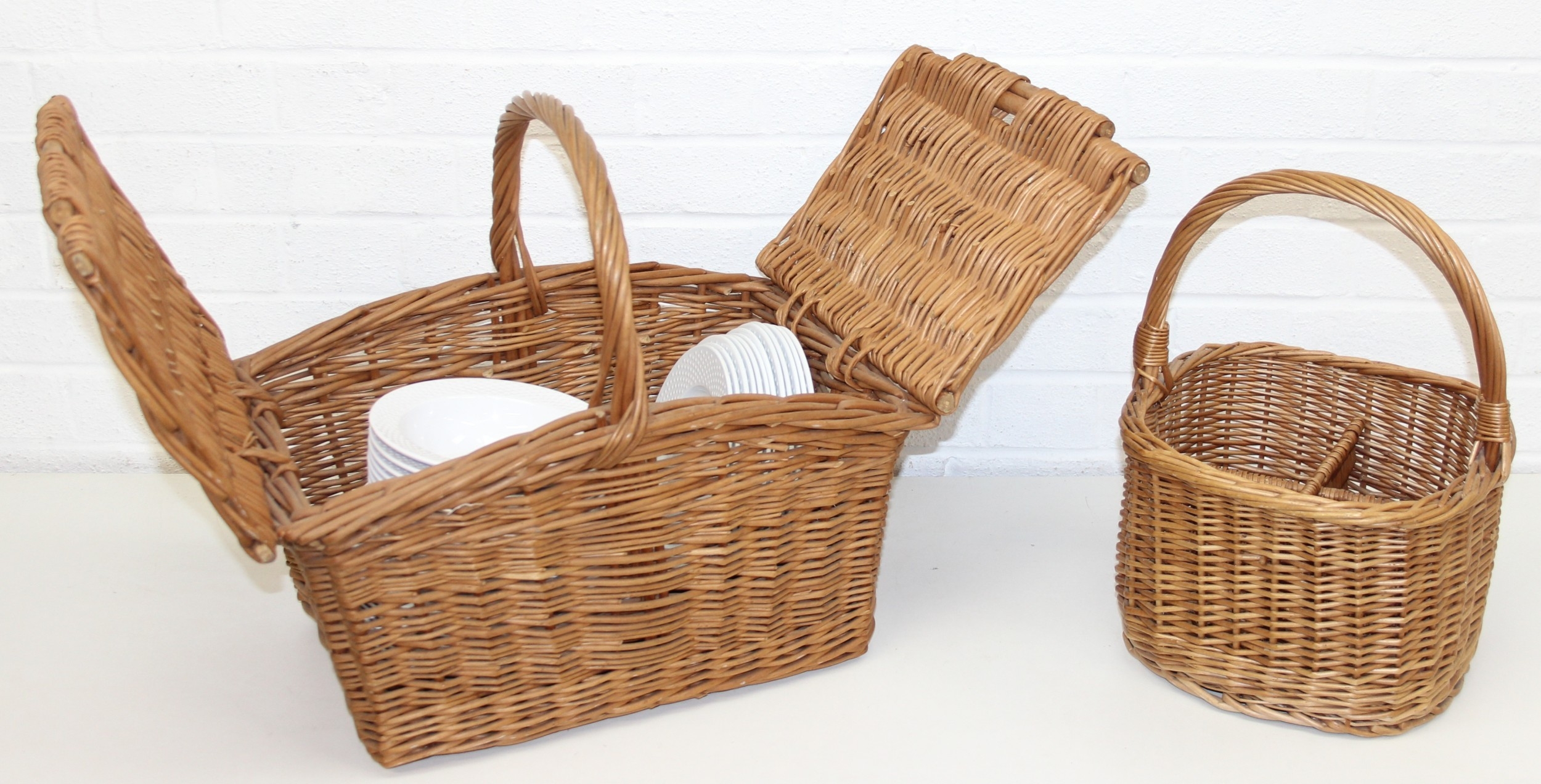 Two vintage wicker picnic baskets to incl hamper basket with handle to incl melamine contents, and wine bottle carrier, largest 51cm x 38cm x 46cm [2]