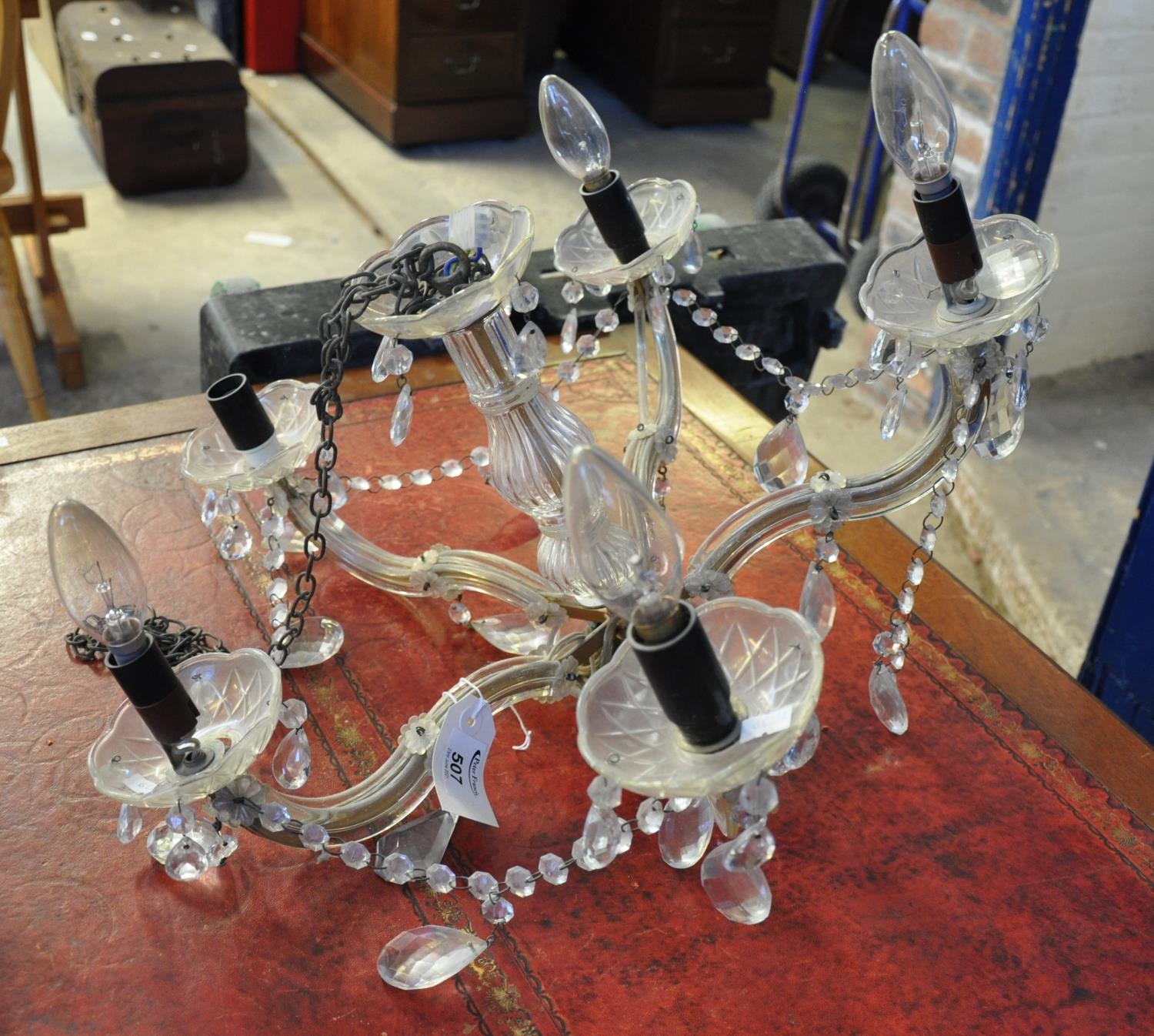 Five branch glass chandelier with droplets etc. (B.P. 21% + VAT)