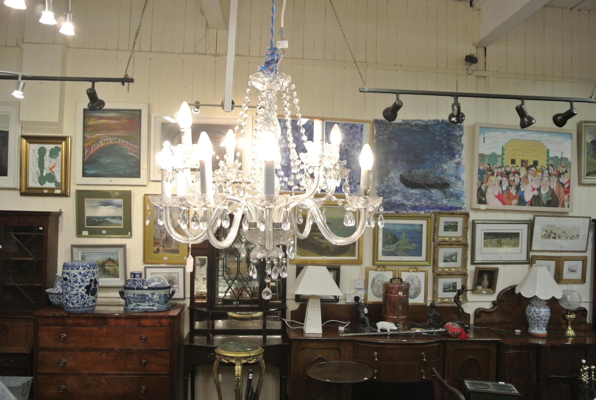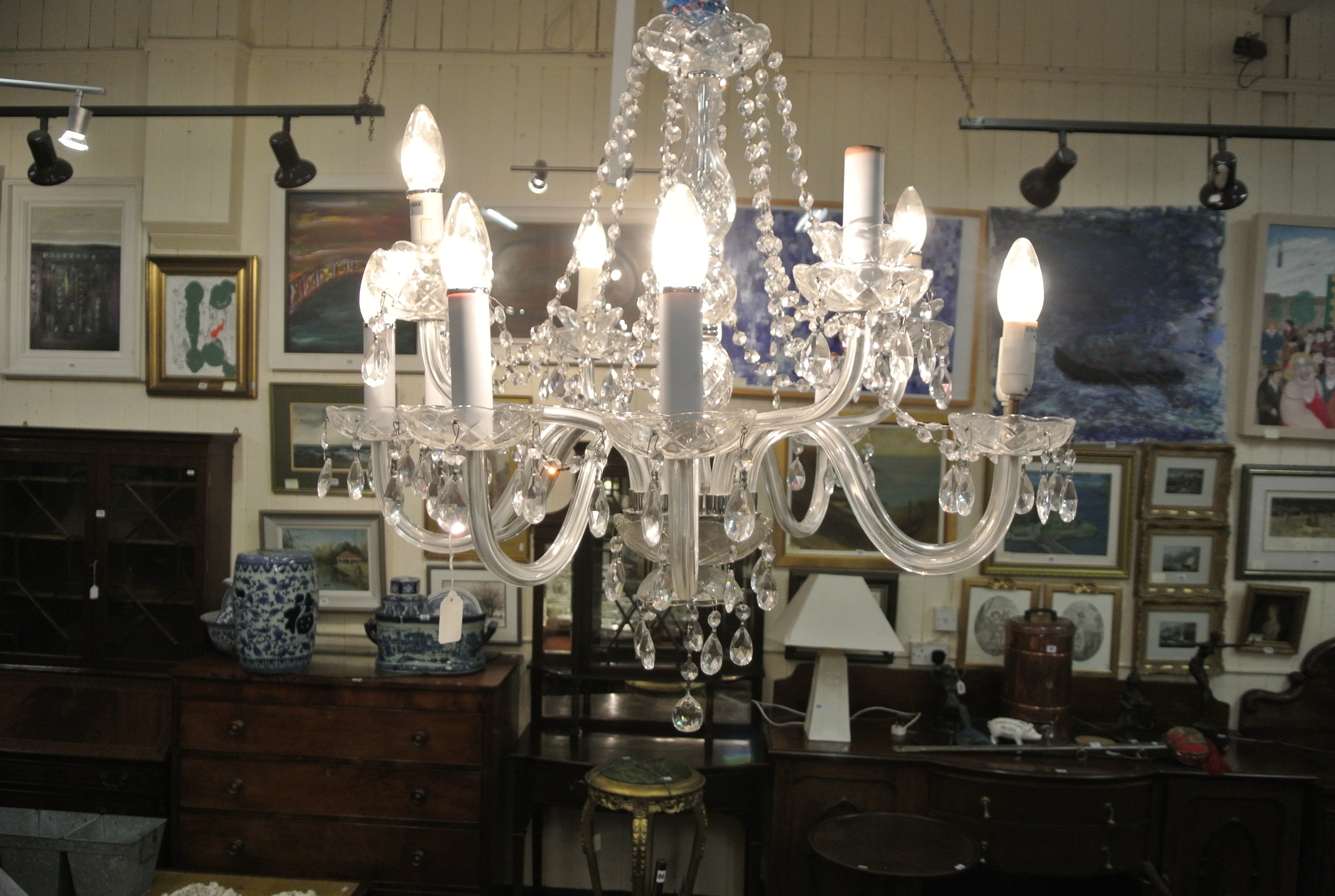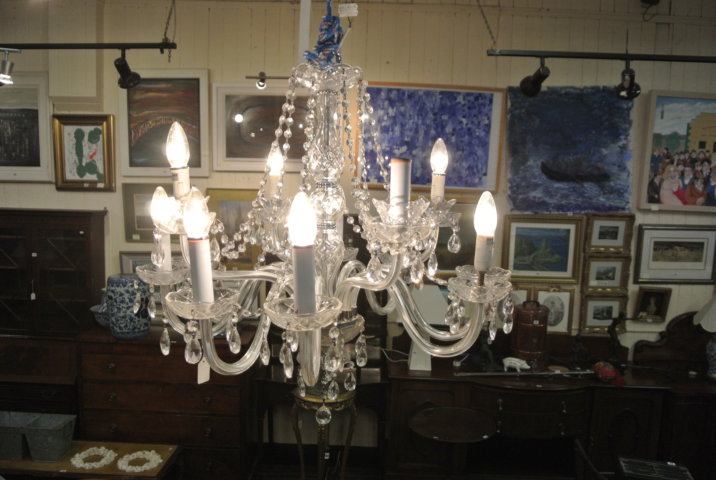 French style 5 branch glass chandelier with shaped arms and sconces