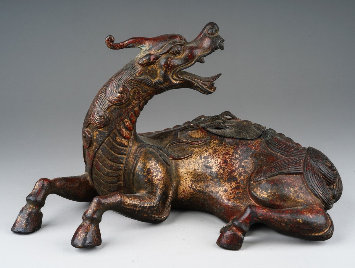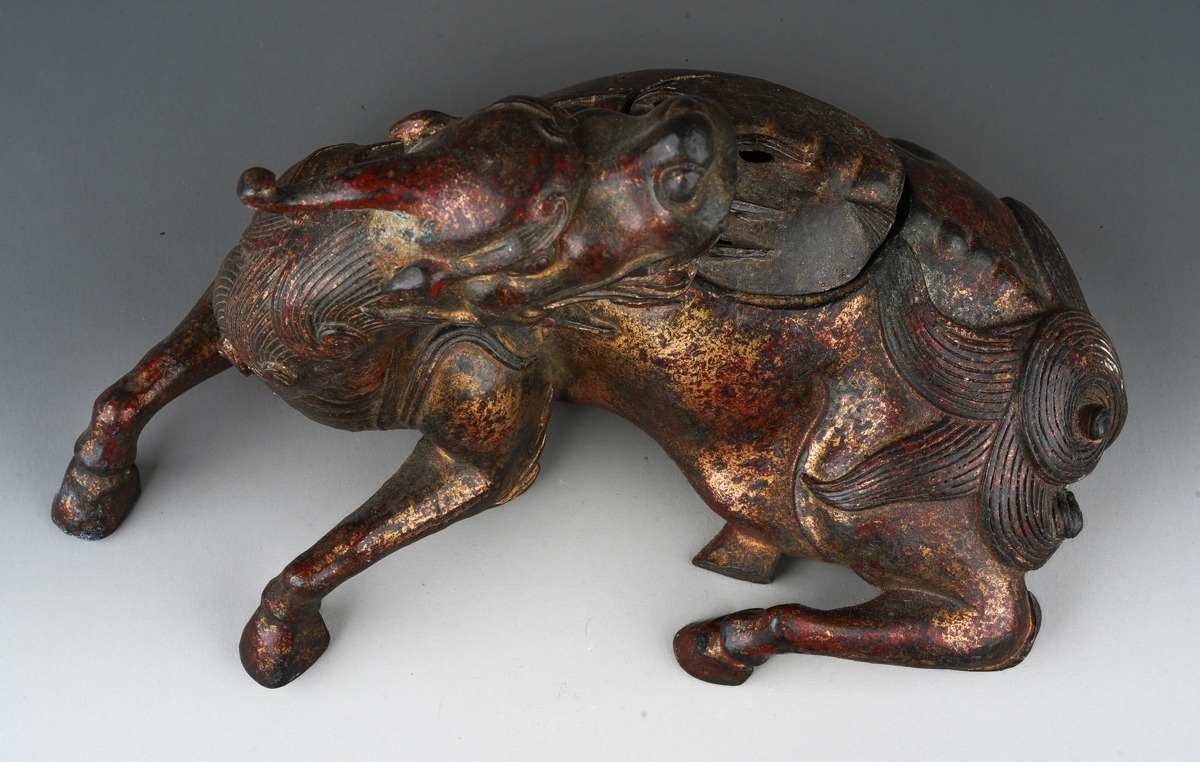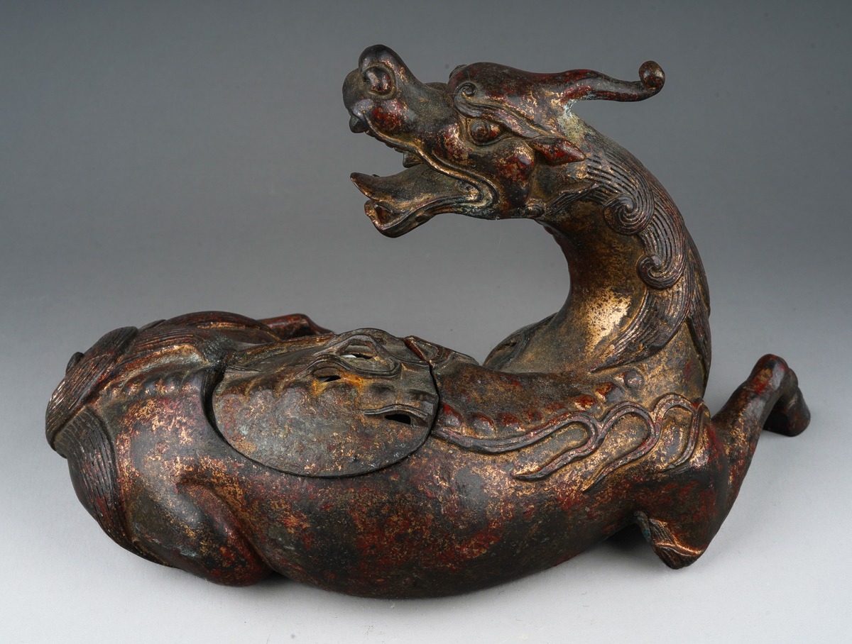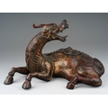 A Japanese cast bronze koro in the form of a reclining Kirin...