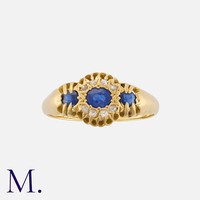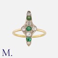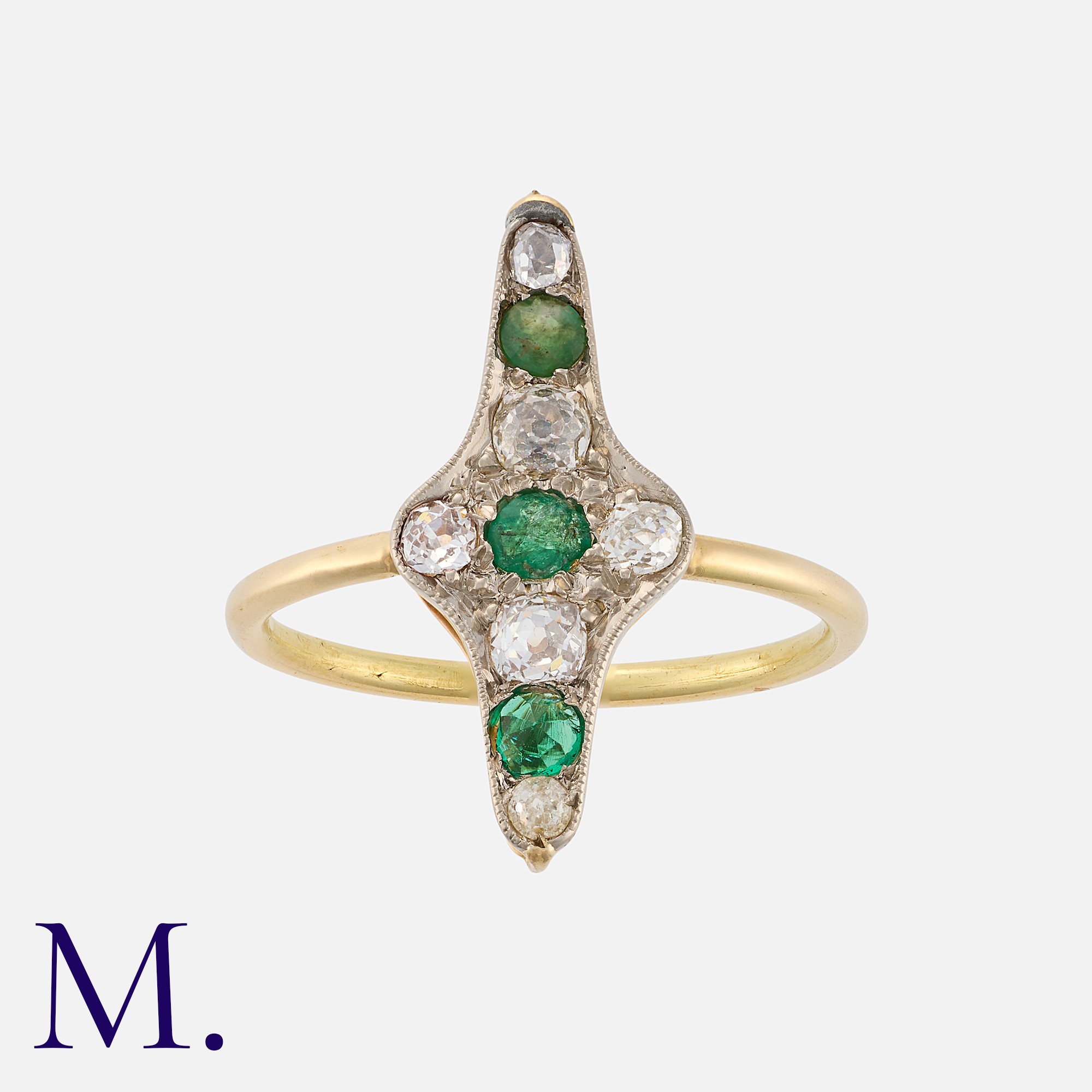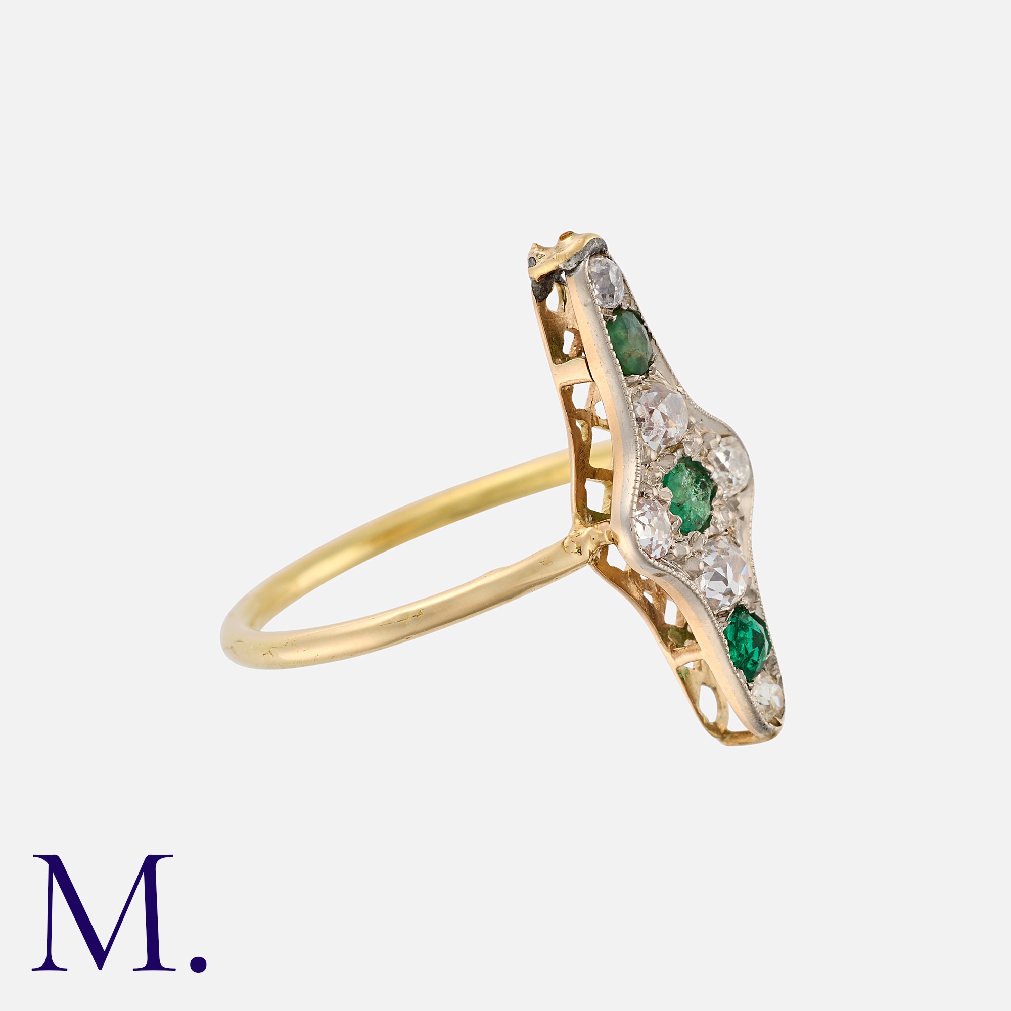 An Emerald and Diamond Ring in yellow gold, the navette form set with old cut diamonds totalling approximately 0.35 carats and three round cut emeralds. Unmarked, tests indicate 18 carat gold.