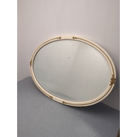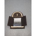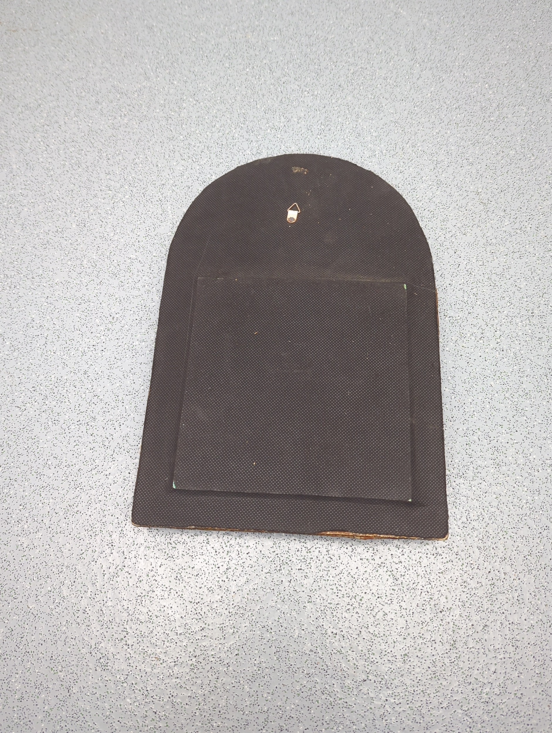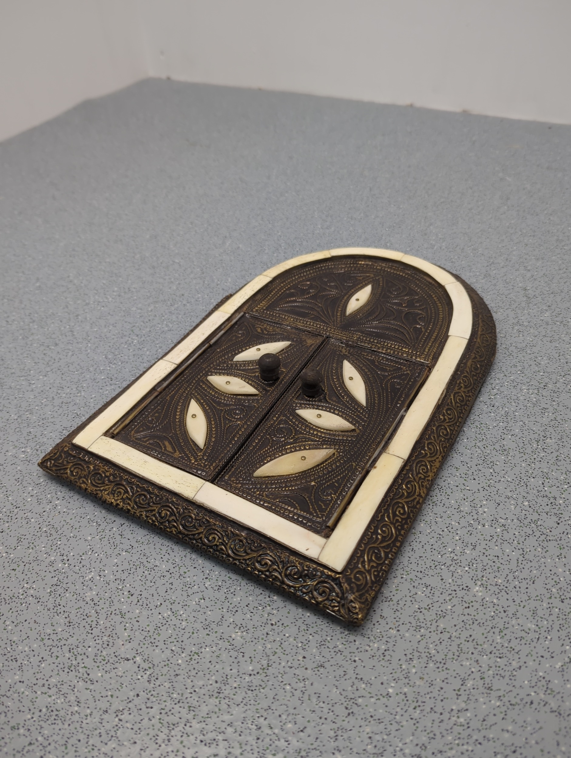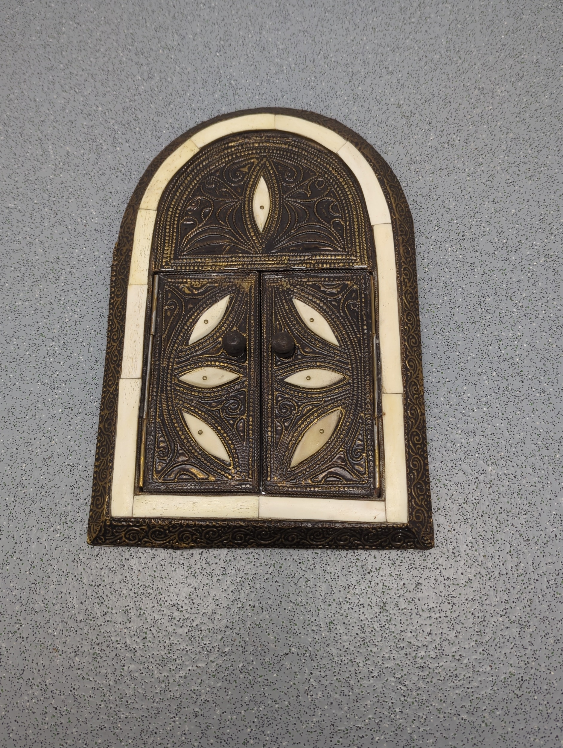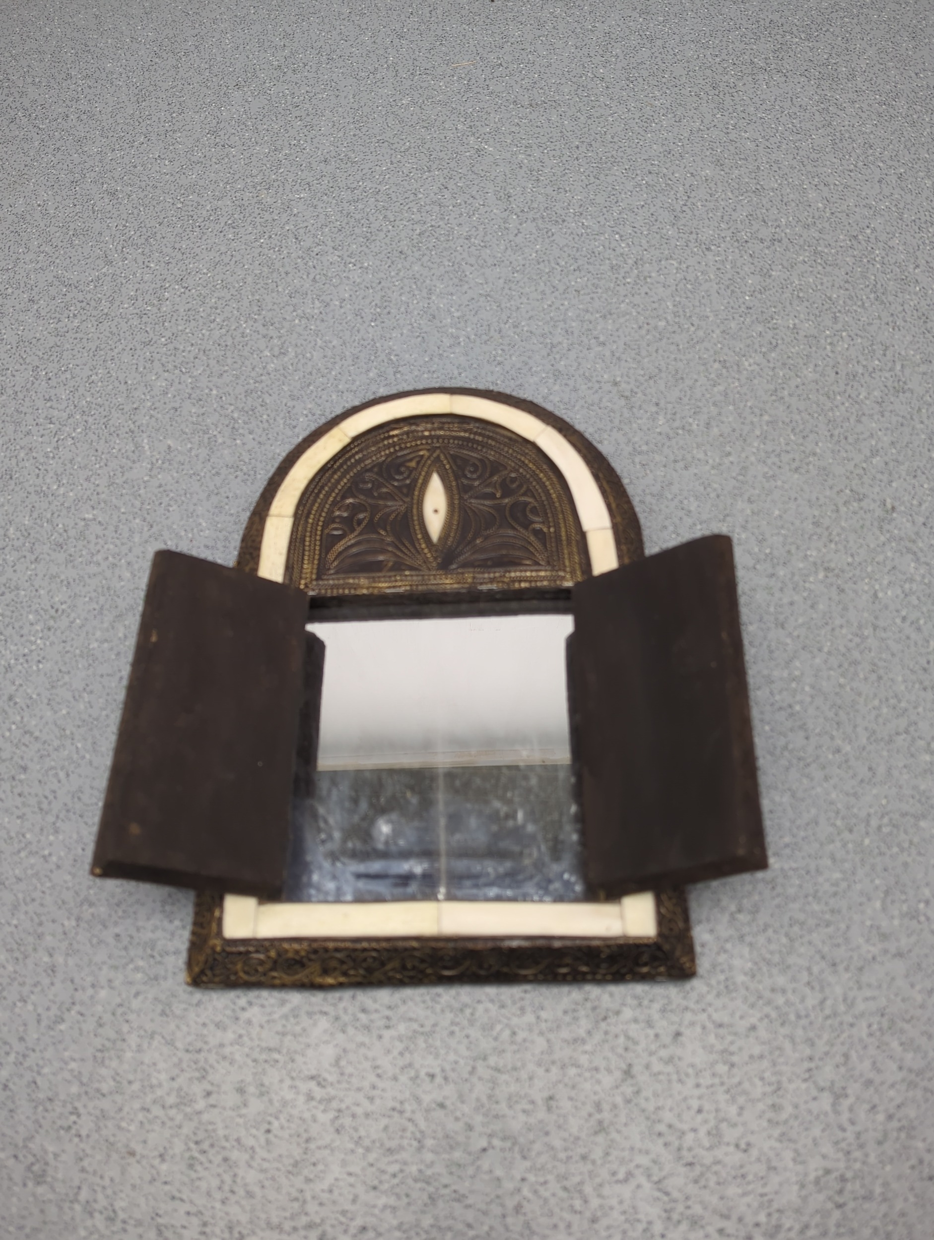 This is an intricately designed decorative mirror featuring carved doors with detailed patterns and contrasting inlay materials. The frame is arch-shaped, housing two small hinged doors that reveal the mirror when opened. The decorative details suggest artistic craftsmanship, making it a standout piece for any interior décor.