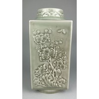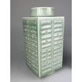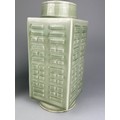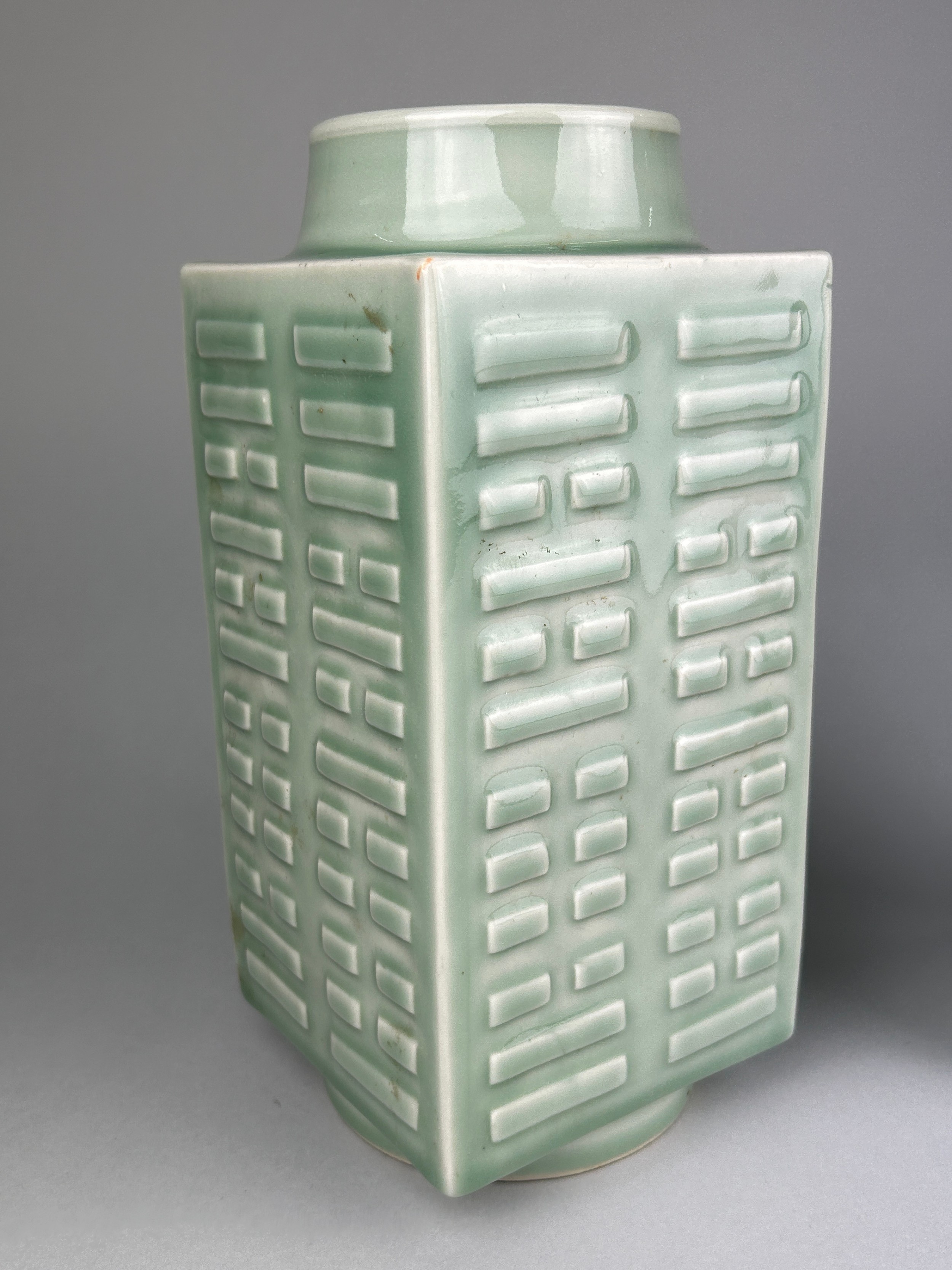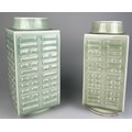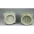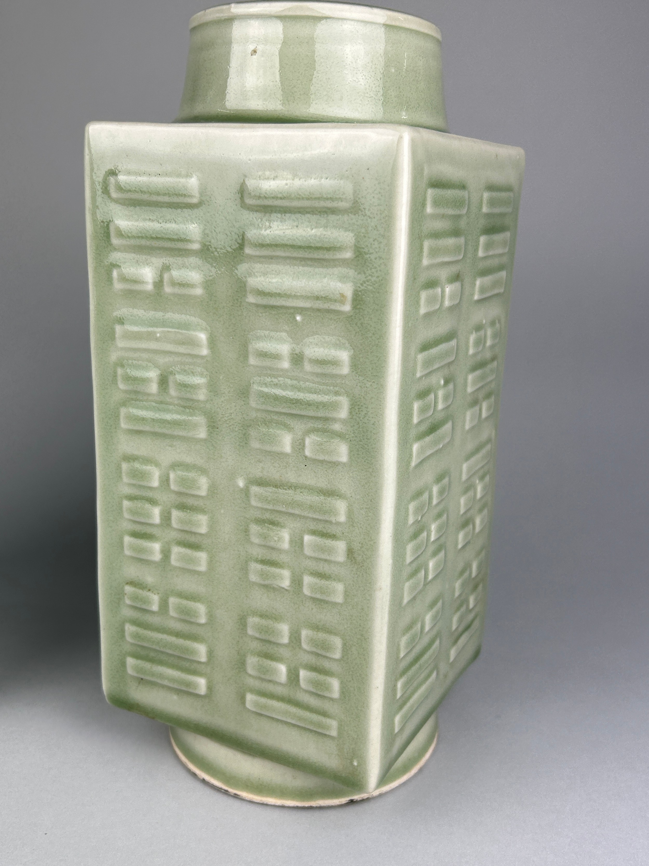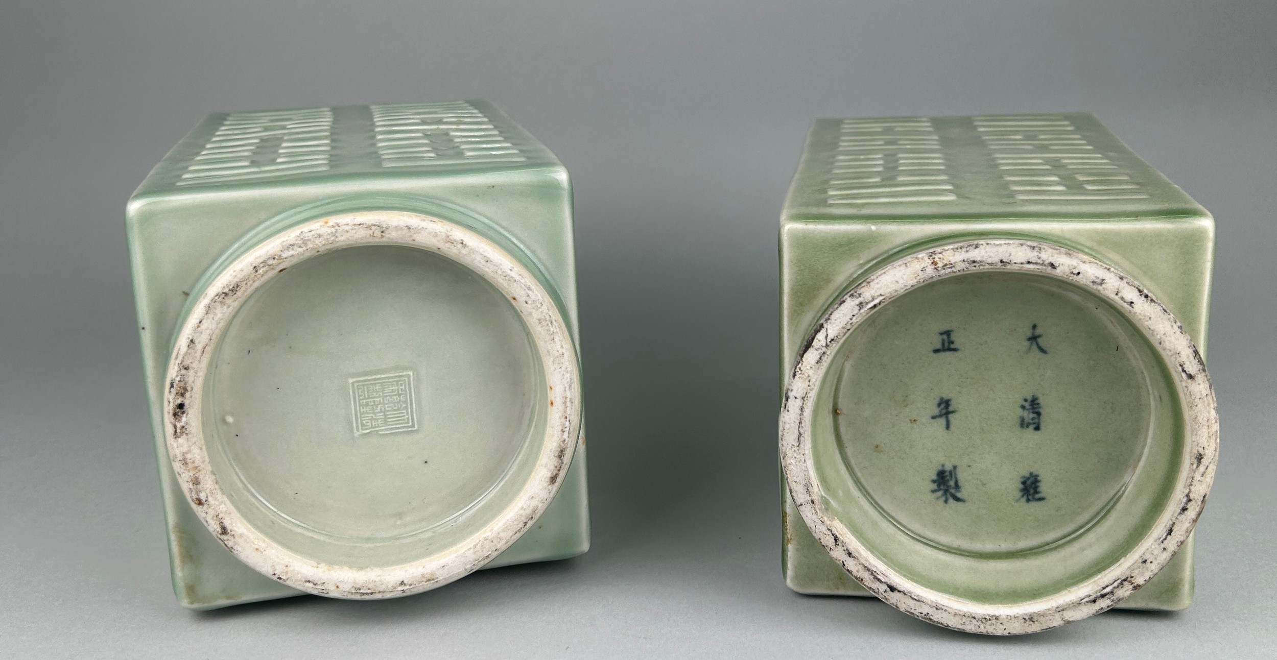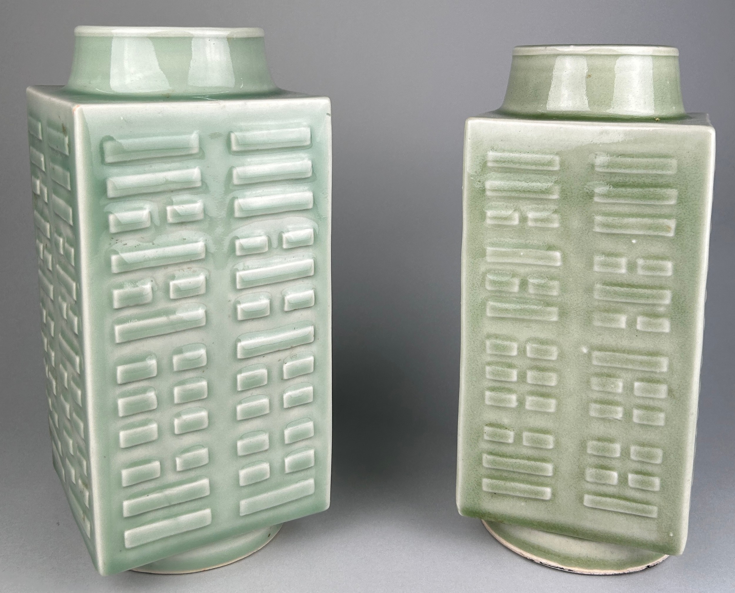 A NEAR PAIR OF CHINESE CELADON VASES OF CONG FORM, each with apocryphal six-character marks for the Yongzheng emperor, but early 20th Century, 29cm h each (2)