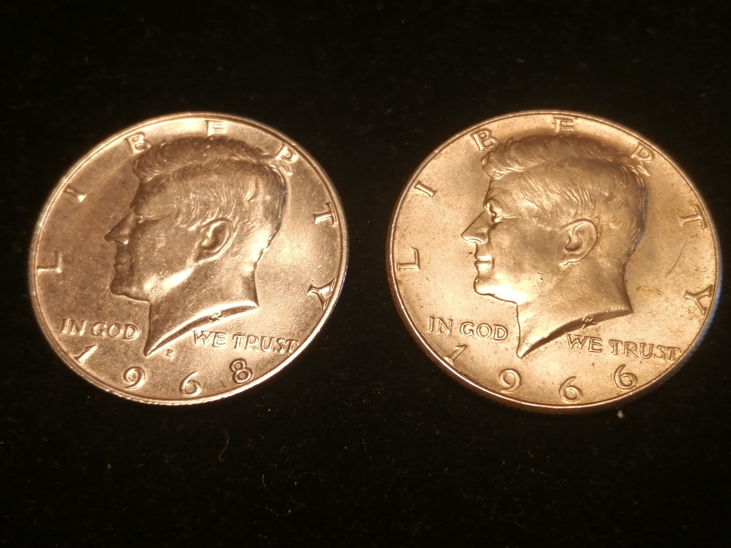 2 x USA silver half dollars 1966 and 1968 (total weight is 23 grams of 0.4 silver)