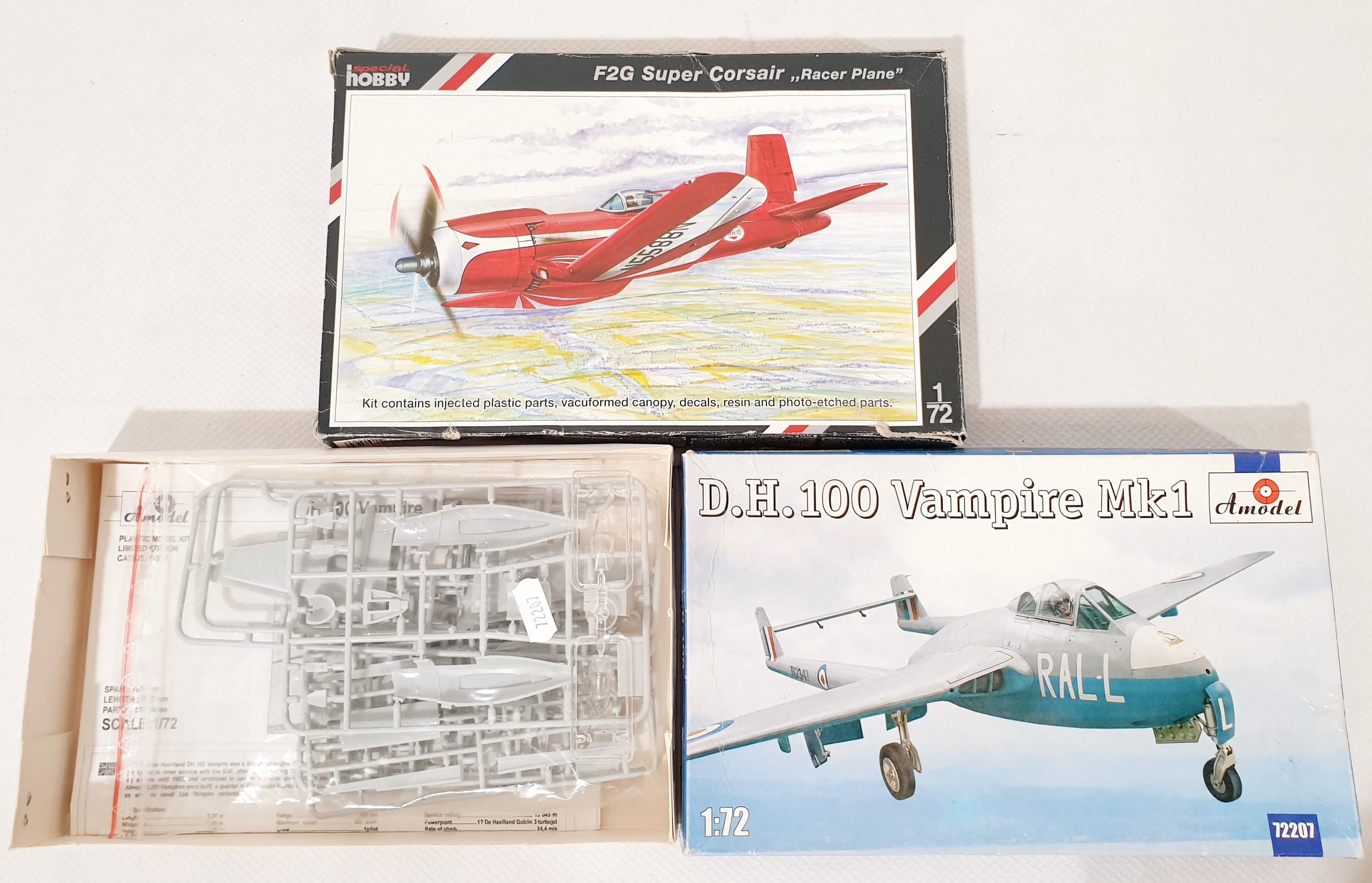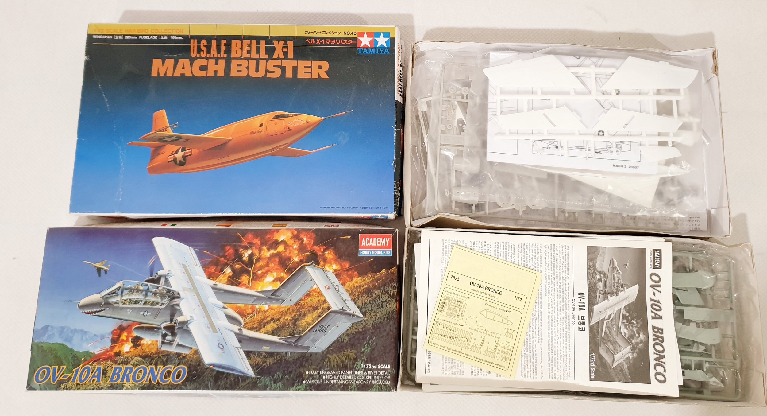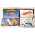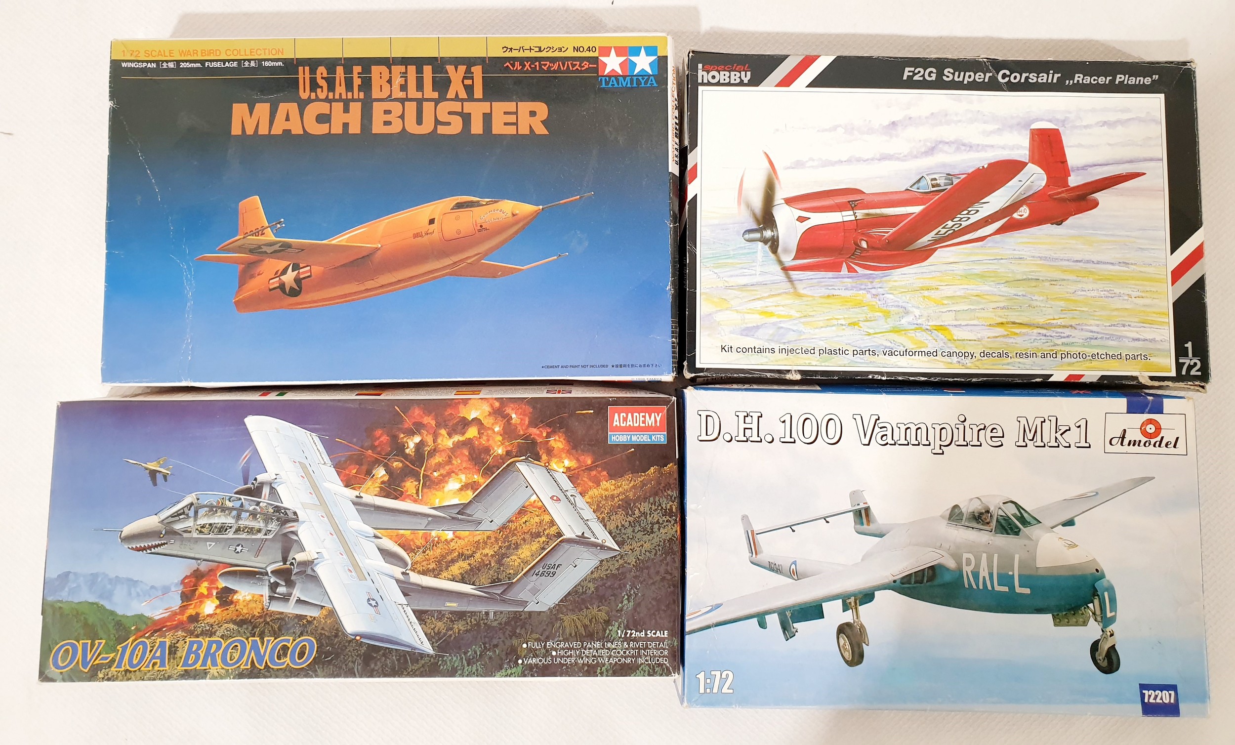 Four 1;48 scale model plane kits 'D.H.100 Vampire MK1', 'OV-10A Bronco', 'F2G Super Corsair, Racer Plane' & a 'U.S.A.F Bell X-1 Mach Buster'.