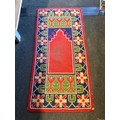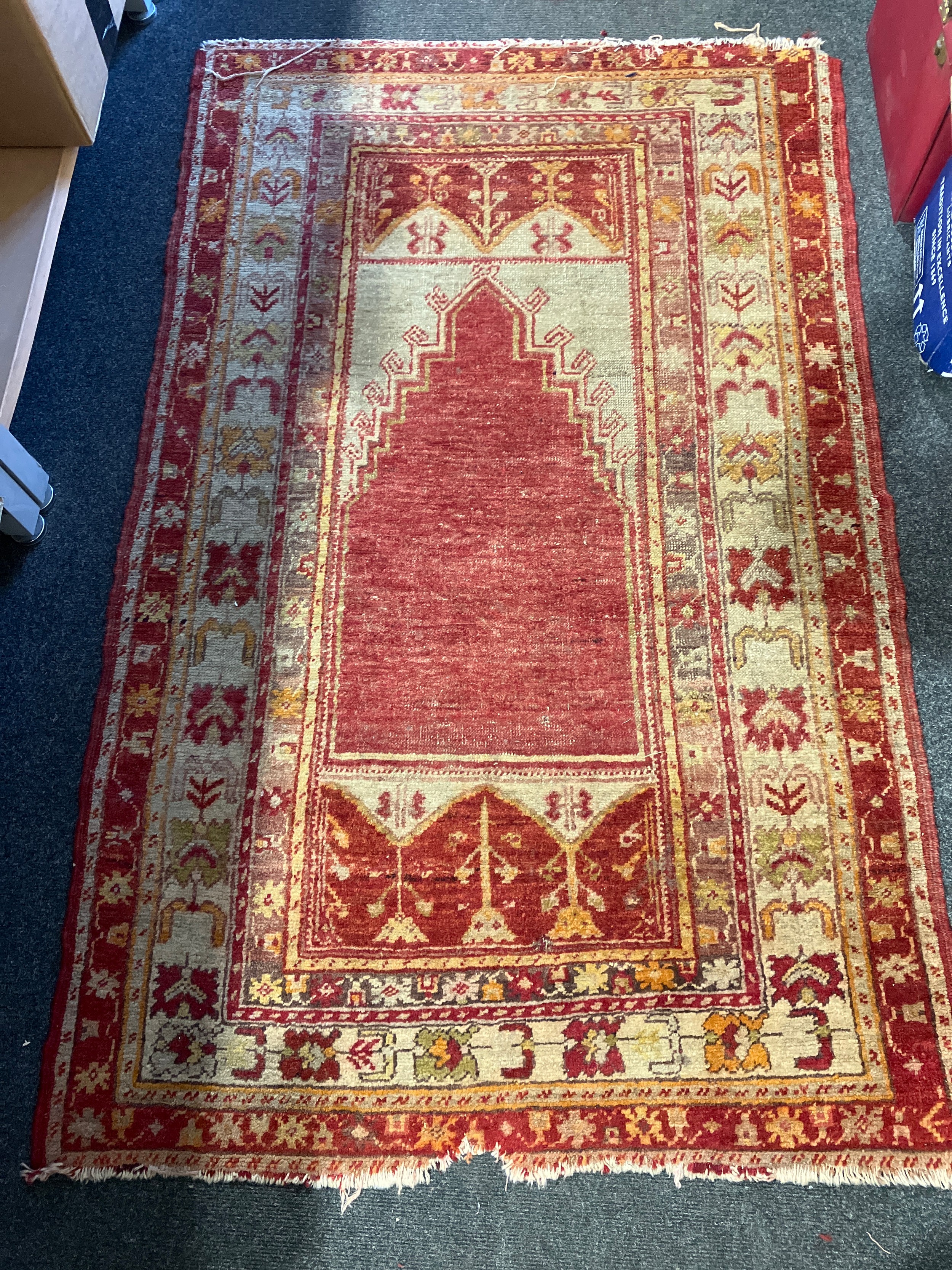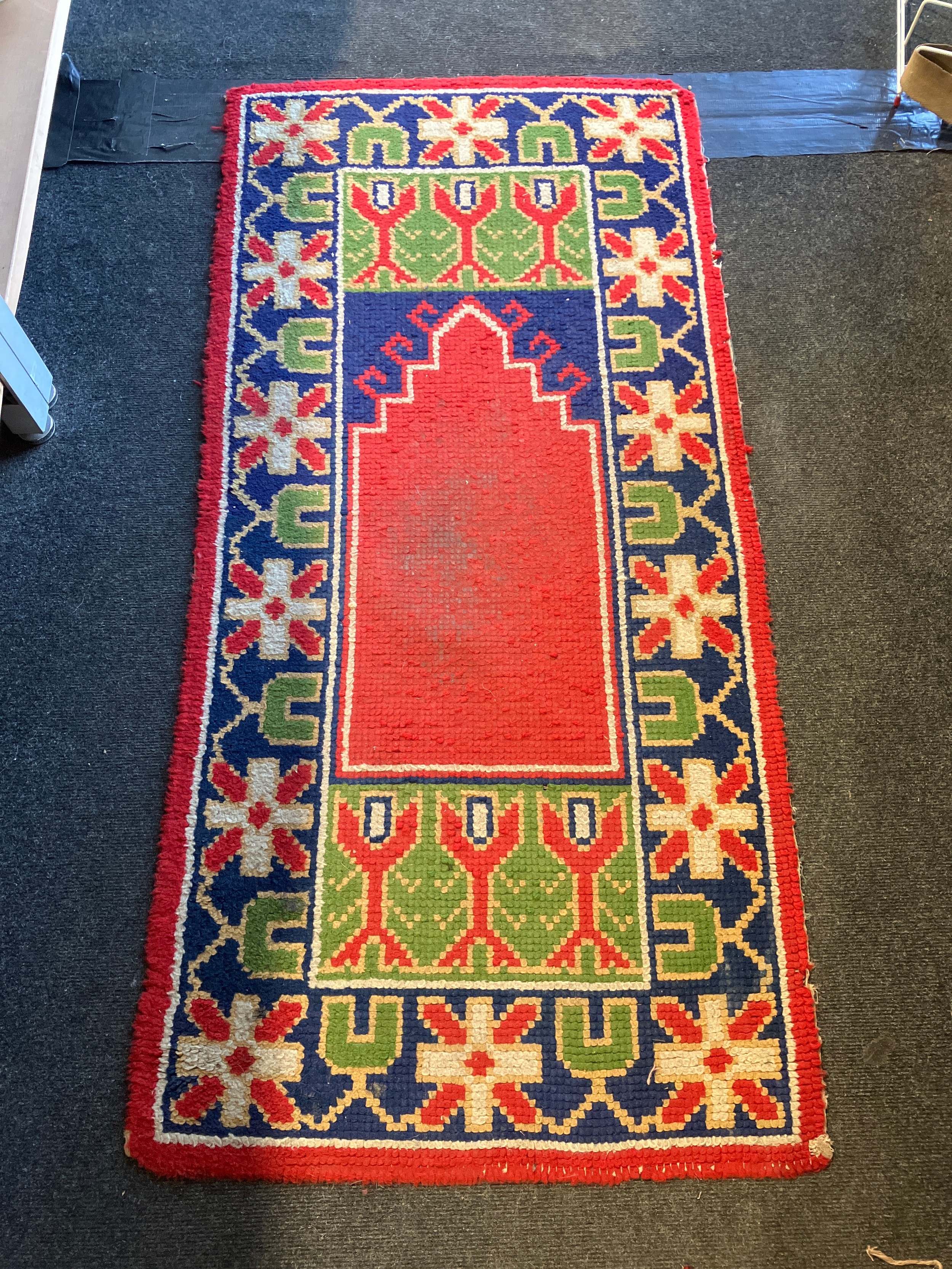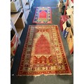 Two Eastern wool rugs, one red ground, red, navy and green motif borders, 140cm x 68cm, the other orange ground, multiple borders, 158cm x 97cm. Both worn