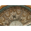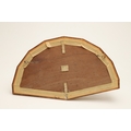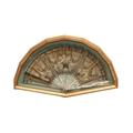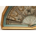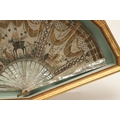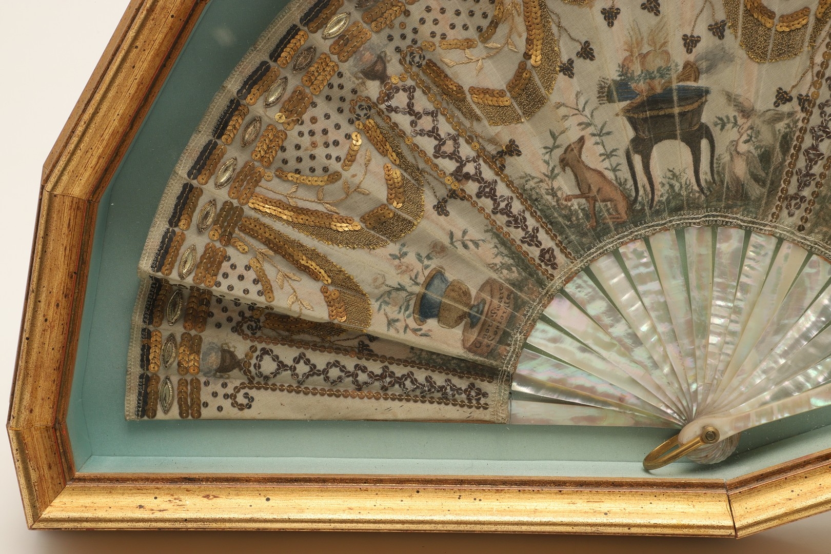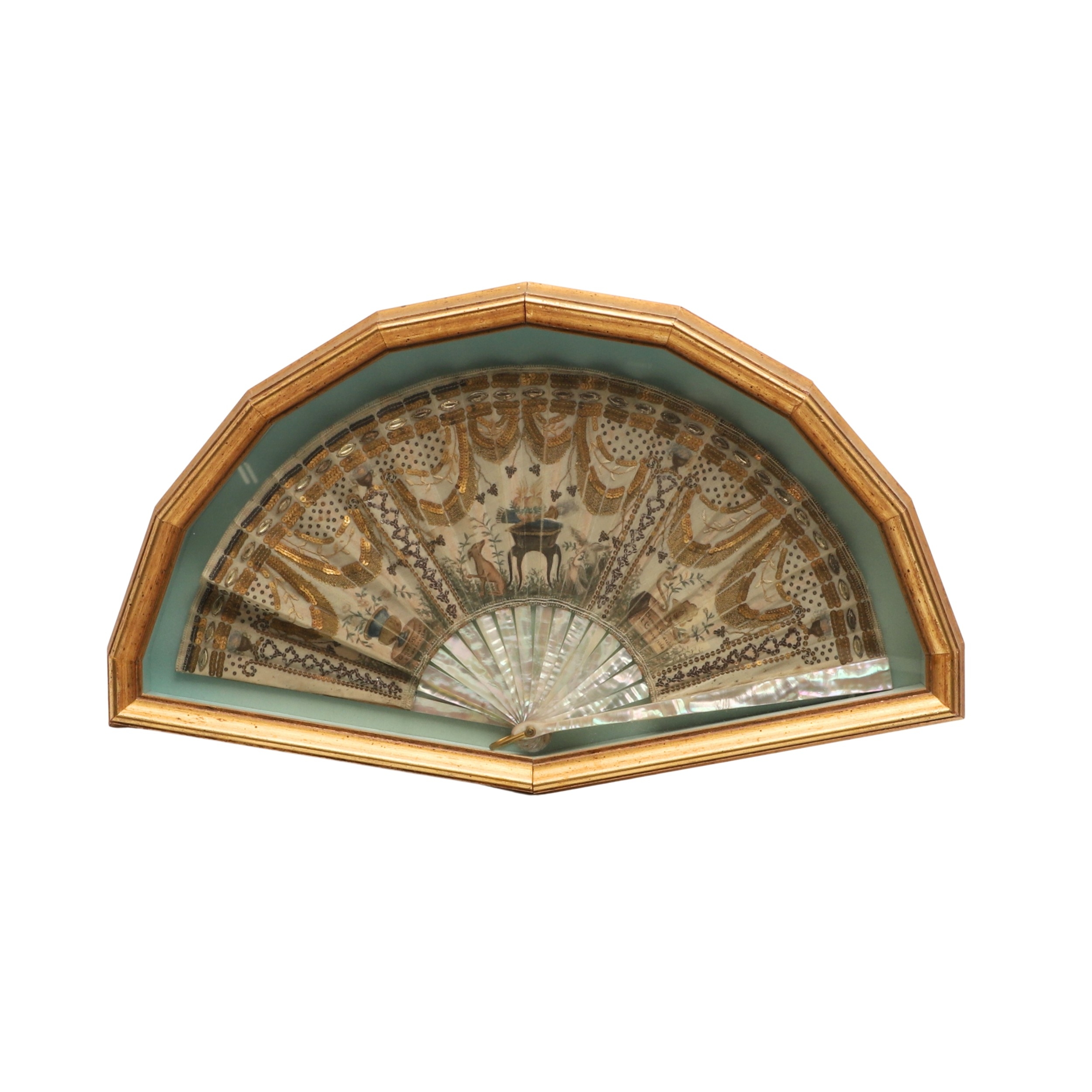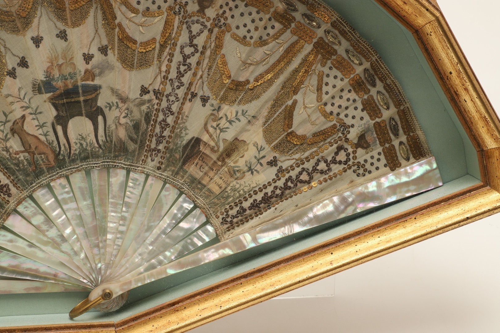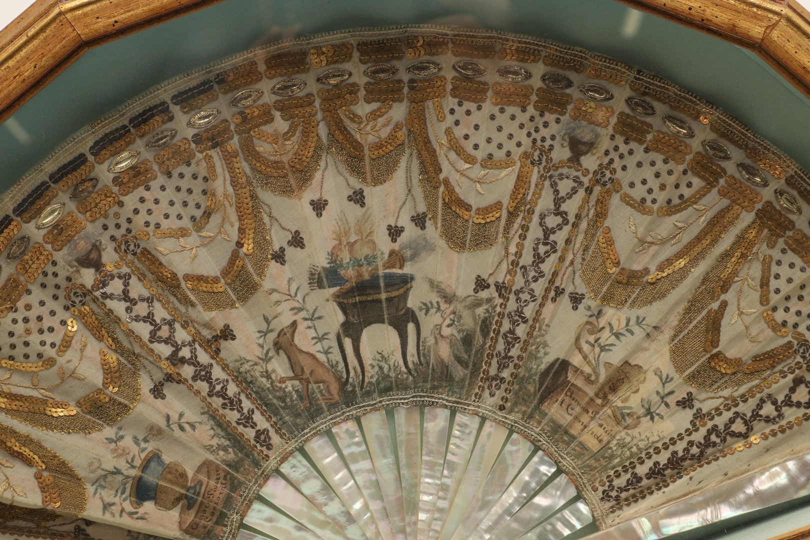 A REGENCY MOTHER OF PEARL AND SEQUINNED FAN. painted with Classical decoration of urns, doves, a hound and winged hearts to a garden setting, embroidered with sequins, gold thread and metal mounts, within a glazed and gilt framed case, 27cm x 48cm.