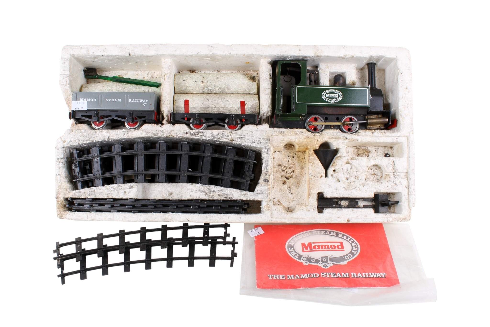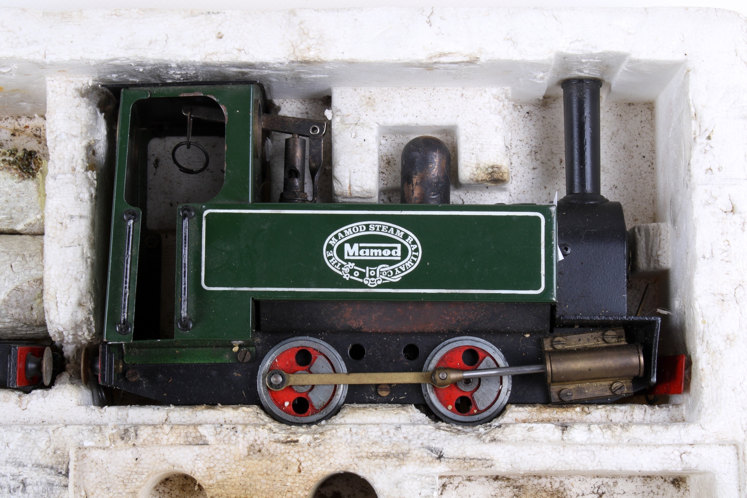 A vintage Mamod live steam model train set and part accessories. Including a tank engine SL1 and two wagons, etc.