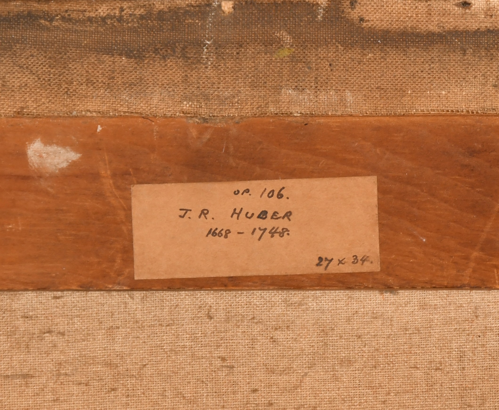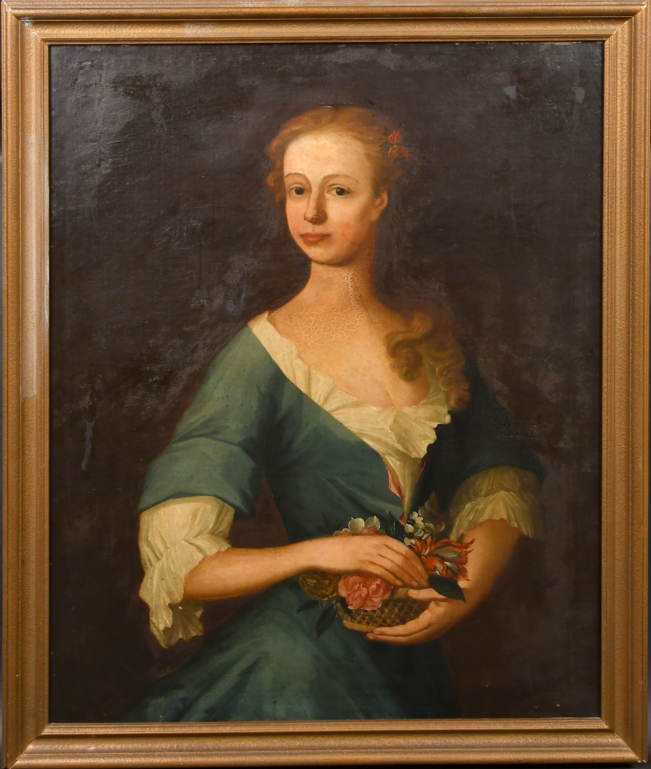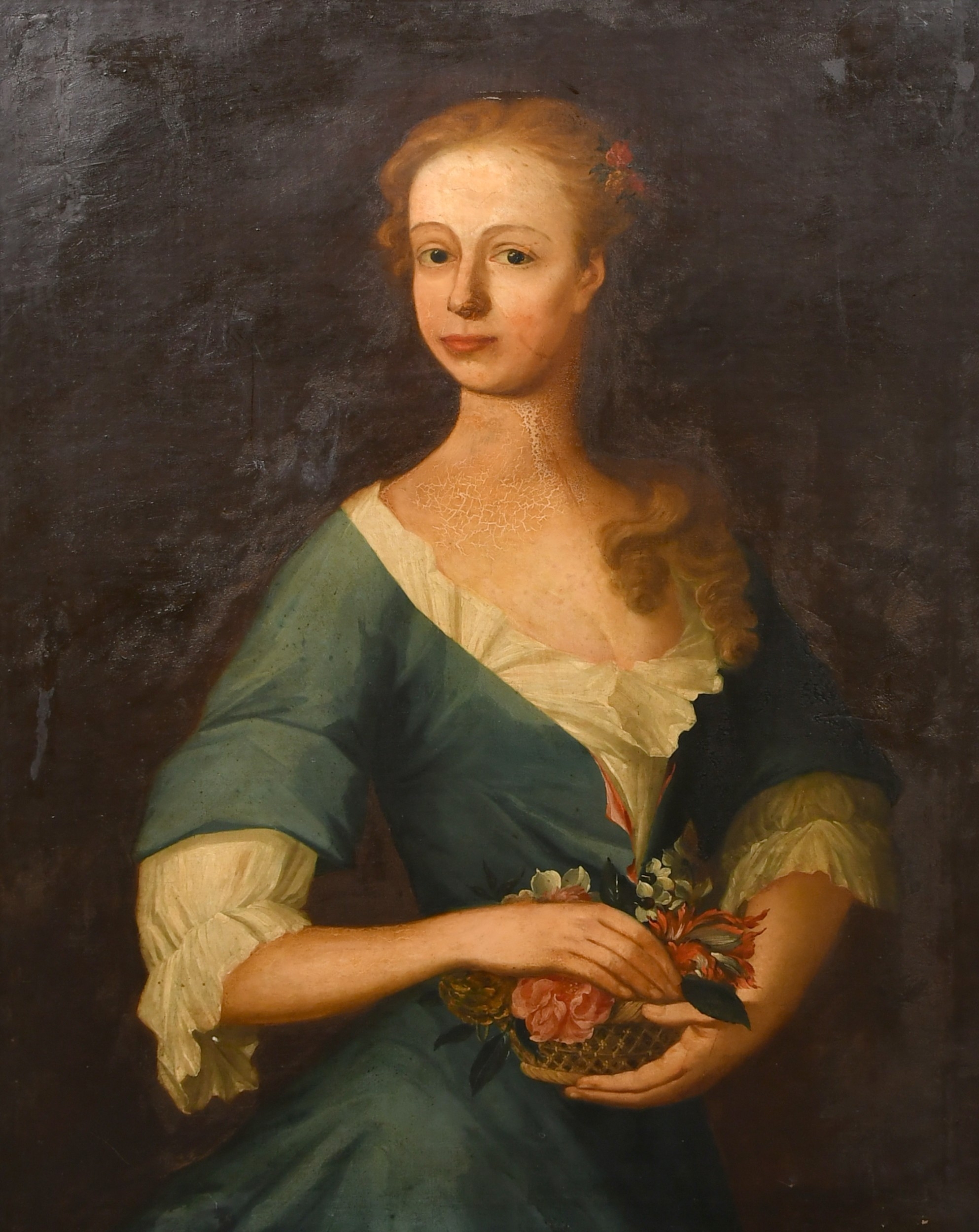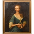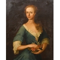 Manner of Johann Rudolf Huber (1668-1748) Swiss. Portrait of a Lady holding a basket of flowers, Oil on canvas, 33.5" x 27" (85.1 x 68.6cm)