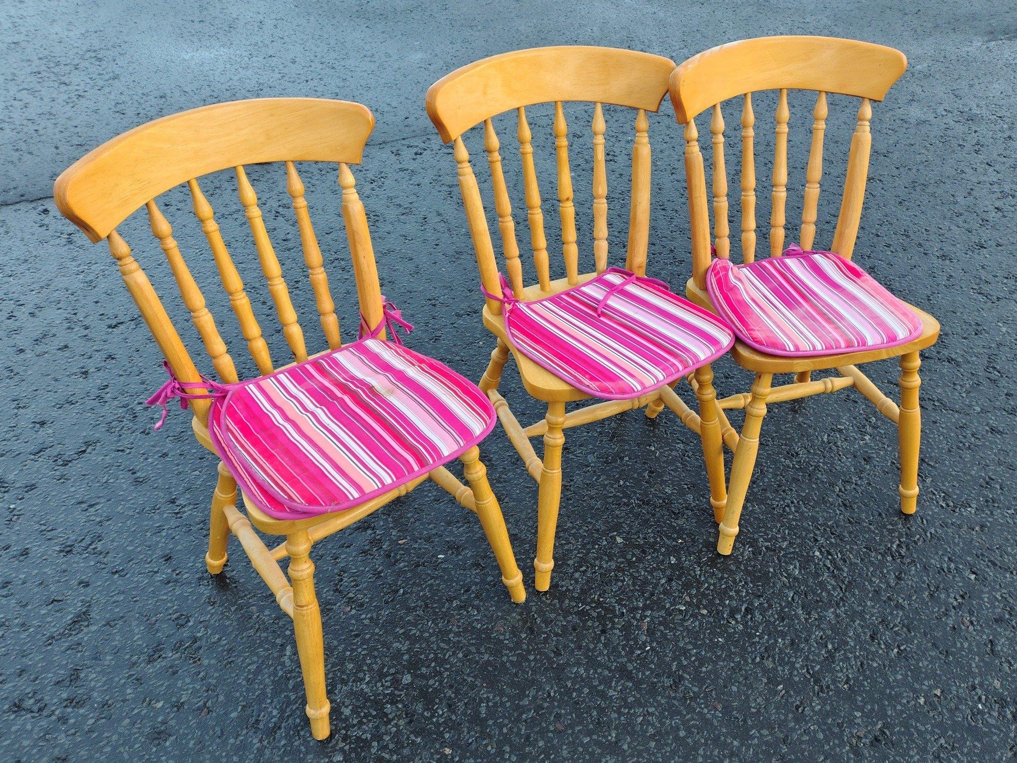 Three matching wooden kitchen chairs with pads.