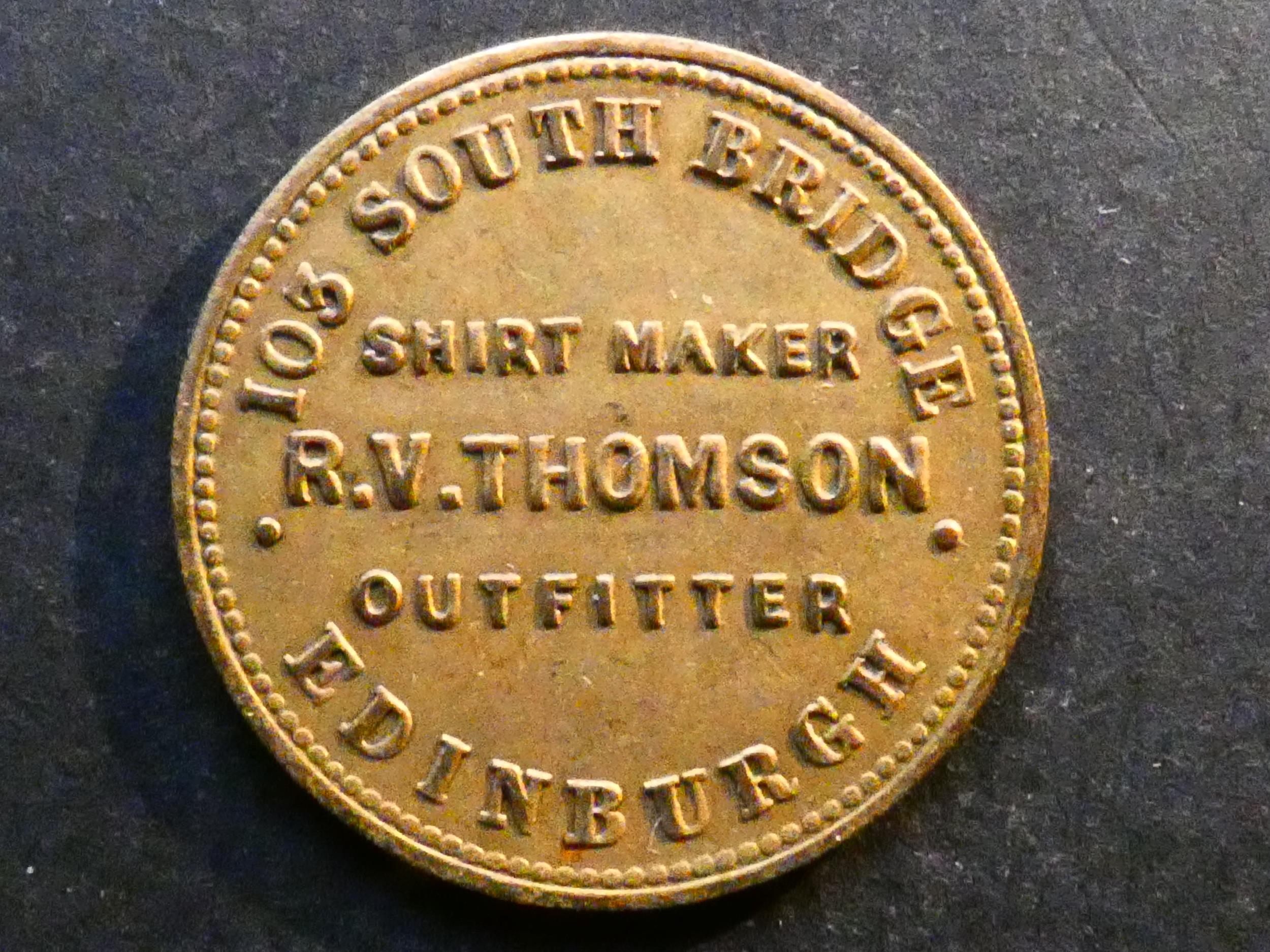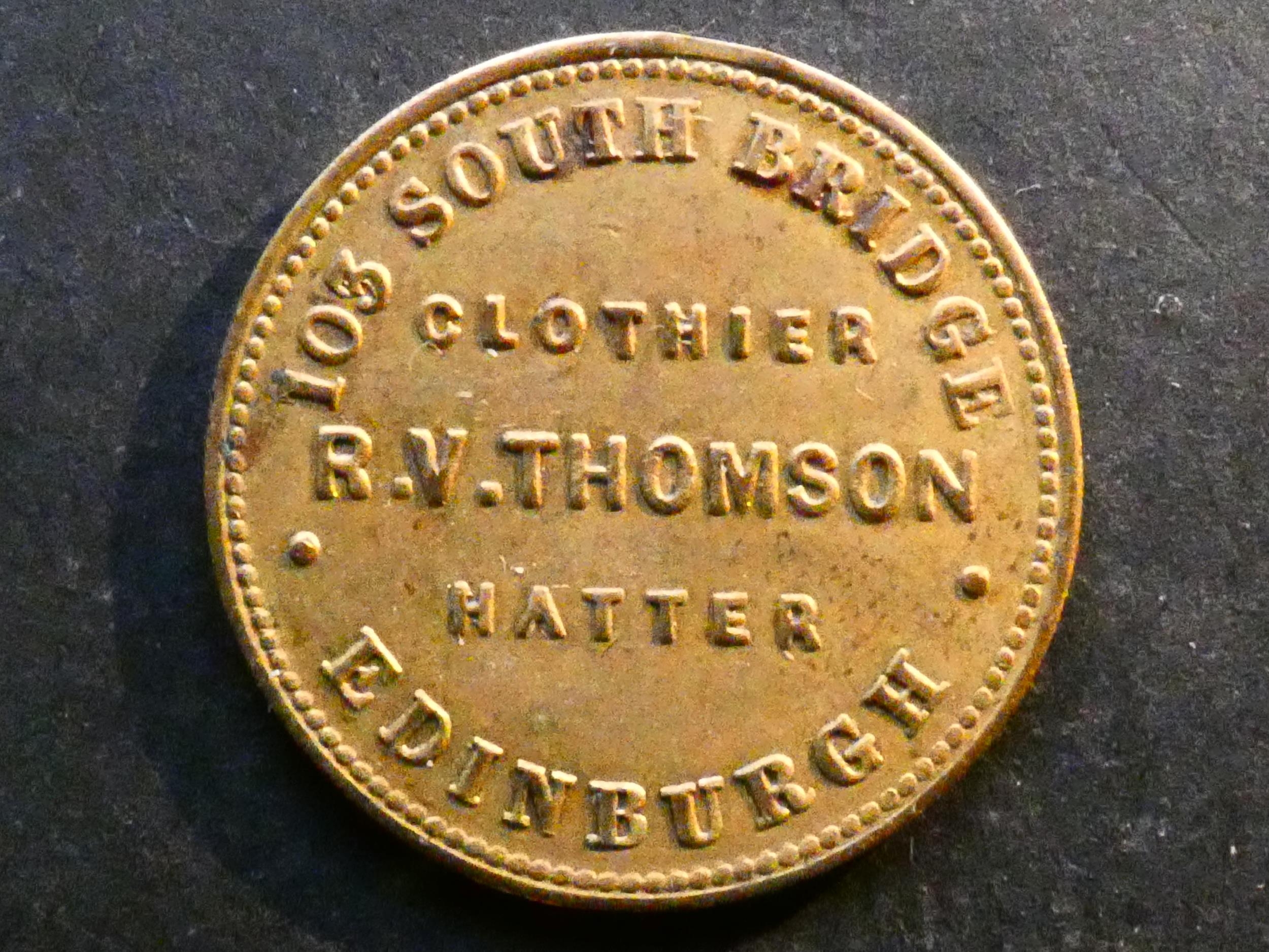 TOKENS - 19th CENTURY. Scotland, Lothian, Farthing, obverse; 103 SOUTH BRIDGE EDINBURGH, CLOTHIER R.V. THOMSON HATTER, Bell-7261, EF