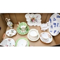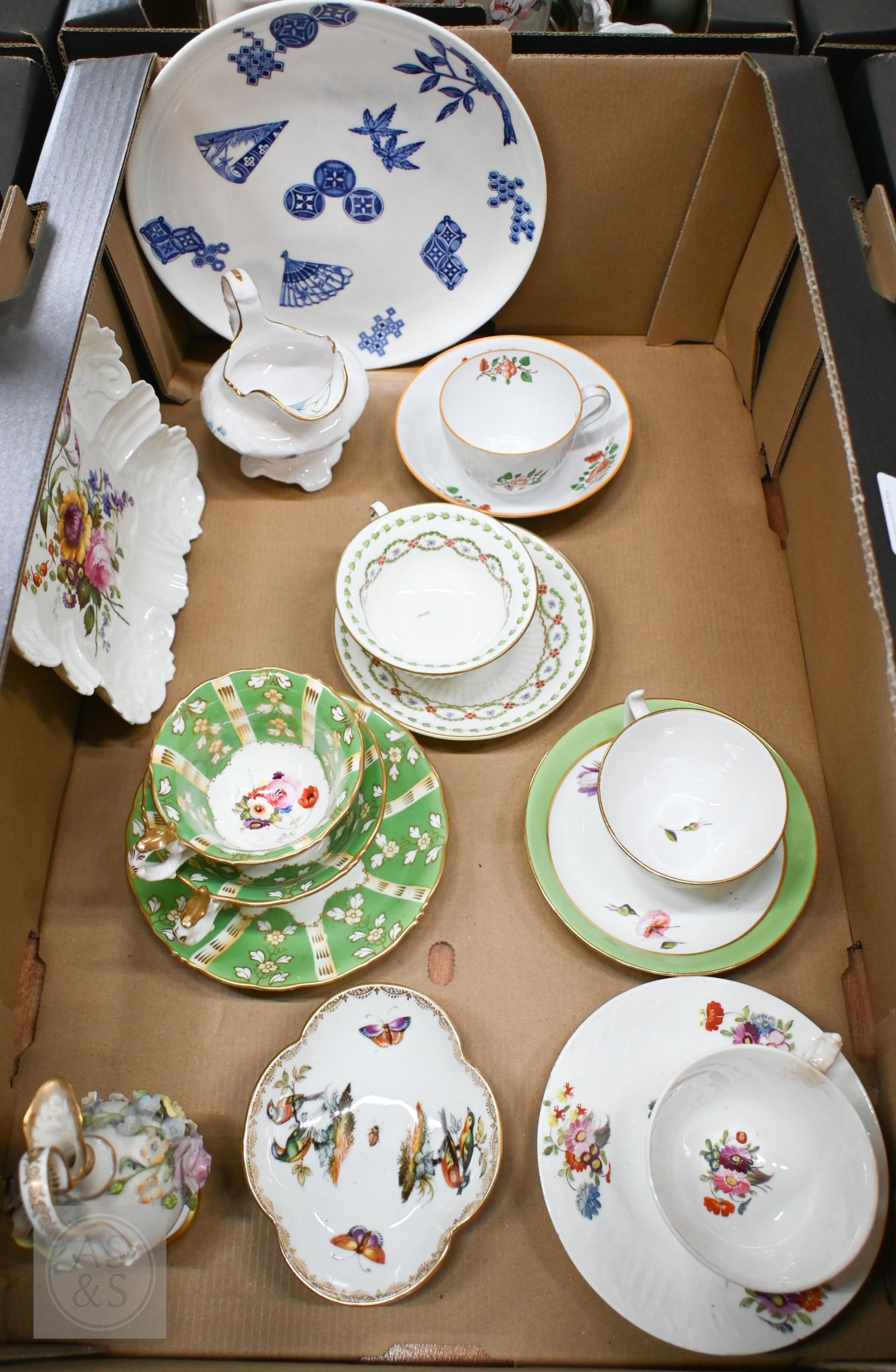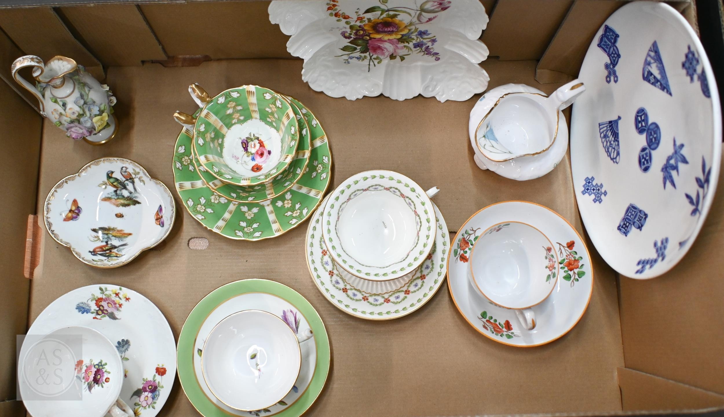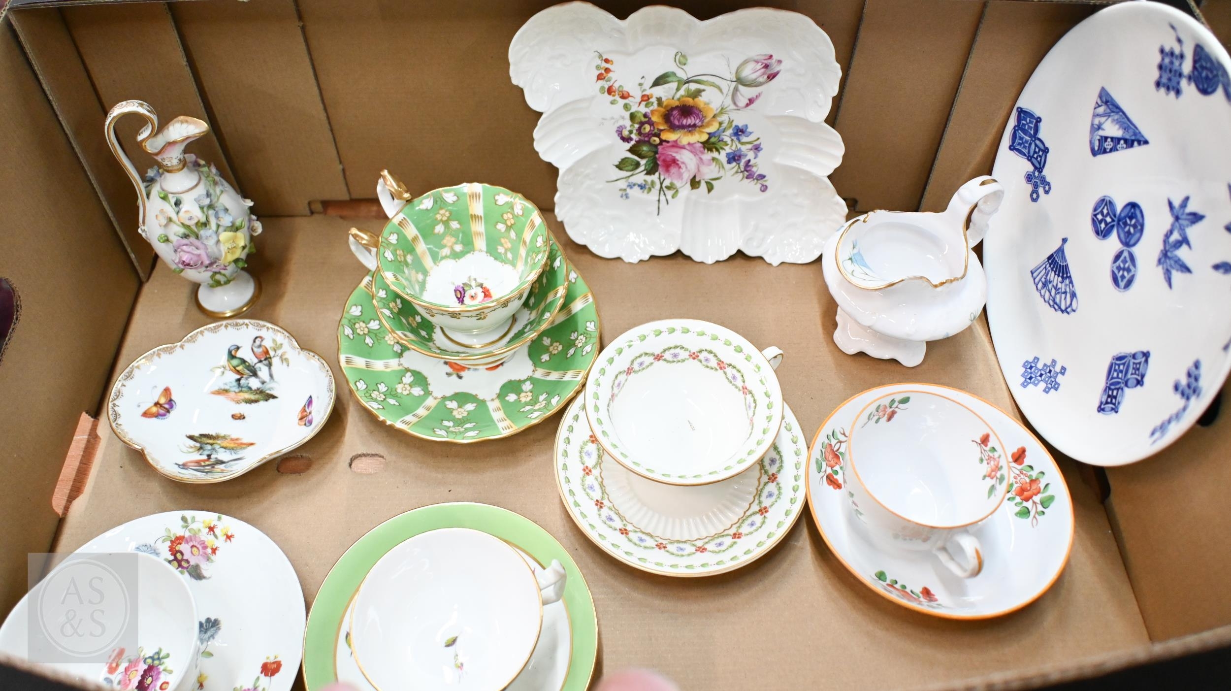 A 19th century German (possibly Berlin) porcelain miniature ewer encrusted with flowers, 15 cm high to/w a Meissen quatrefoil dish painted with birds and insects, five Victorian floral-painted china cups and saucers, a Collingwood Bros floral-painted dish, a Royal Worcester blue and white plate printed with Japanese motifs and a Copeland milk jug (box)