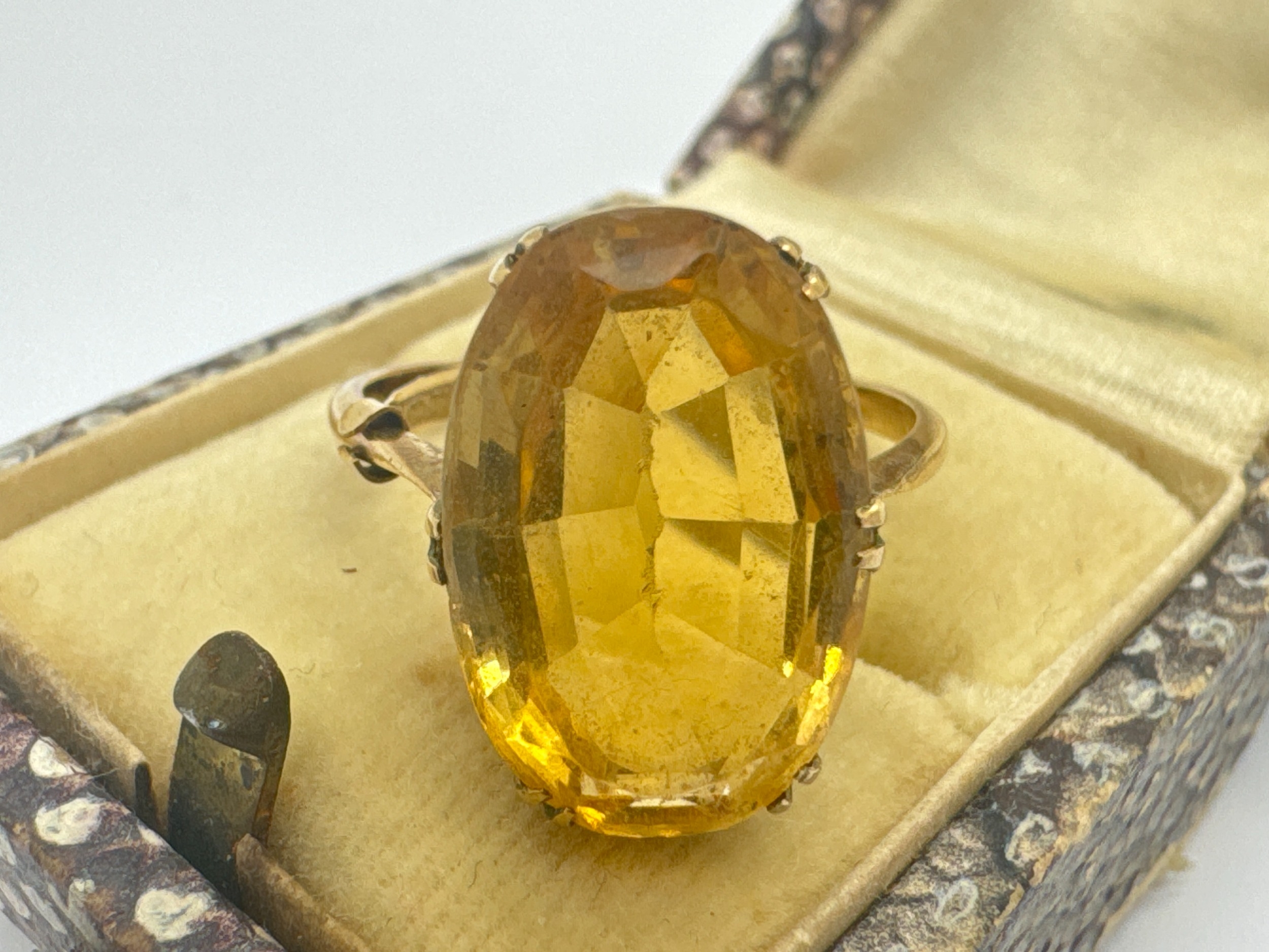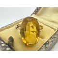 A Vintage Single Stone Dress Ring, the oval stone six claw set between slim tapered shoulders (band indistinctly stamped), with a ring spacer stamped "9ct" (finger size O), in a vintage ring box.