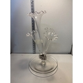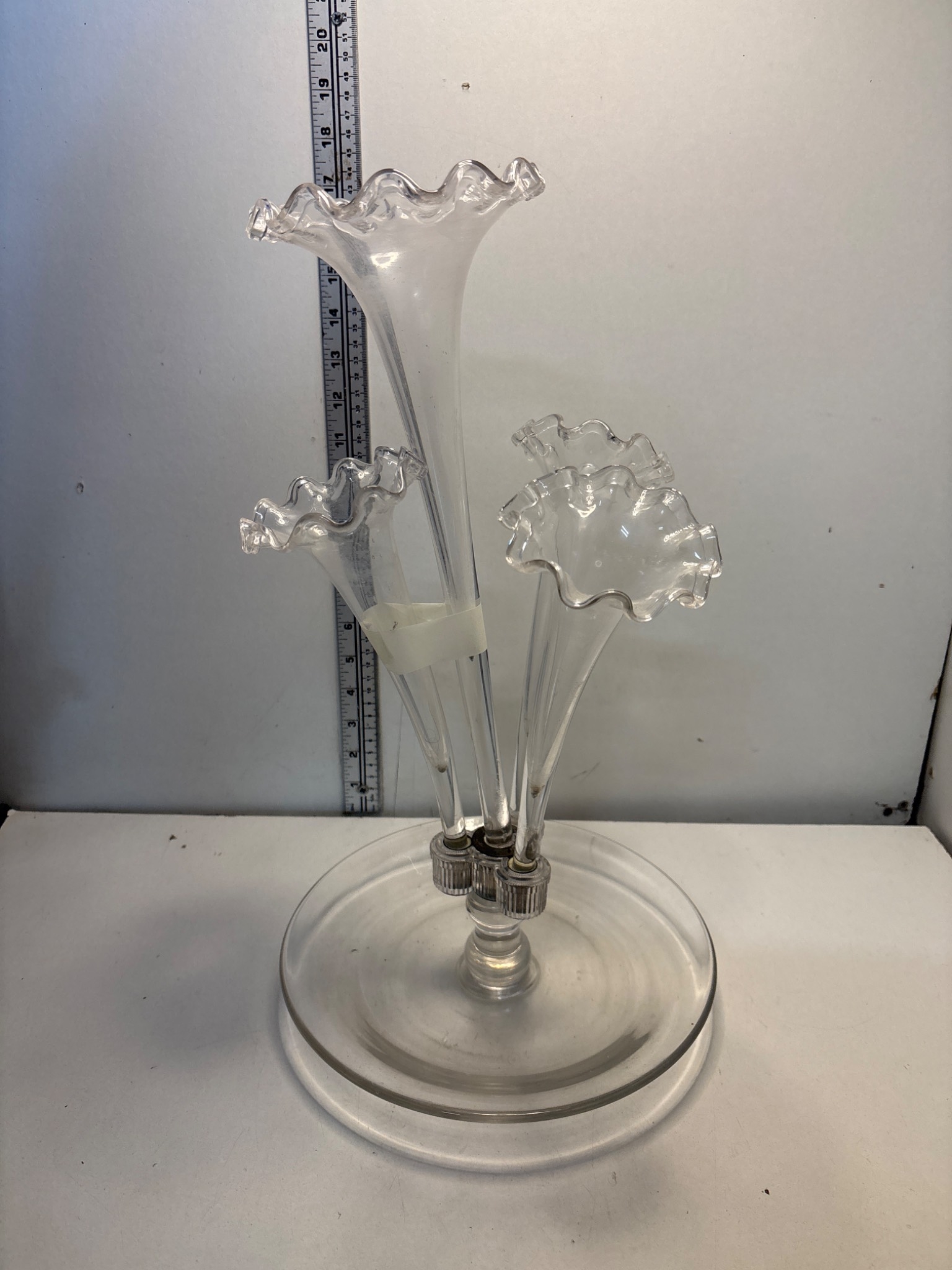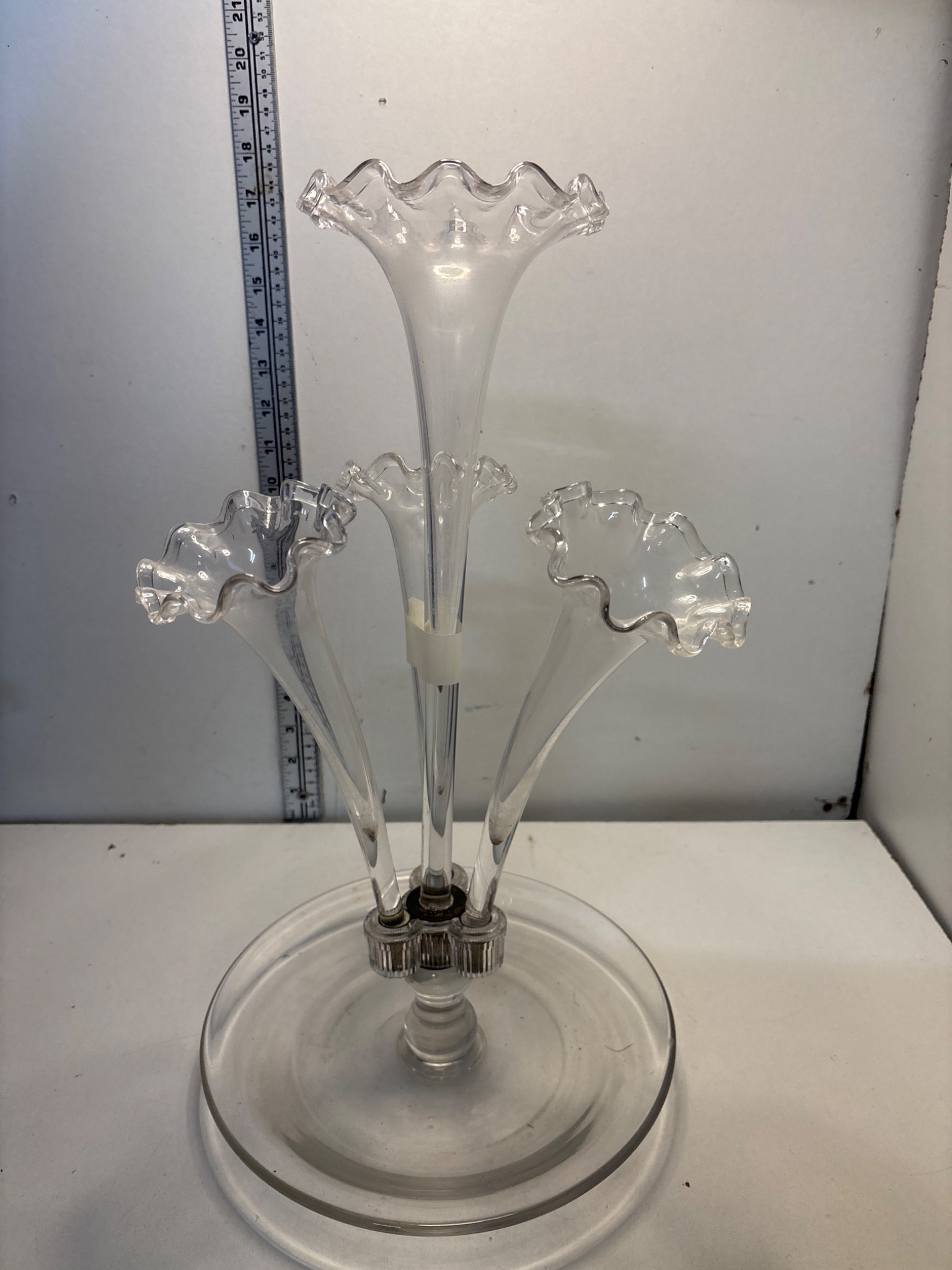 Clear glass epergne with three ruffled edge trumpets set on a round base not postable.