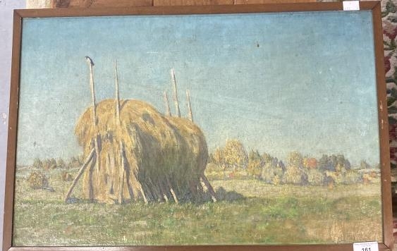 Follower of Abram Arkhipov, oil on canvas board, landscape with a haystack in a field, indistinctly signed and dated 1915 lower right. 15ins. x 23ins.