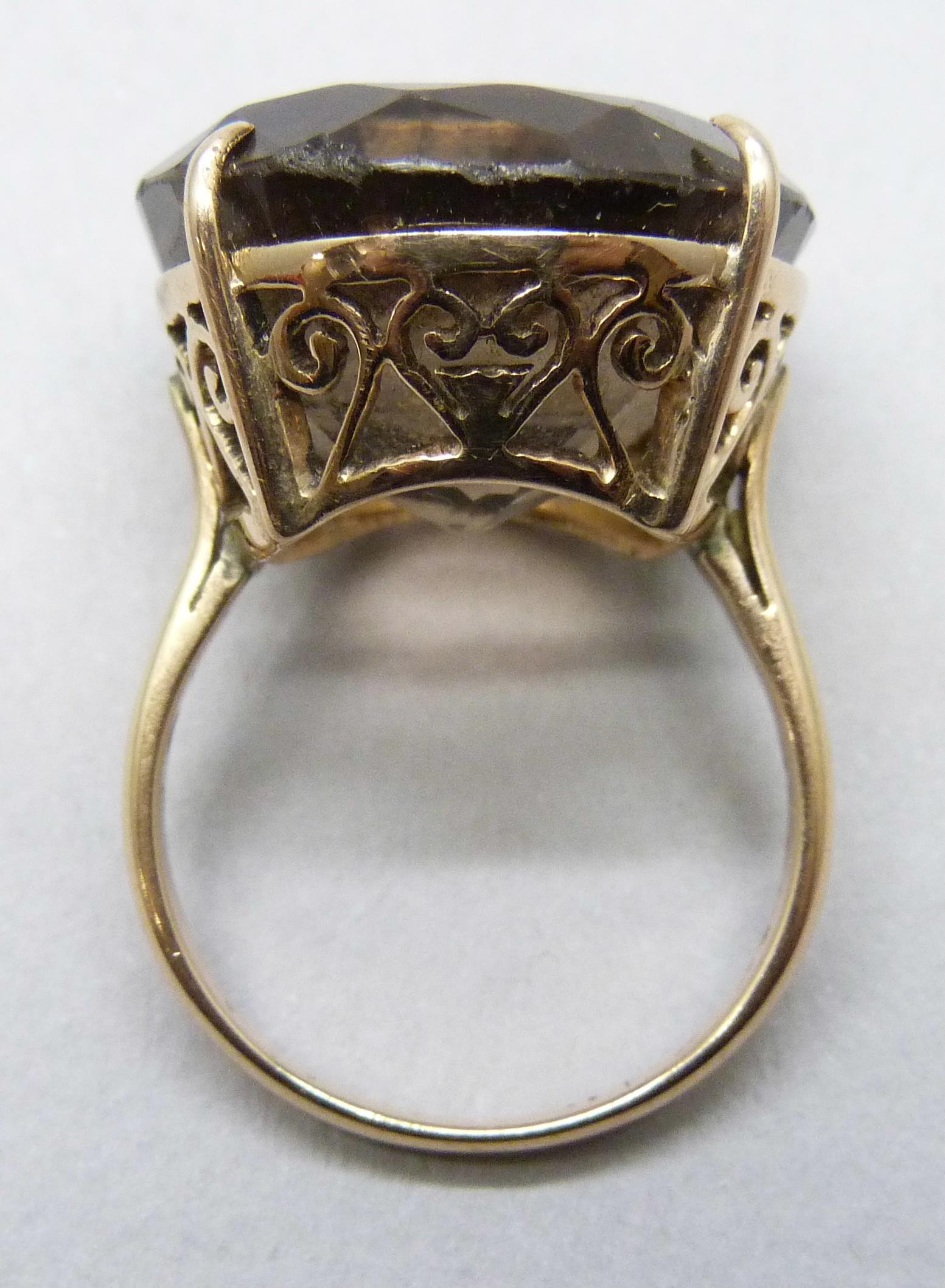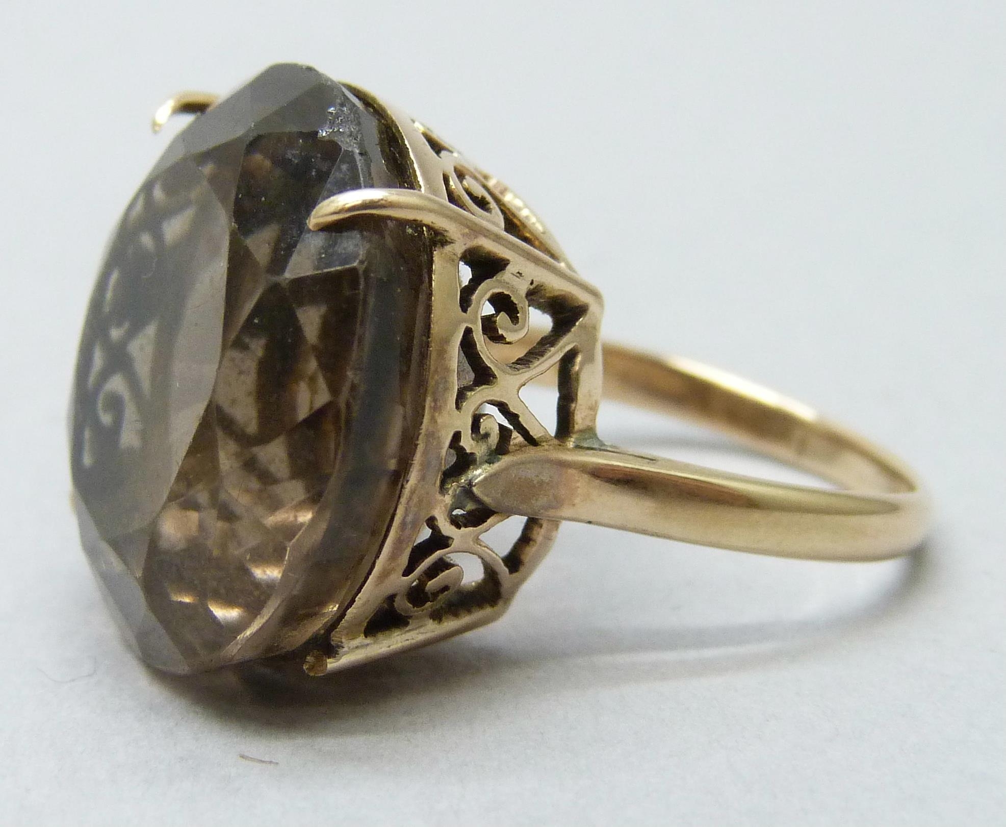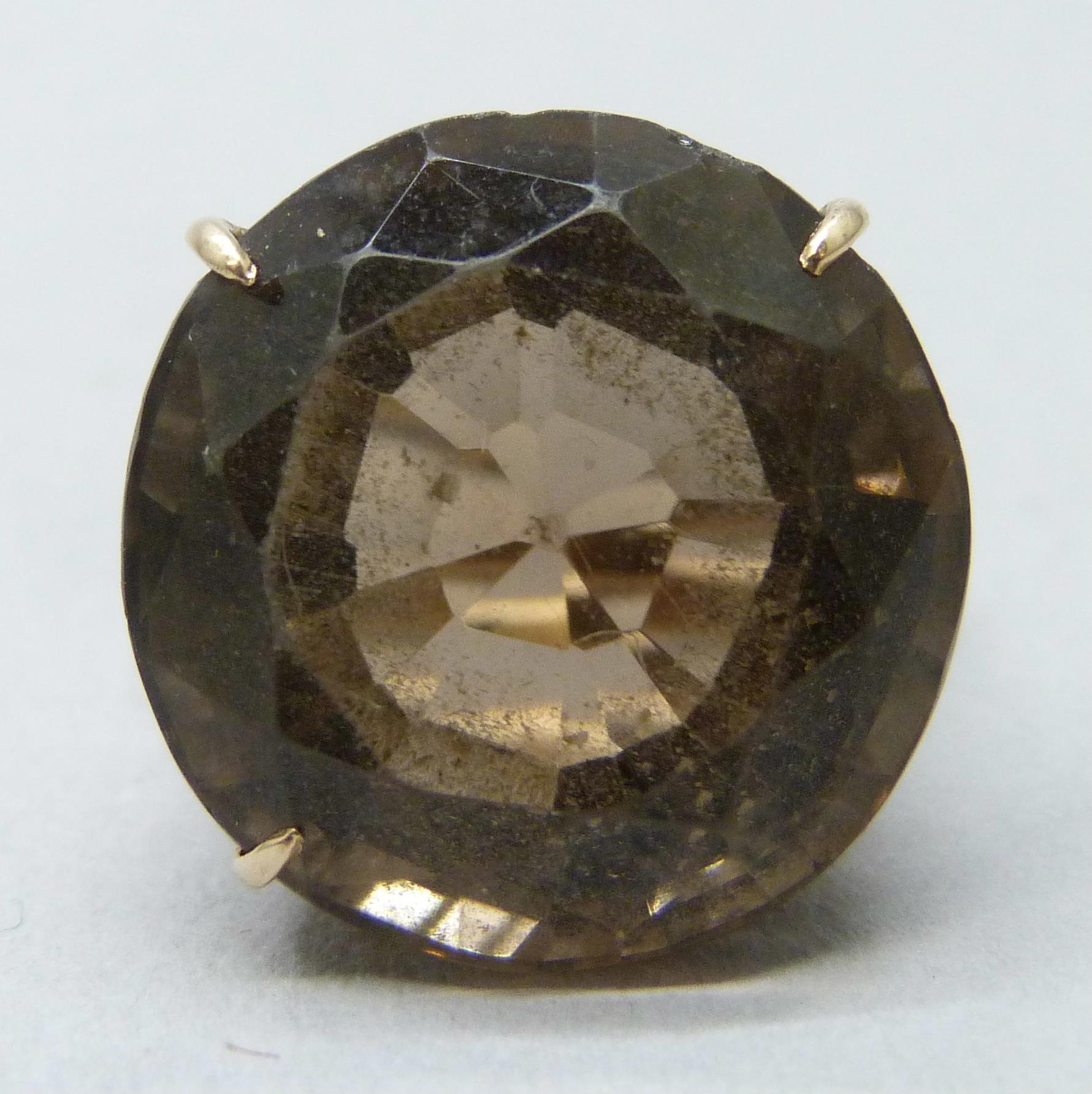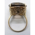 A yellow metal smoky quartz ring, 10.3g, a/f one claw missing and wear to stone, O