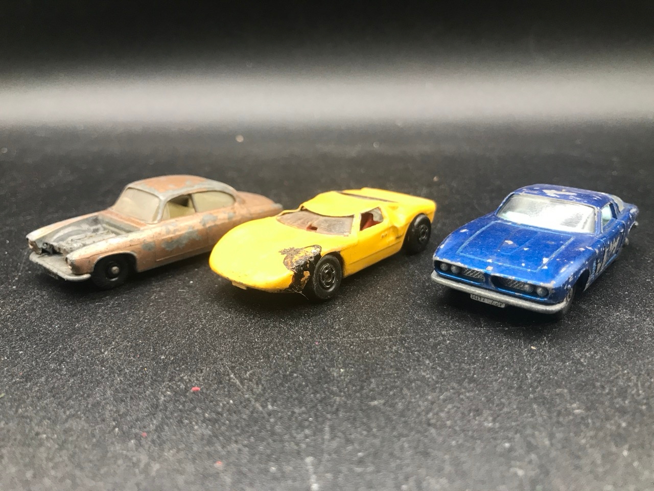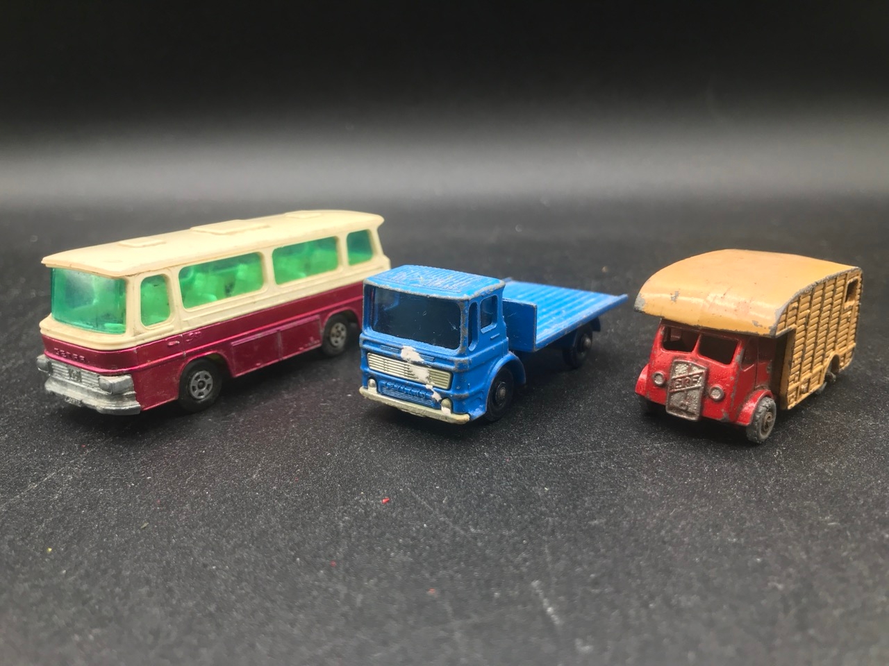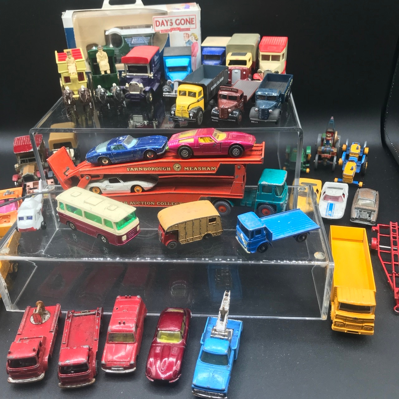 38 Play worn Husky, Lesney, Matchbox, Lledo and other die-cast vehicles, includes Lesney Truck Major Pack Guy Warrior Tractor + Car Transporter, Husky 2+2 E Type Jaguar, Matchbox 12 Coach, Matchbox 1976 No.75 Seasprite Helicopter, Many for Spares/Repair - Die-cast Poor/Fair (38) 2300g