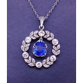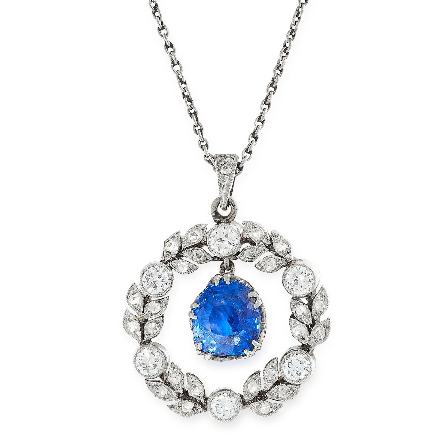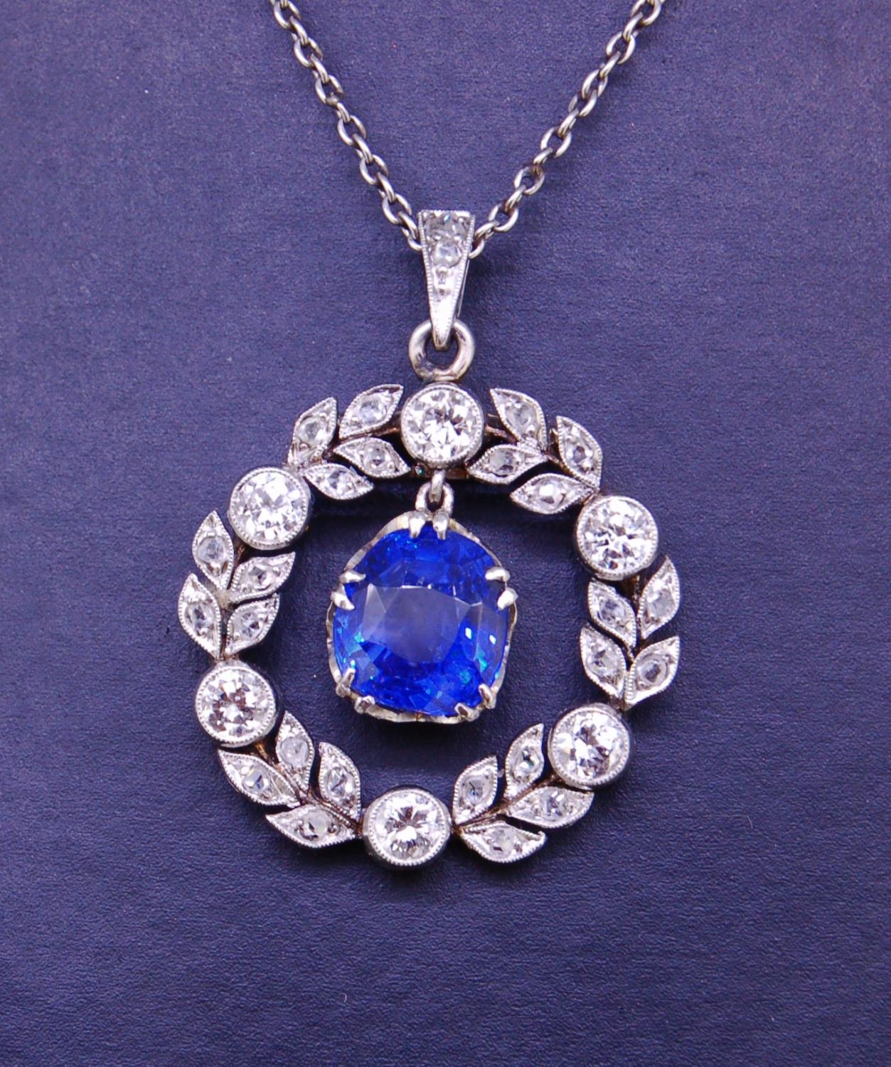 SAPPHIRE AND DIAMOND WREATH PENDANT, the wreath set with diamonds totalling approx. 0.77 ct. suspending a Ceylon blue sapphire in the middle of 3.01 ct. With chain. L. 42.7 cm. 8,9 grams. Accompanied by GCS London report No. 79207-94 stating that the 3.01 ct. blue sapphire is natural, Ceylon origin, with no indicatoins of heating.
