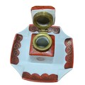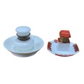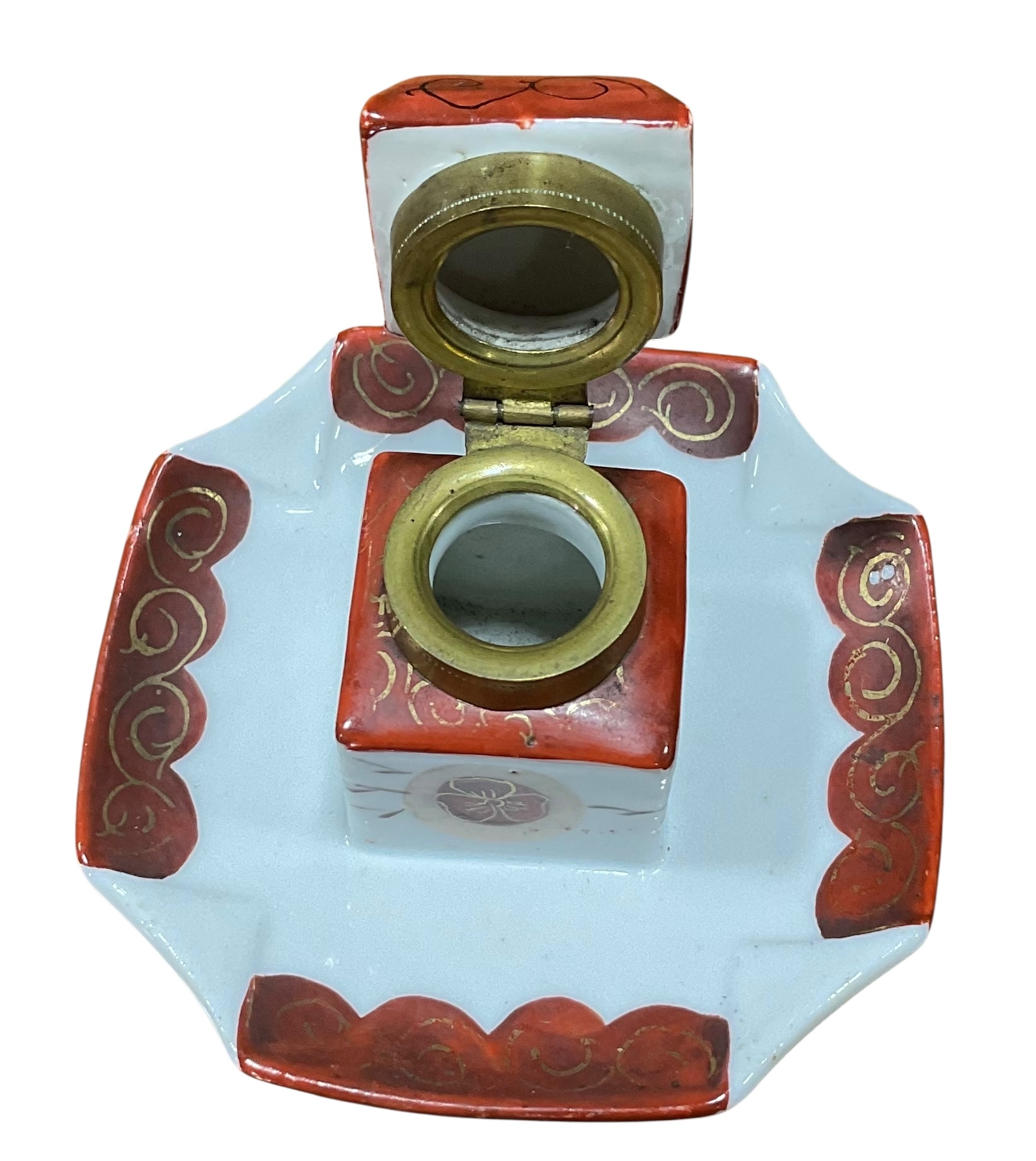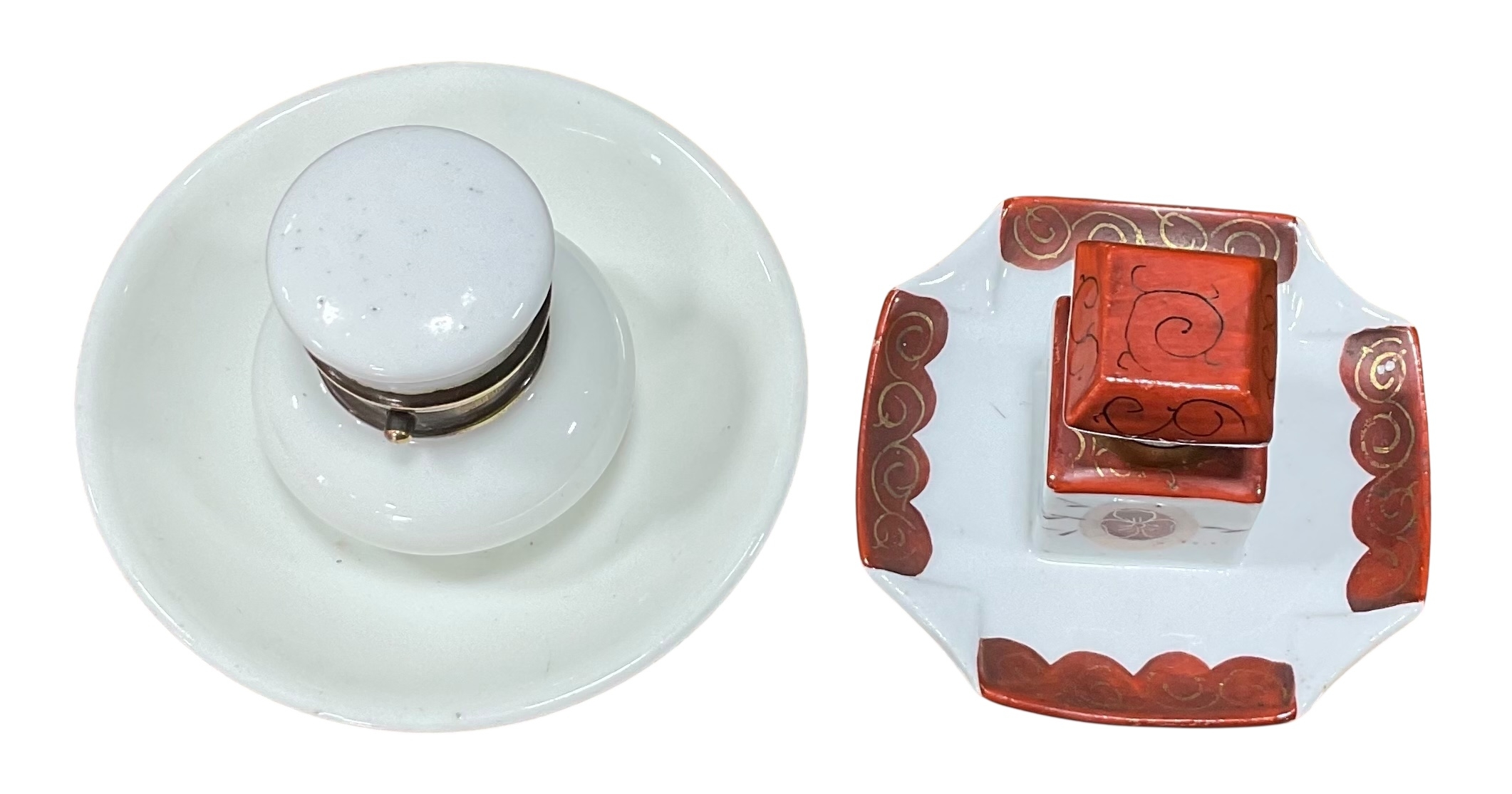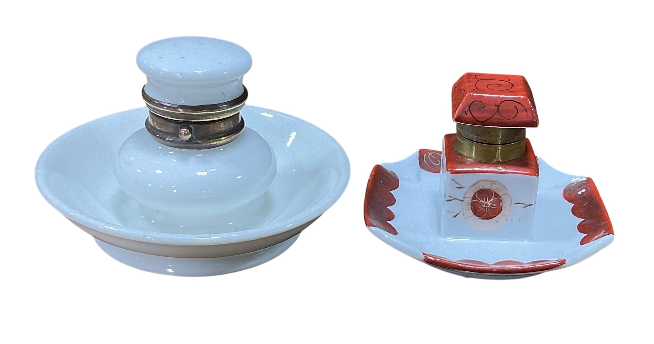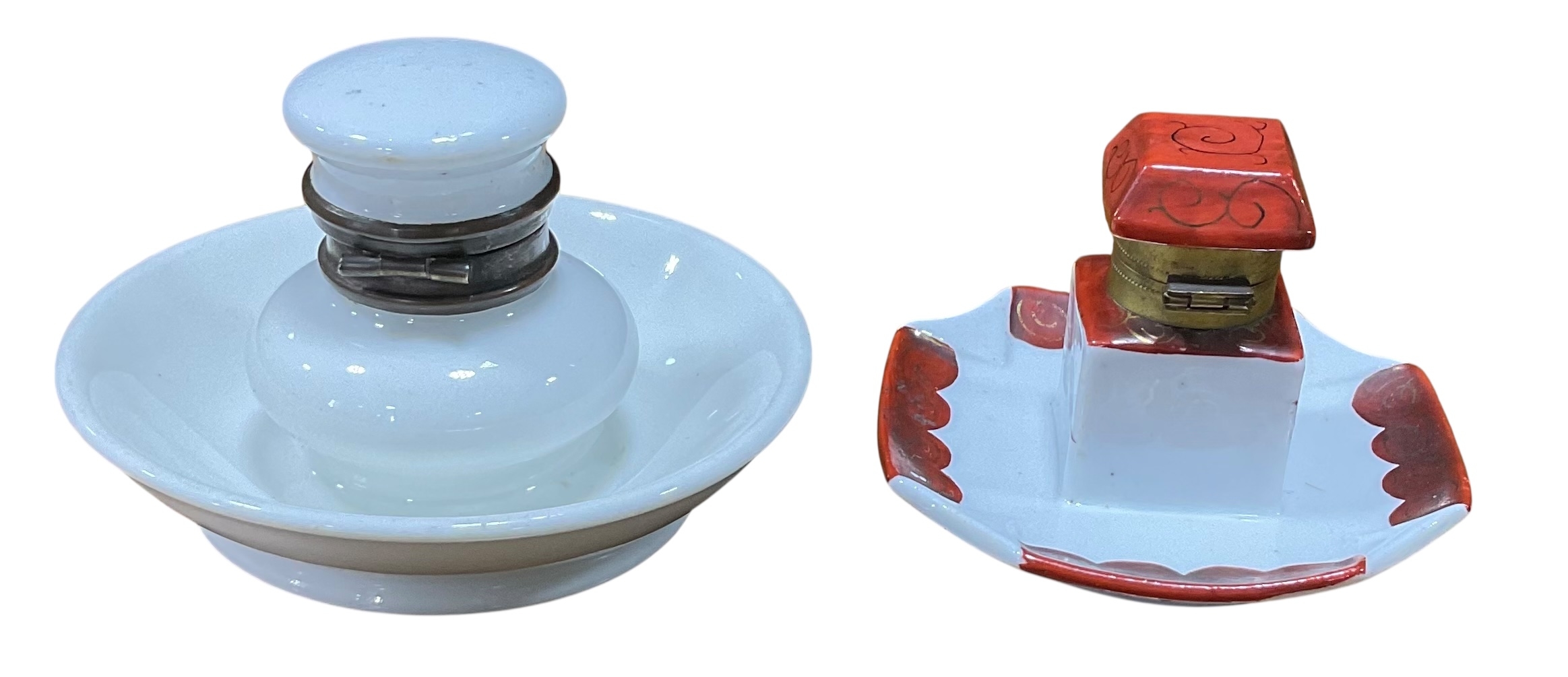 Pair of Ceramic Inkwells: Early 20th Century English Porcelain Push Button Inkwell and One Decorated Inkwell