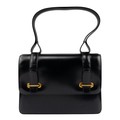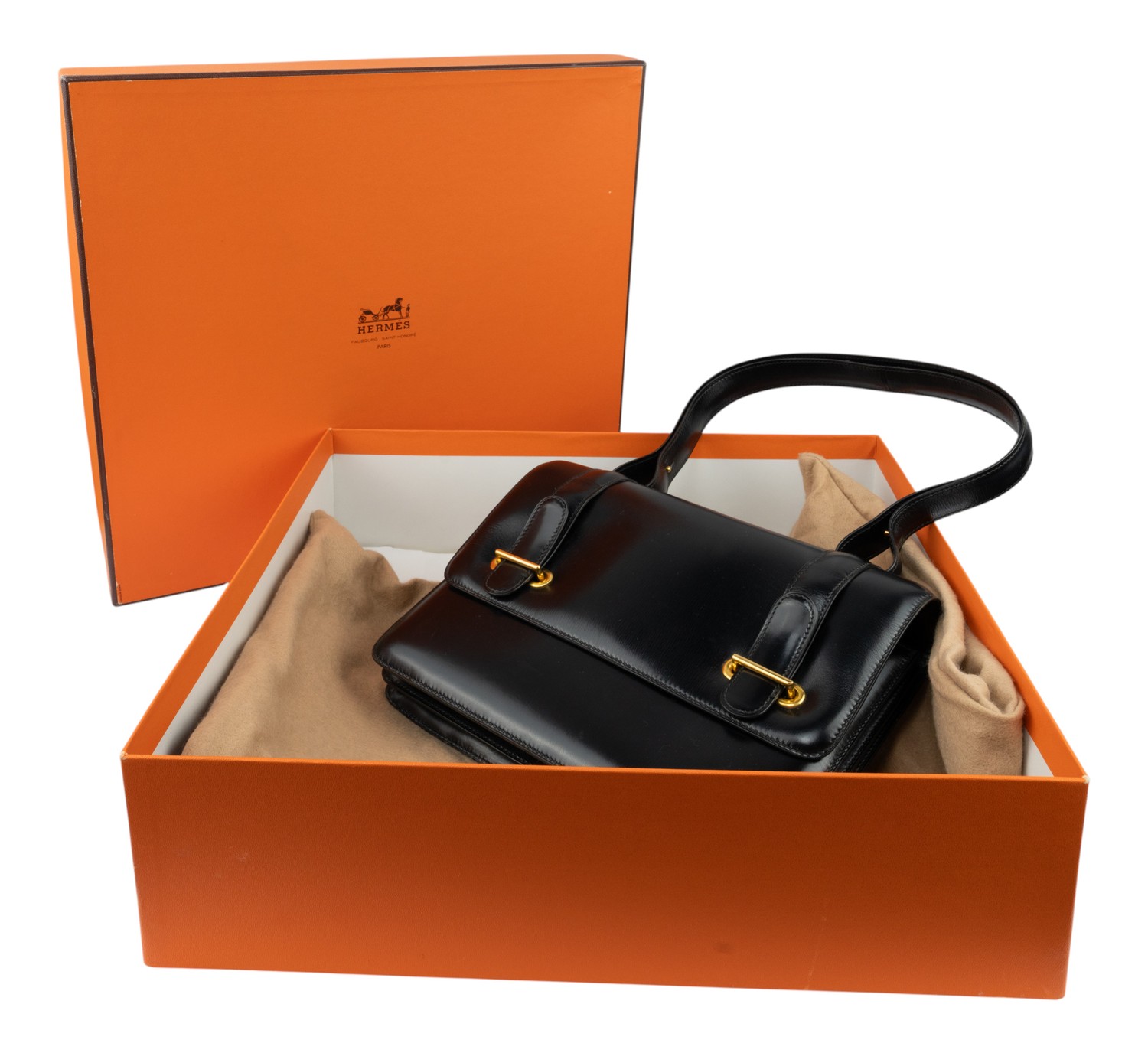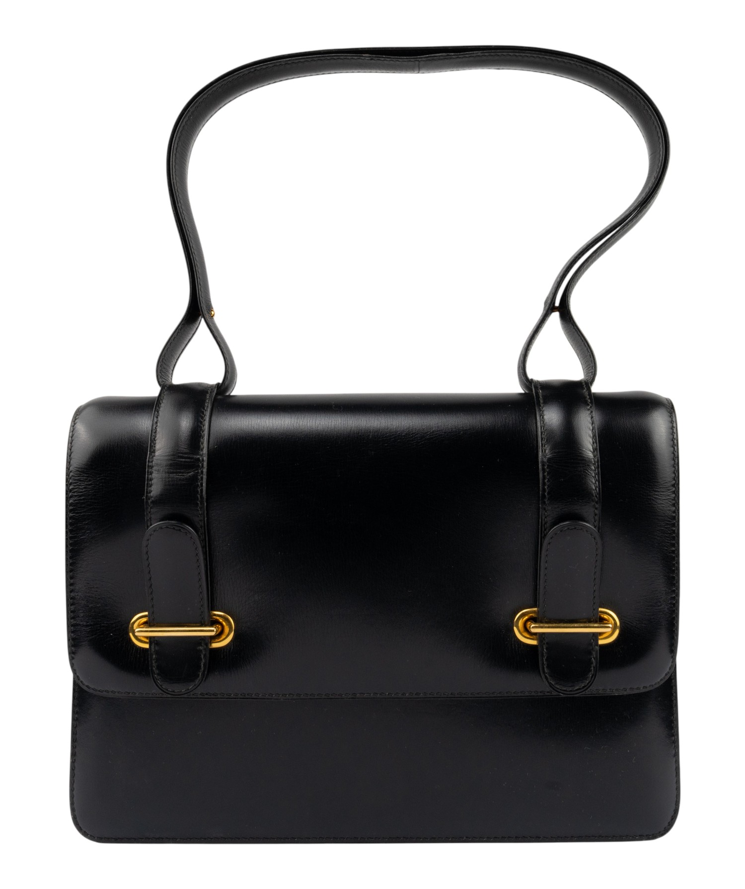 The box-shaped bag with two leather fastening straps and a short leather handle
