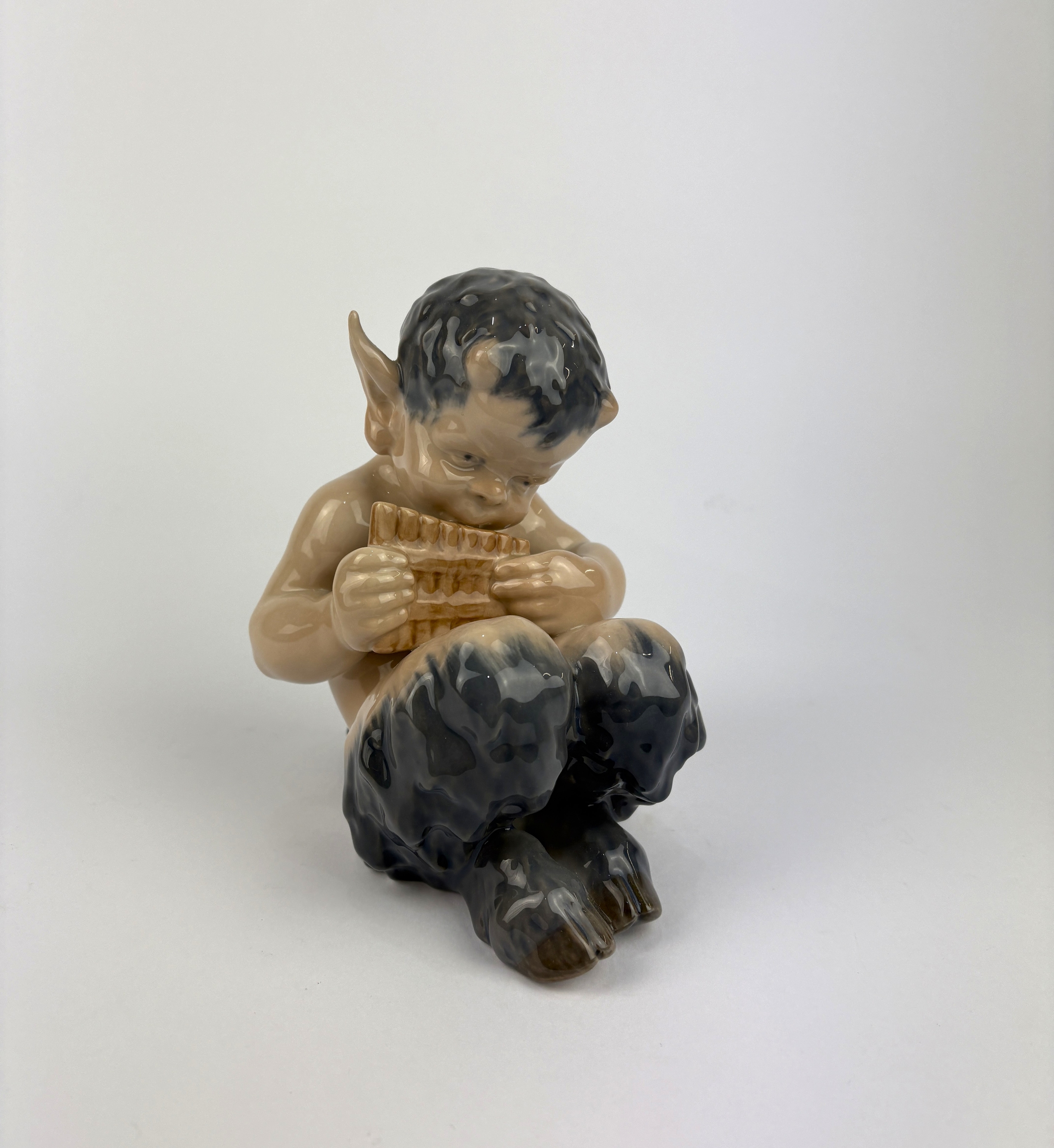 A Royal Copenhagen porcelain model of a faun playing a pan flute, no 1736, 14.5cm high