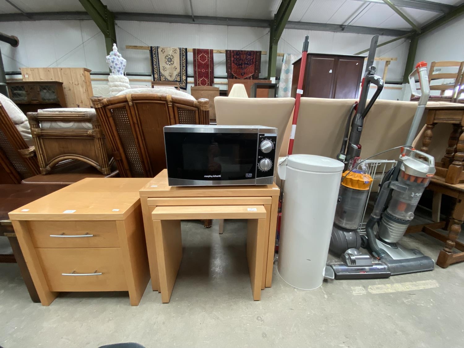 Beech effect 2 drawer chest (48H 45W 46D cm), nest of 3 beech effect tables (54H 60W 36D cm), Morphy Richards microwave, Dyson DC40, Vax Agile Air 3 etc