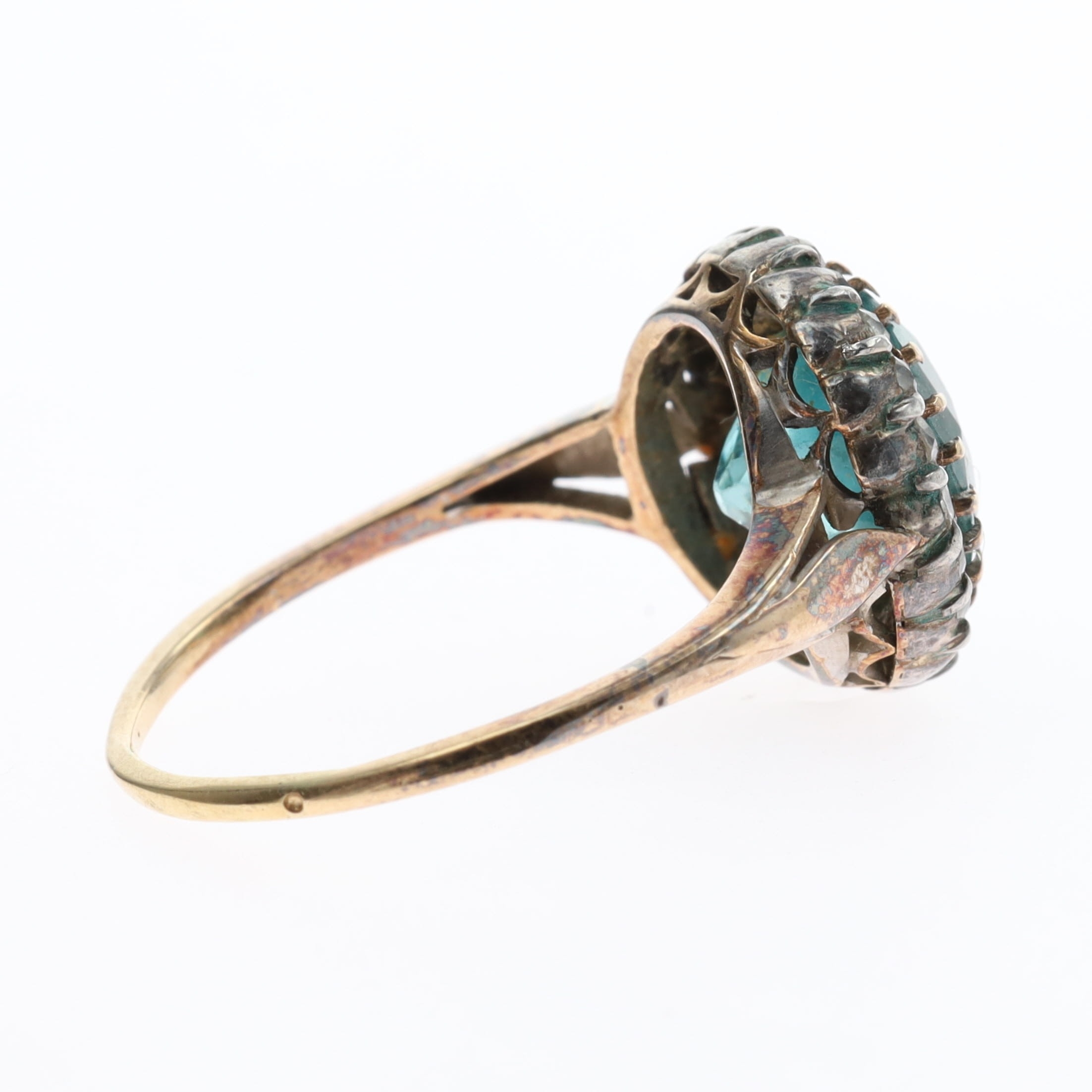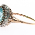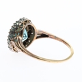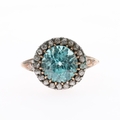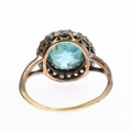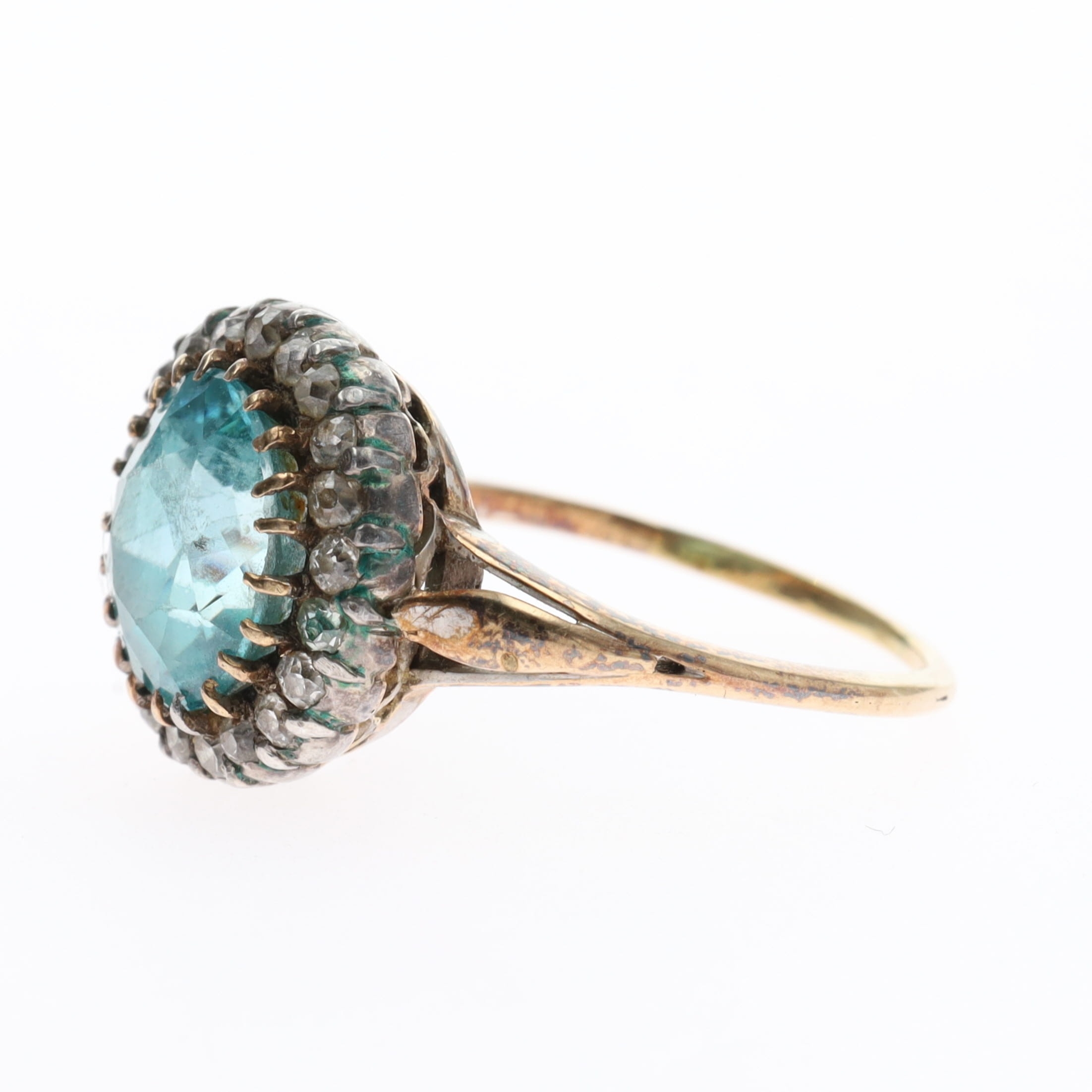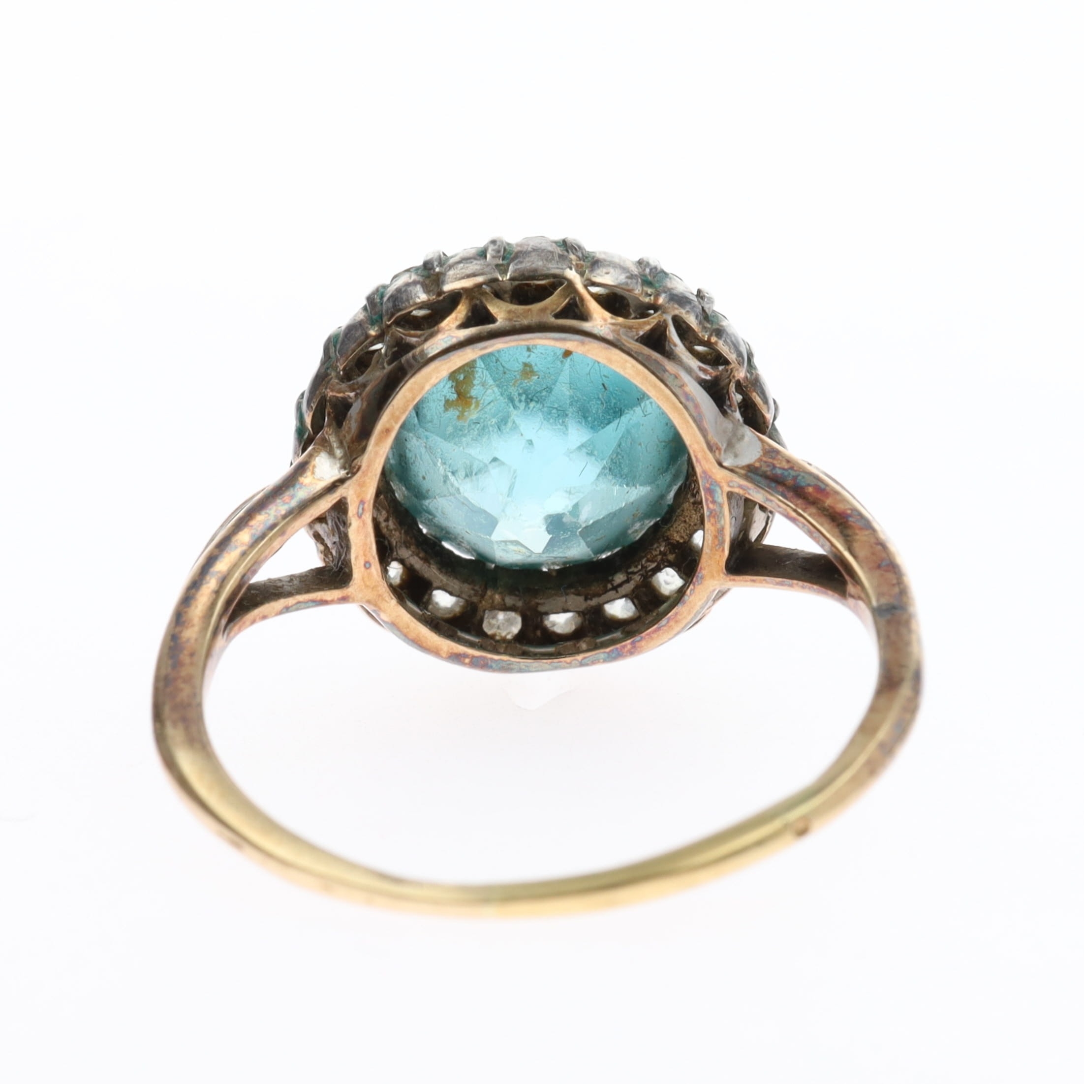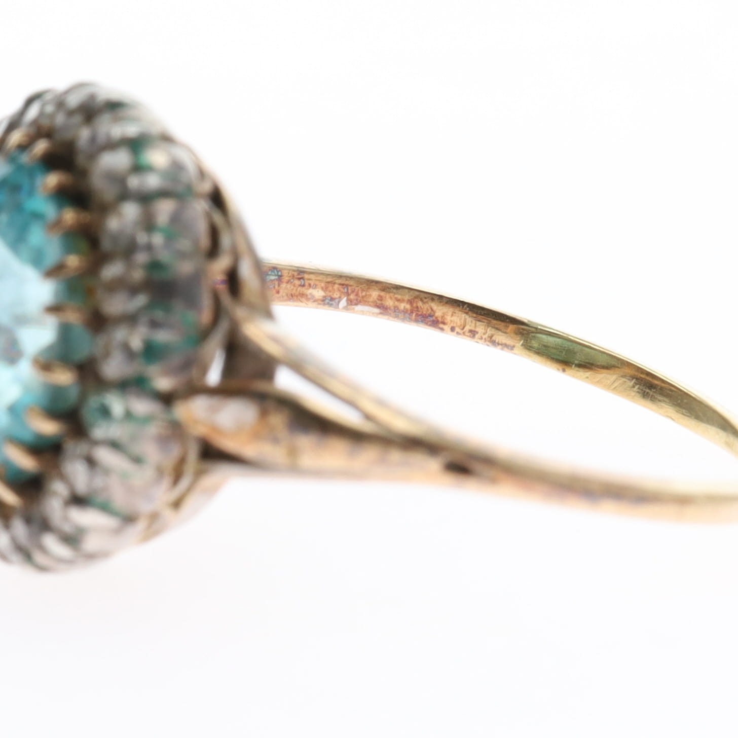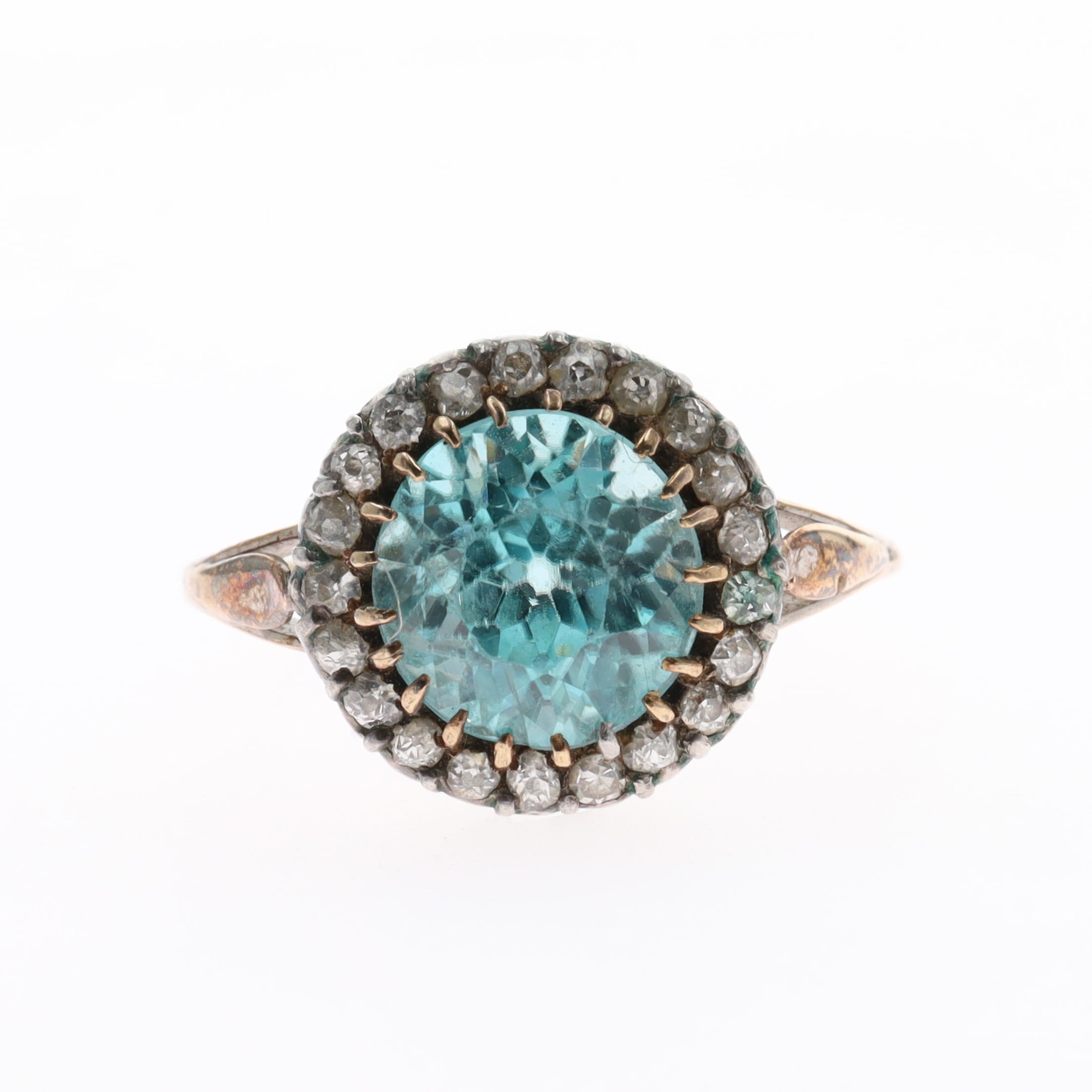 Blue Zircon And Diamond Halo Ring, tested 15ct with a silver setting. There is some thinning of the band. Ring size UK P. Weighs approximately 3.8g