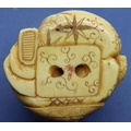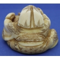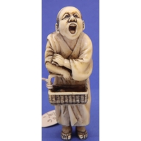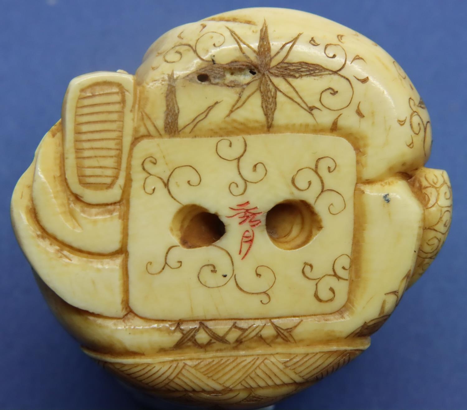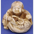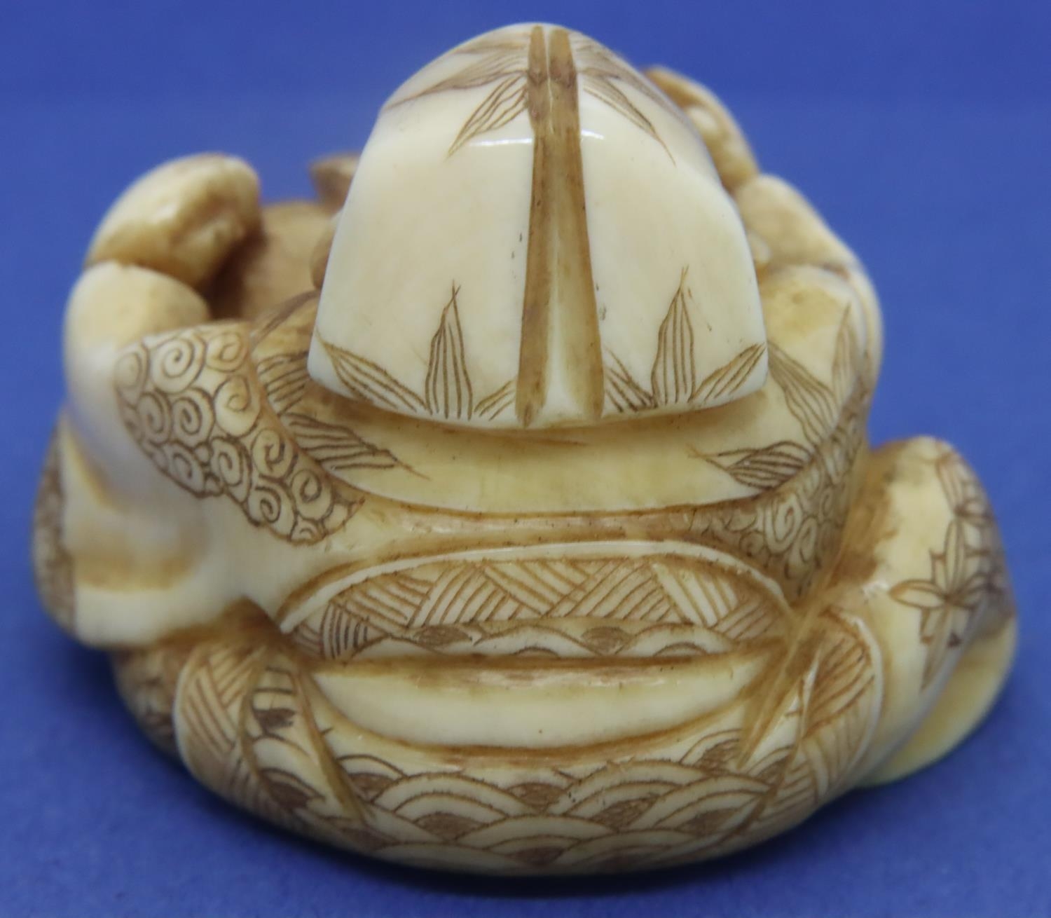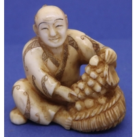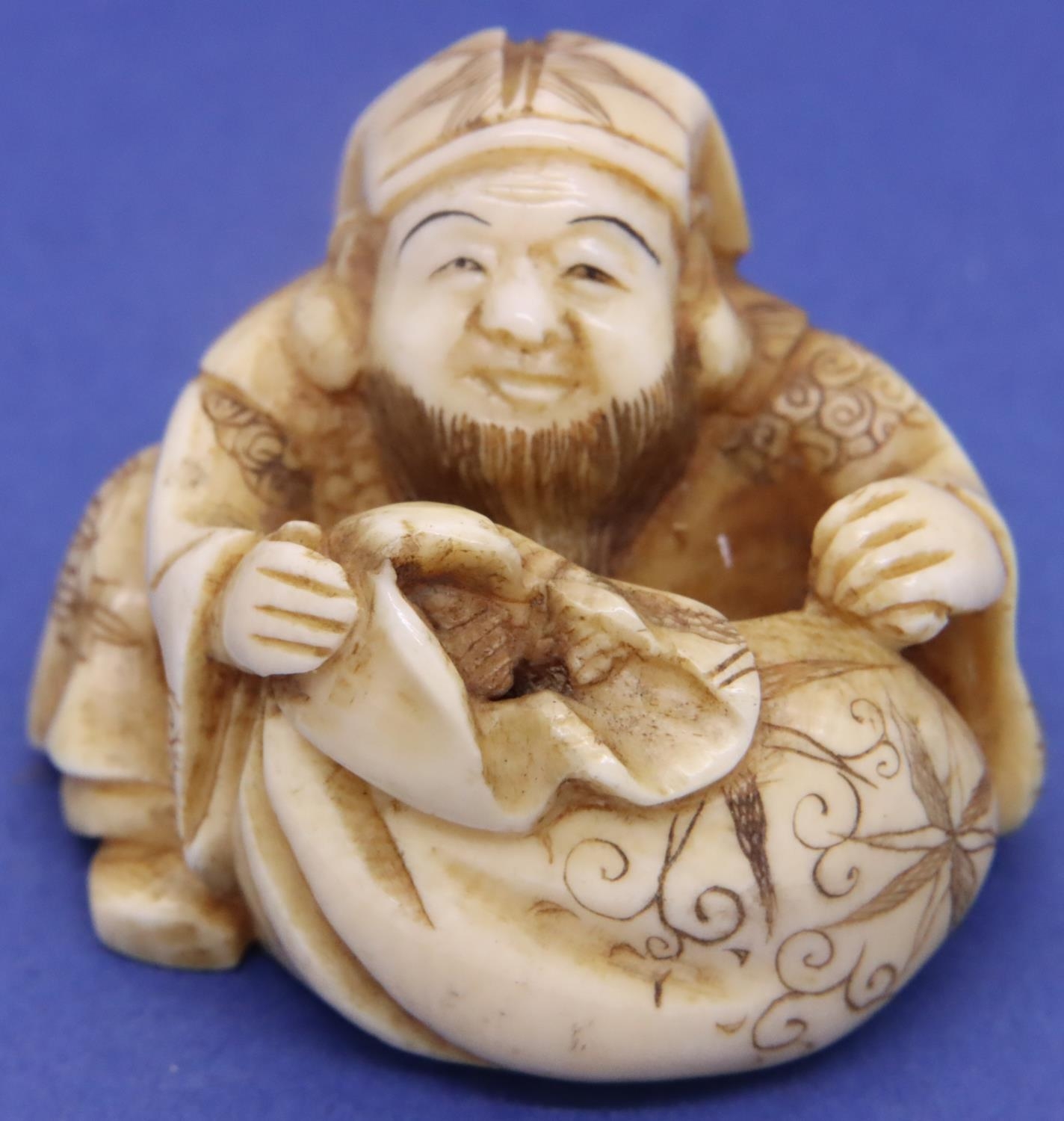 Ivory carved netsuke in the form of a seated bearded man with a sack, H: 35 mm, signed to base. P&P Group 1 (£14+VAT for the first lot and £1+VAT for subsequent lots)