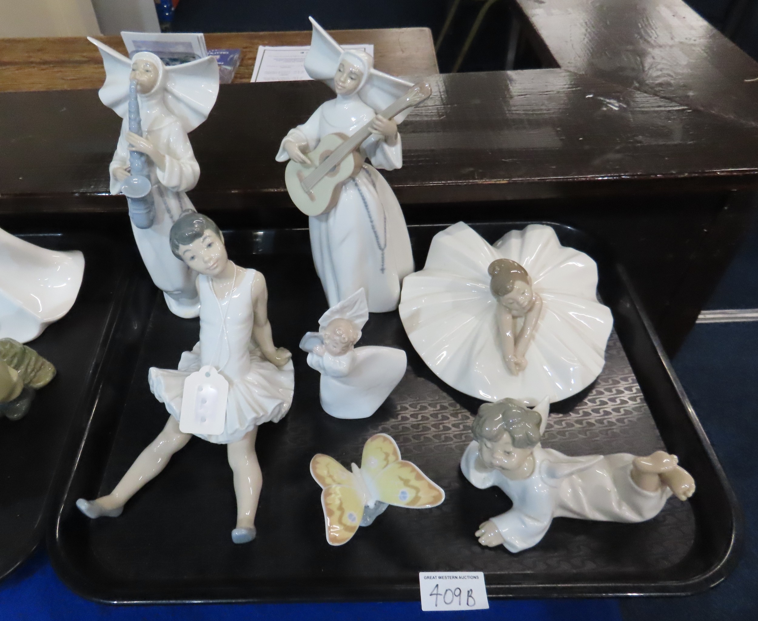 Two Lladro nuns, one playing a saxophone, the other a guitar, an angel, two Nao ballerinas, an angel and a butterfly