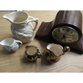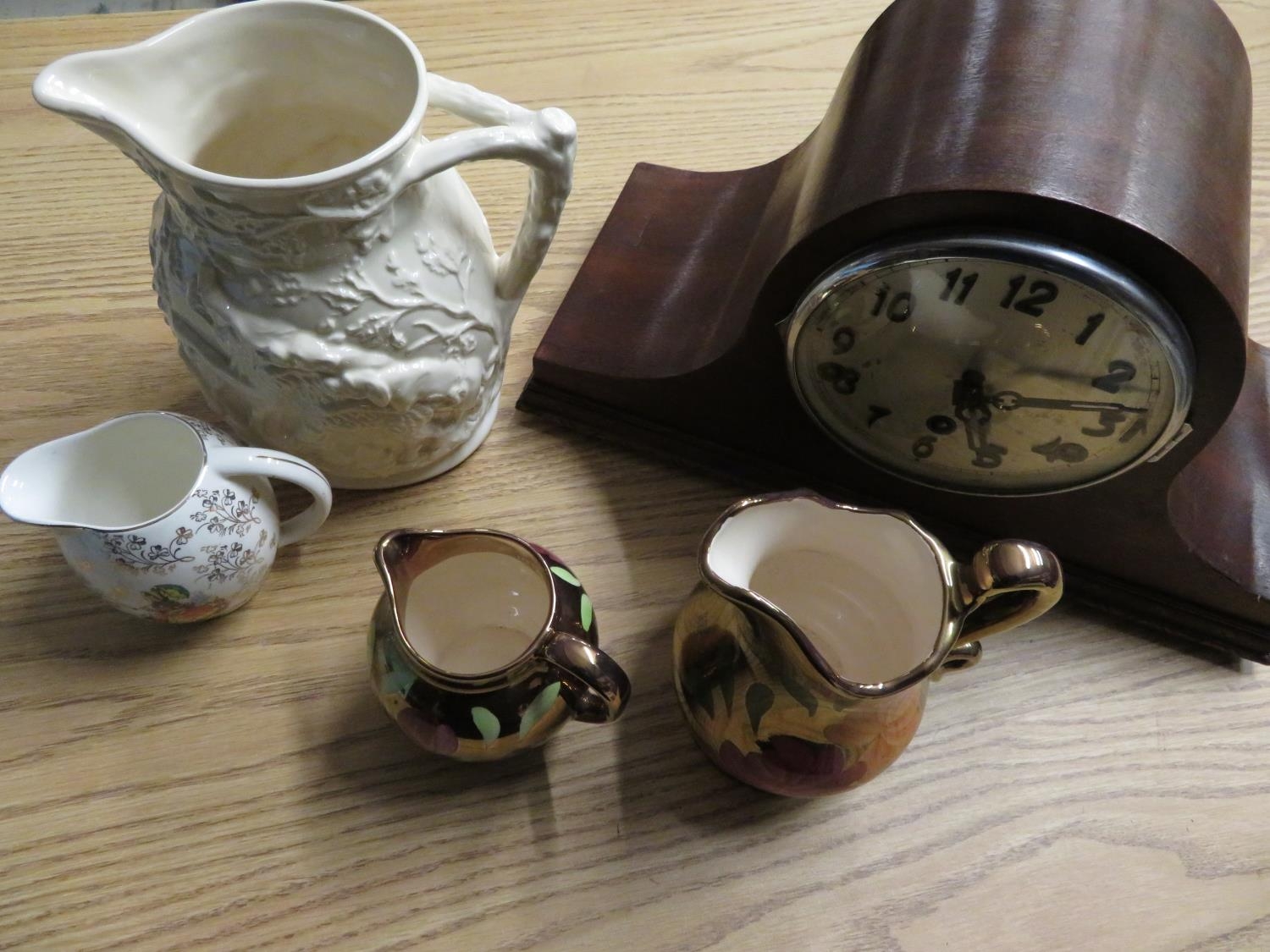1930s mahogany case mantle clock with Westminster and Whittington chiming movement, and four various jugs
