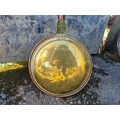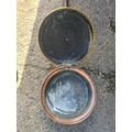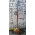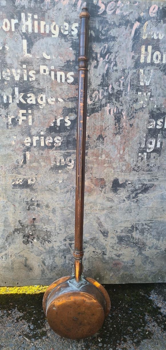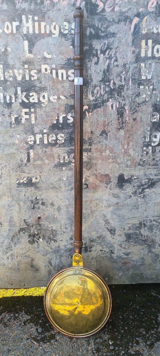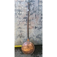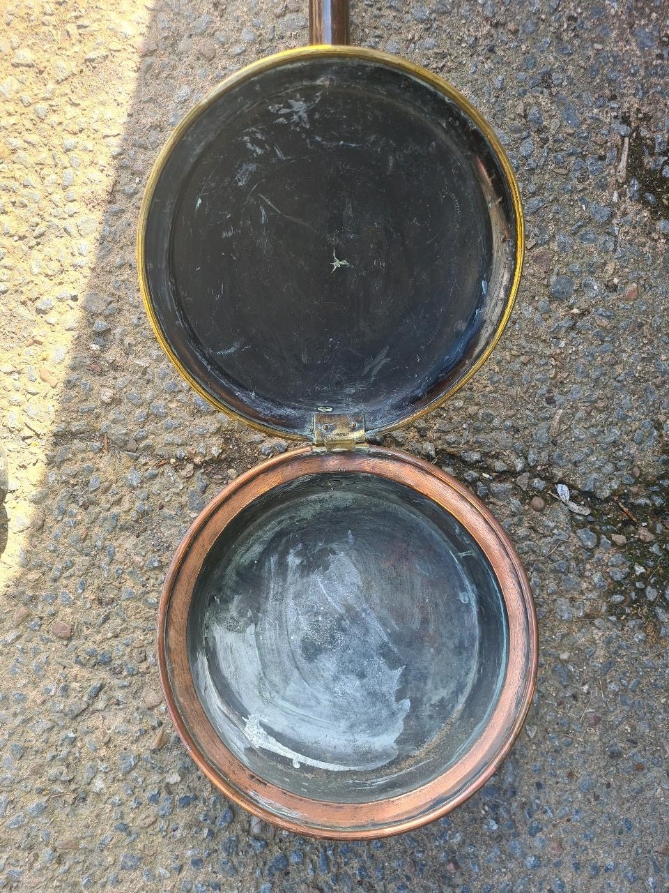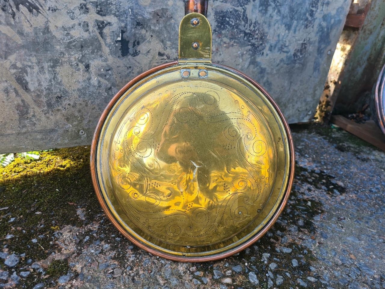 Antique copper and brass bed warming pan with embossed lid with intricate decorative patterns.