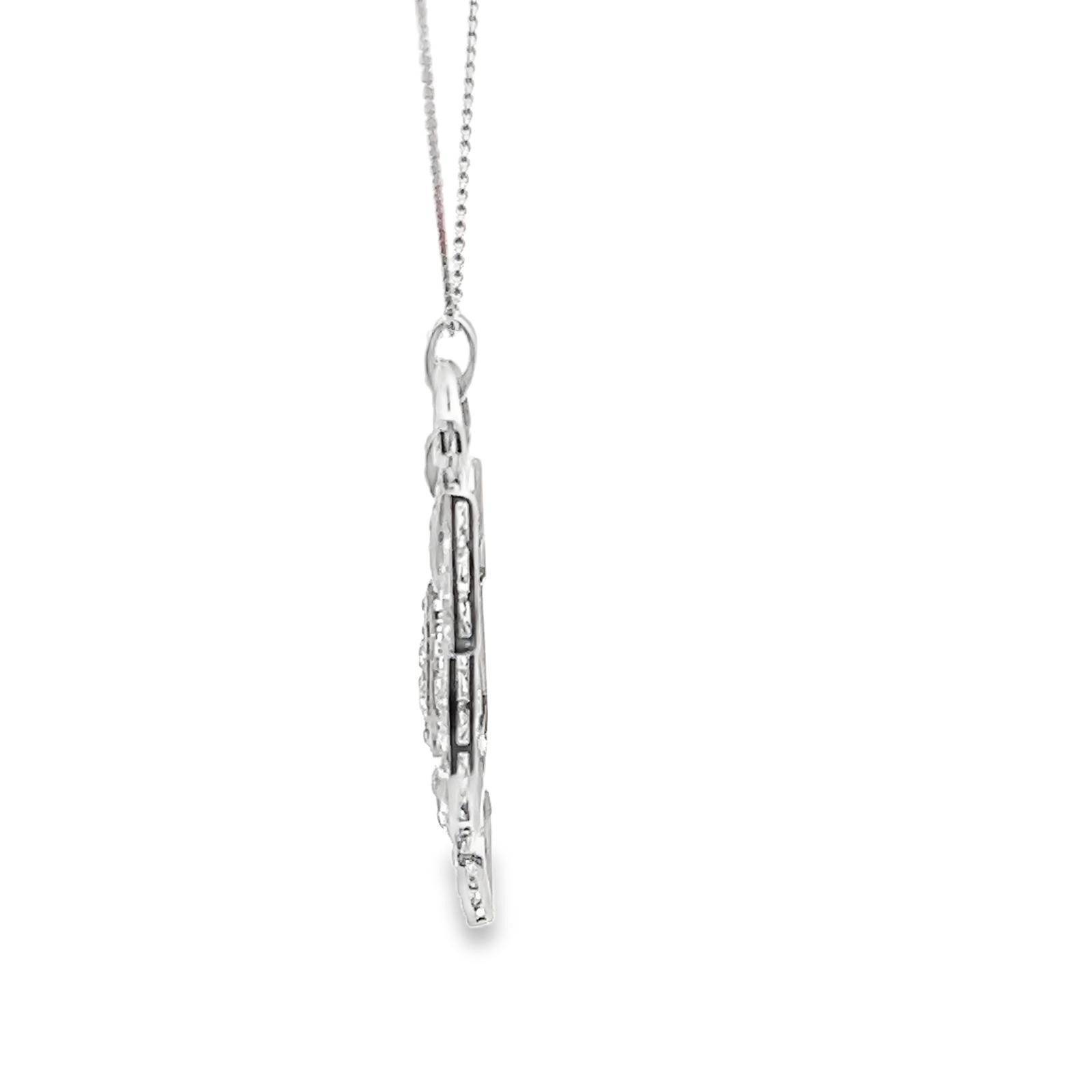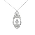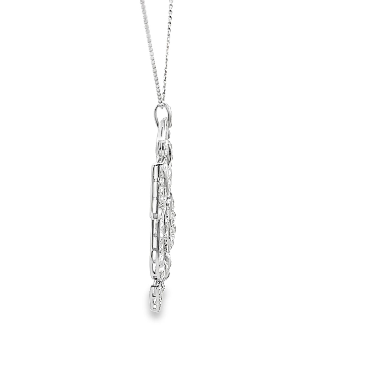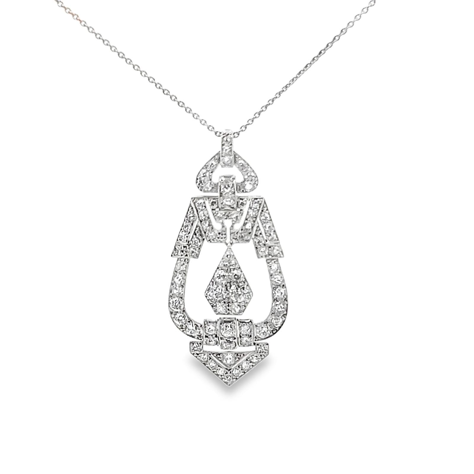 An Art Deco old cut diamond pendant milligrain set in unmarked white metal tested as platinum. Articulated links. Total diamond weight estimated as 2.8ct. Pendant length approx 55mm. Suspended from an 18" white metal chain also tested as platinum.Large chip to larger diamond in central drop. A few of the other diamonds. with chips.