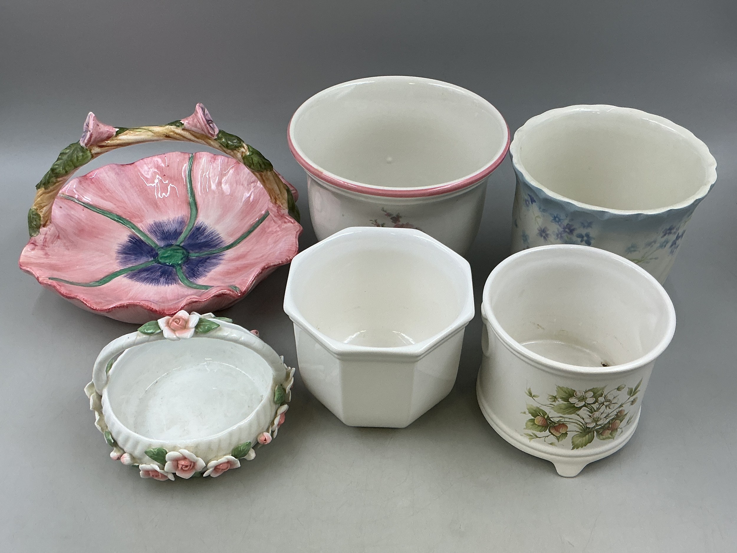 Four Ceramic Planters and two Floral Baskets (Largest 23cm)