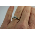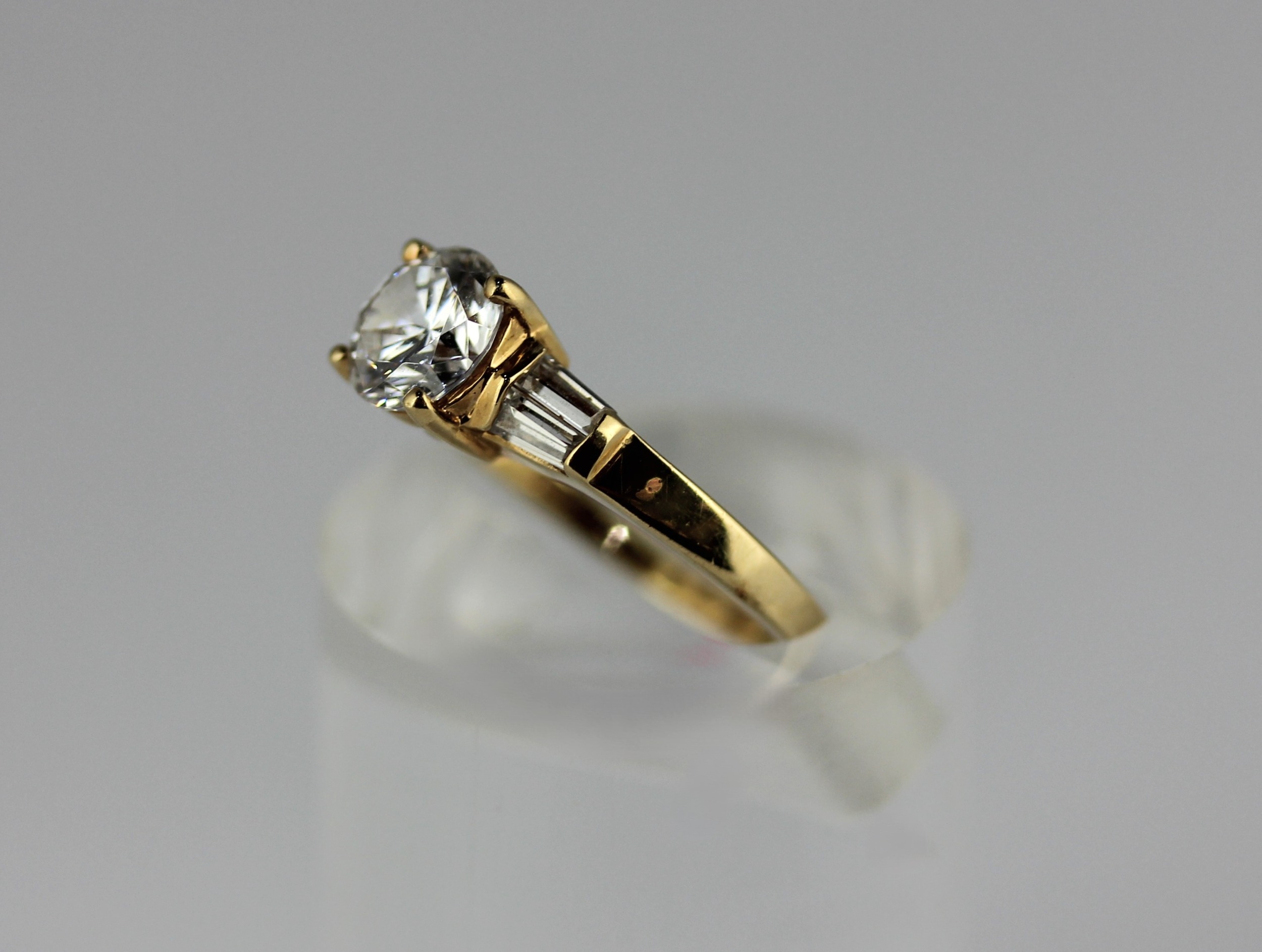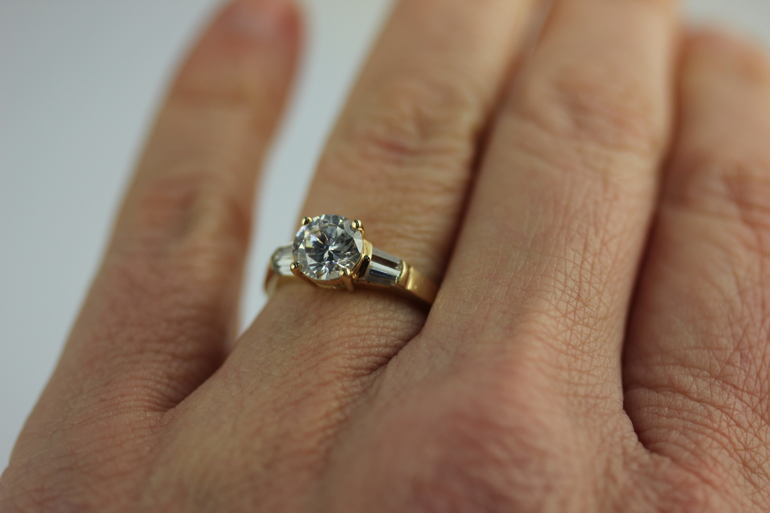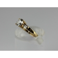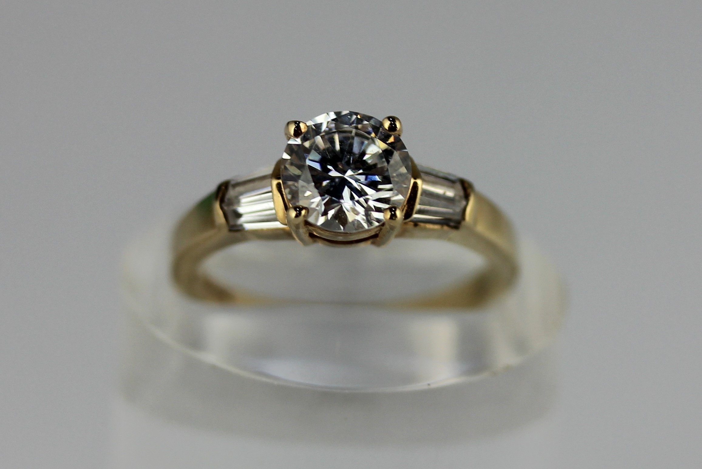 A gold and cubic zirconia ring claw set with the principle circular cut cz at the centre between the cz shoulders detailed 14k ring size L and a half, gross weight 2.7g