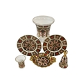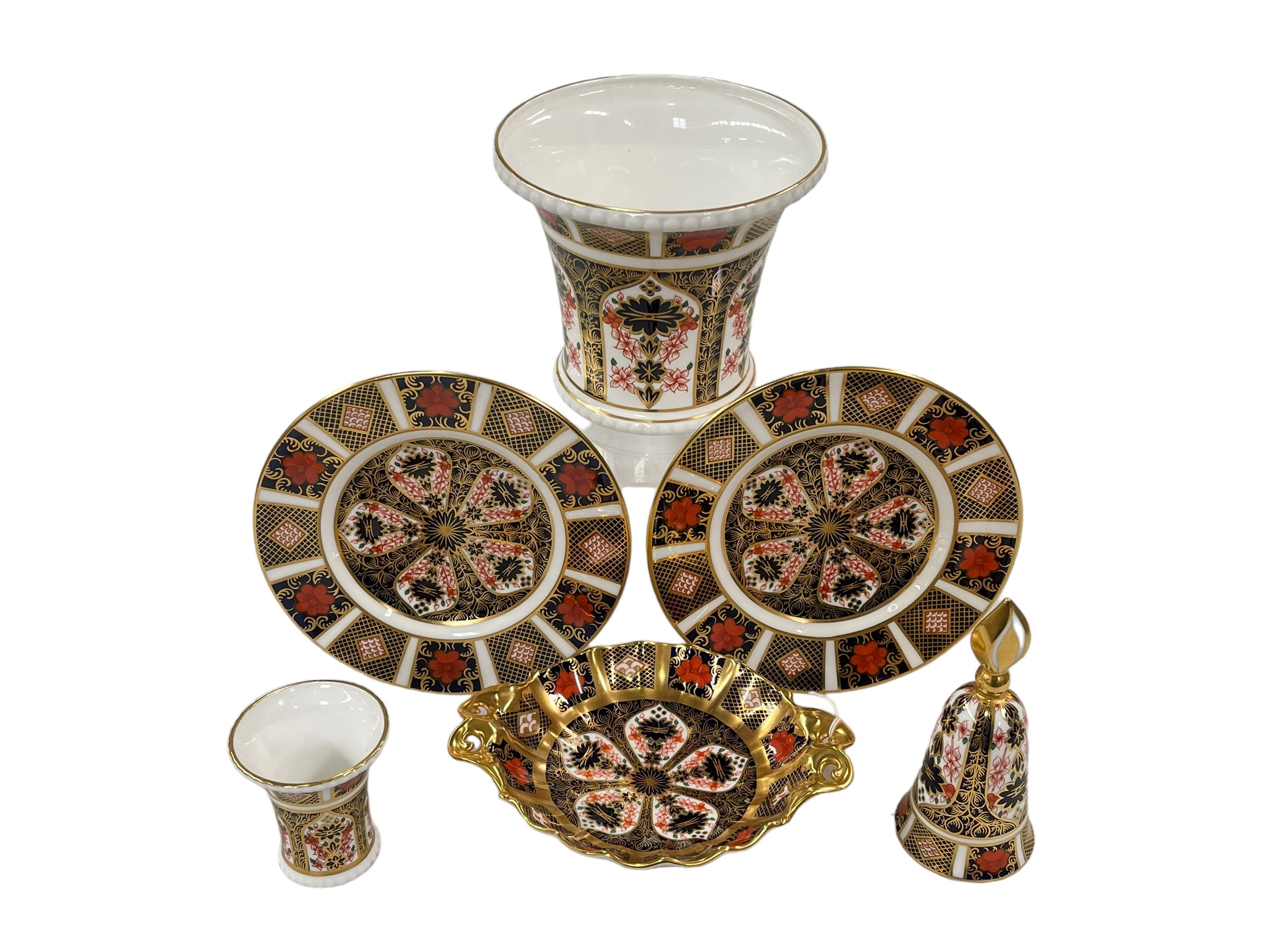 Royal Crown Derby vase, two plates, bon bon dish, bell and small vase (6).