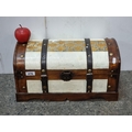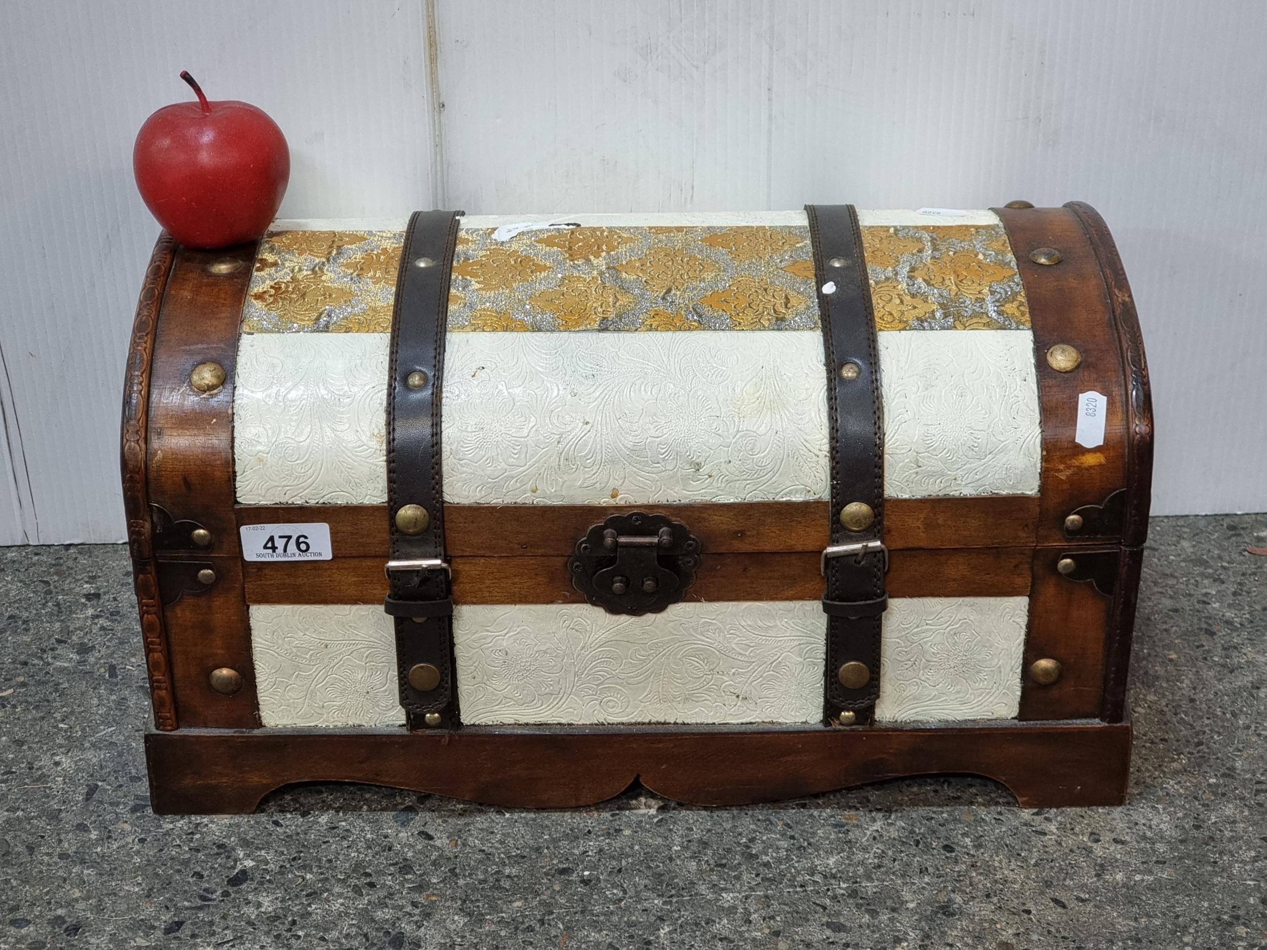A decorative hardwood chest with leather straps, bronze toned latch and a decorative damask panel.