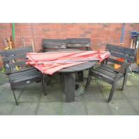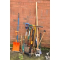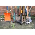 A SELECTION OF GARDEN TOOLS including a Fiskars weed puller, pick axe, forks, shovels, etc