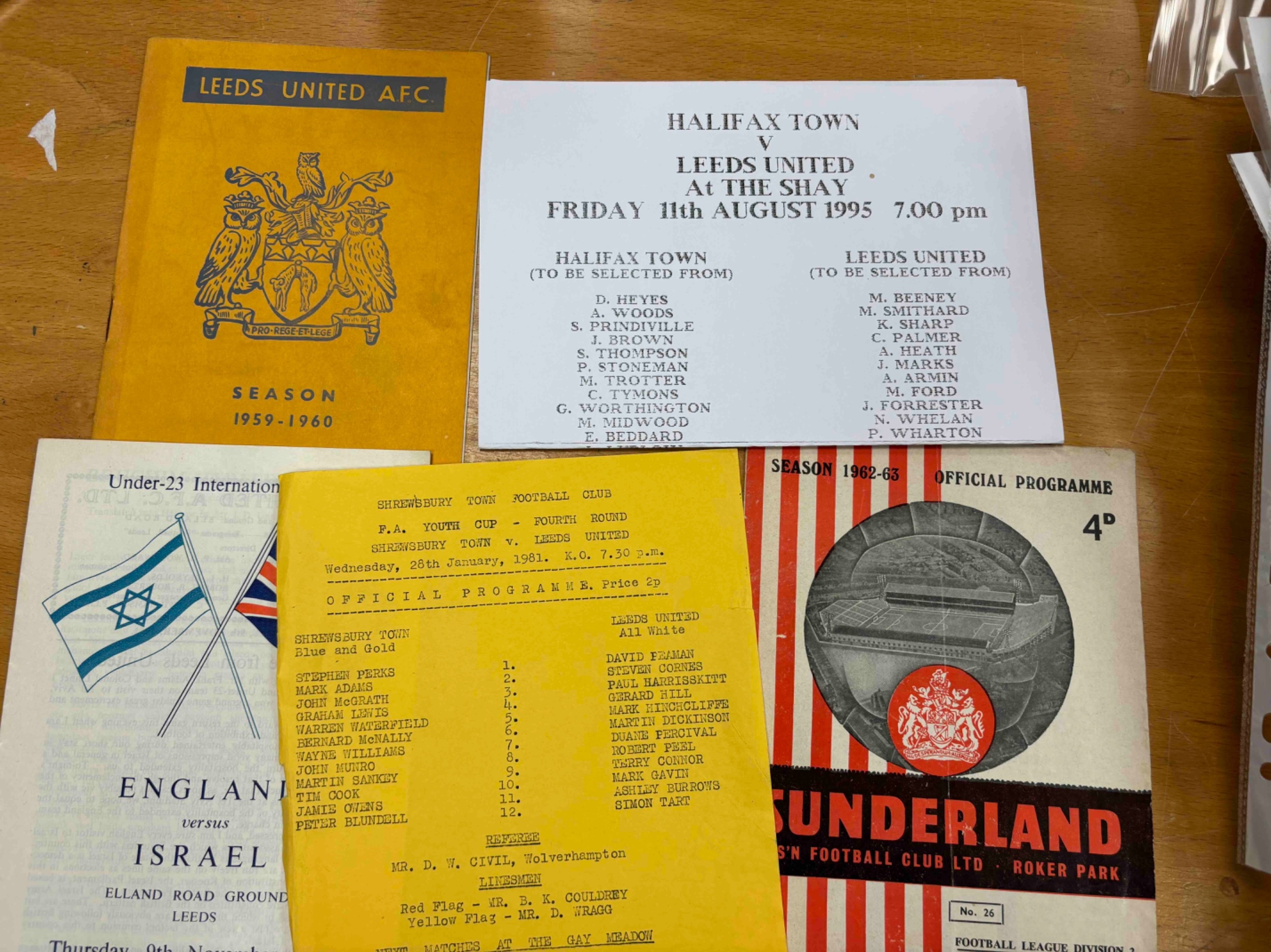 Leeds United, 59/60 v Manchester City (VG), 62/63 away v Sunderland (folds), 80/81 away v Shrewsbury (FA Youth cup) S/S, 1995 Away v Halifax Town Friendly S/S. Fold. Plus 1961 England v Israel U23 international at Elland Road. Good (5)