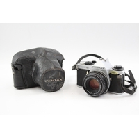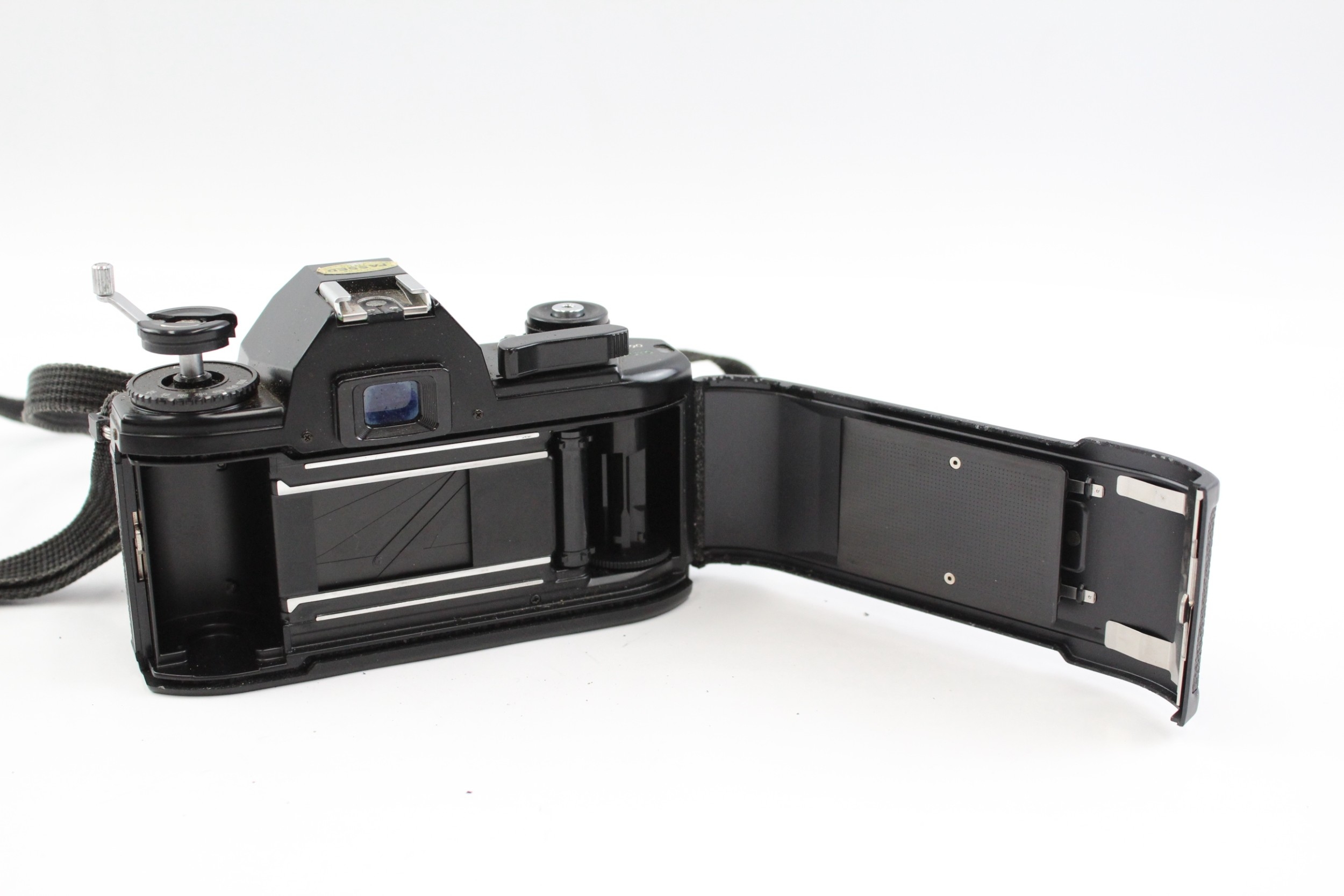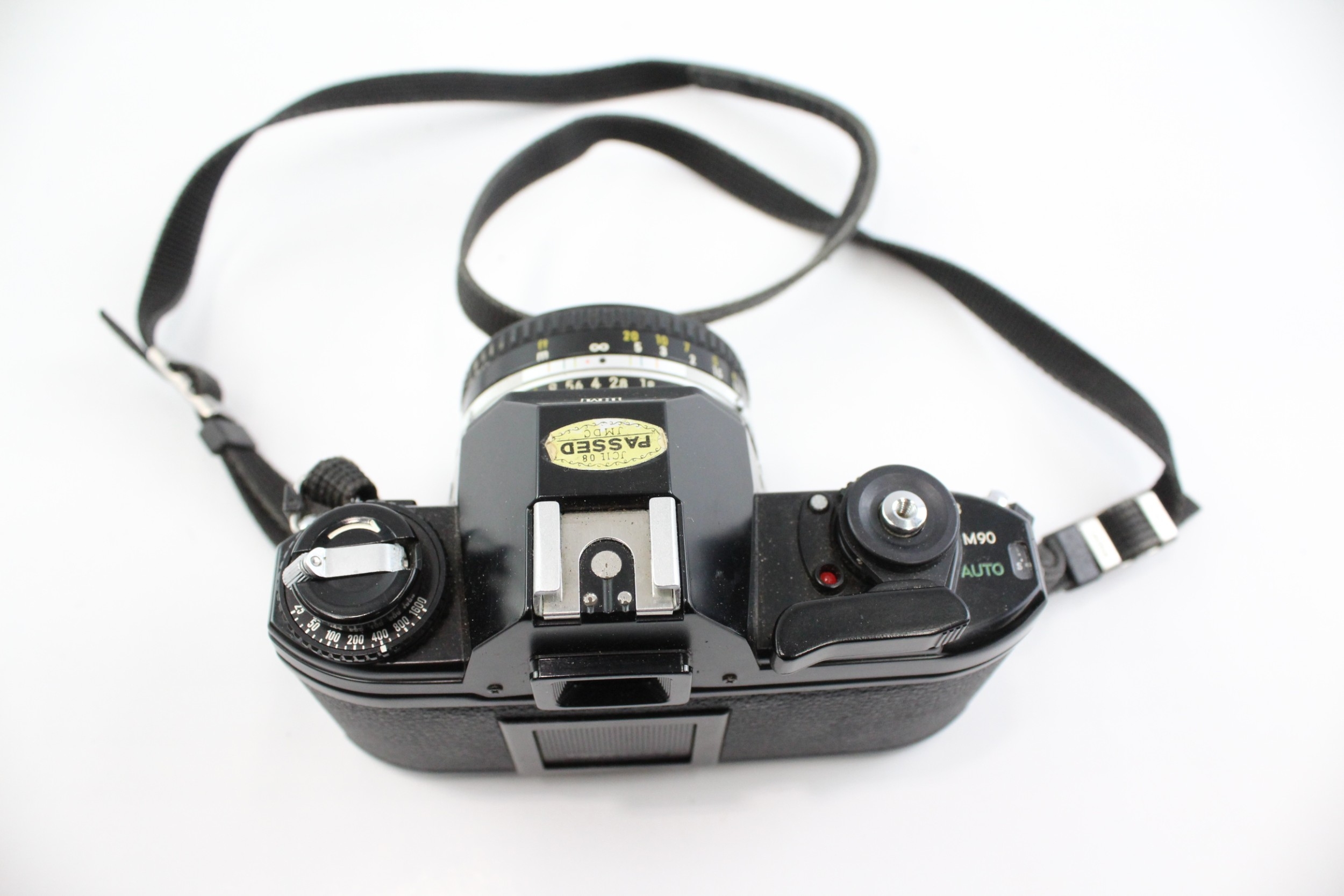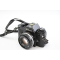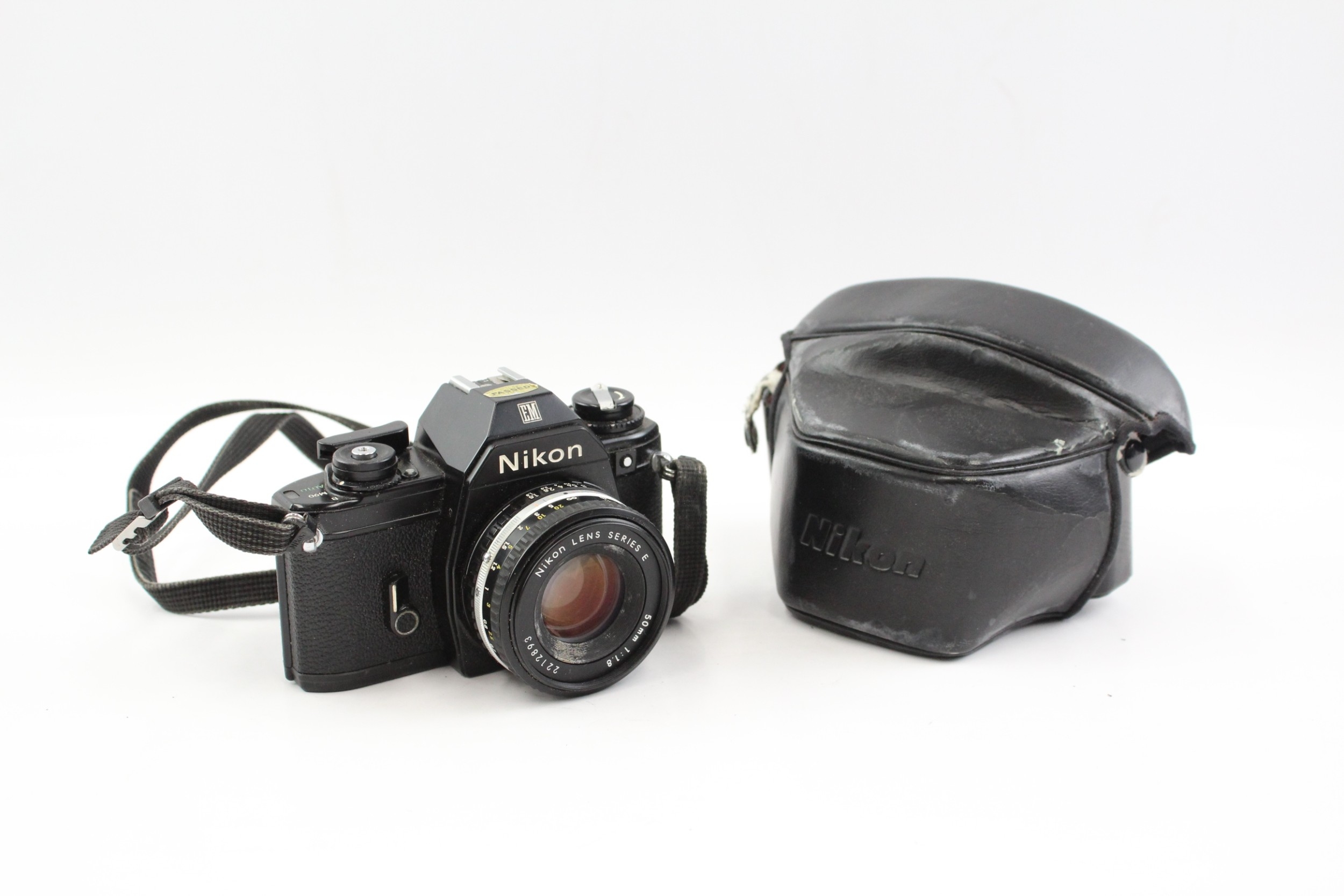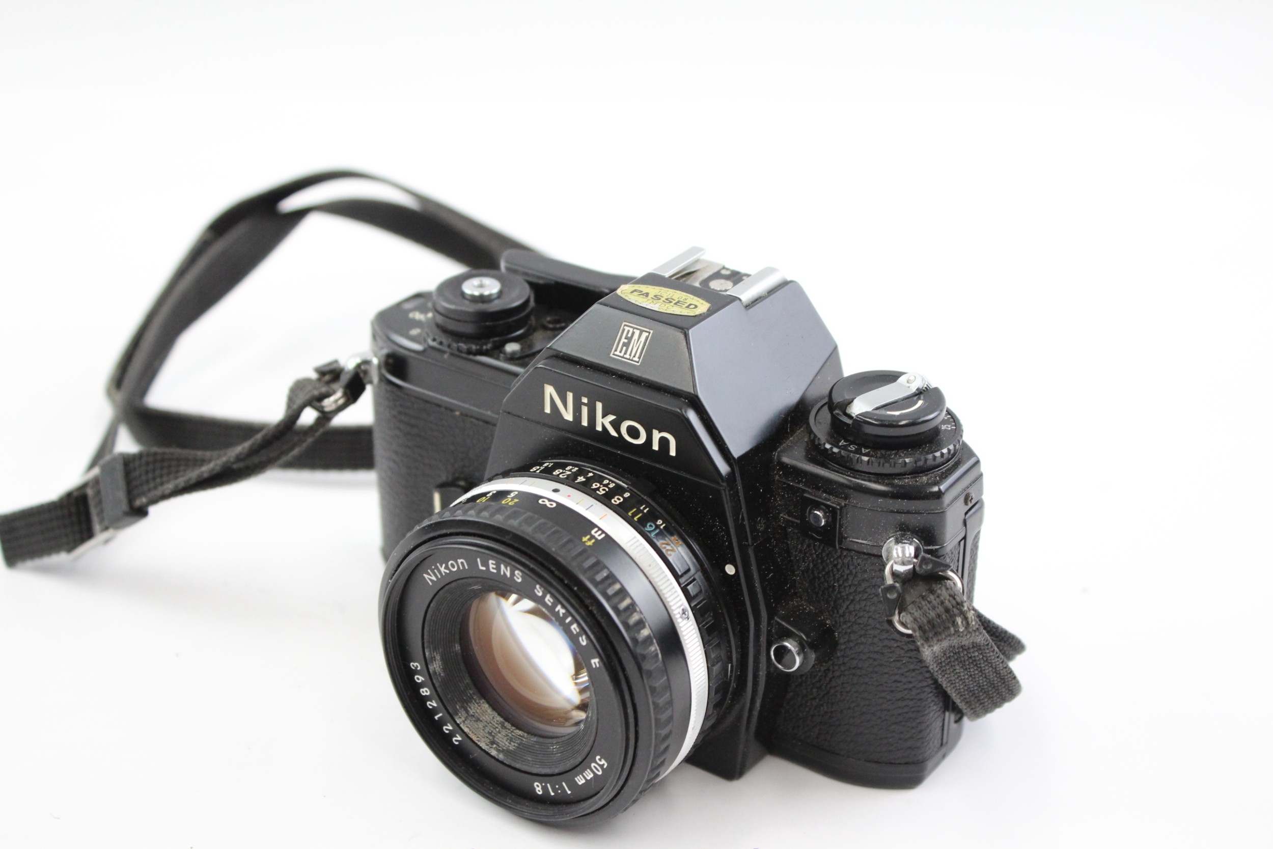 A cased Nikon EM 35mm SLR camera fitted with Series E 1:1.8 50mm lens