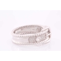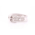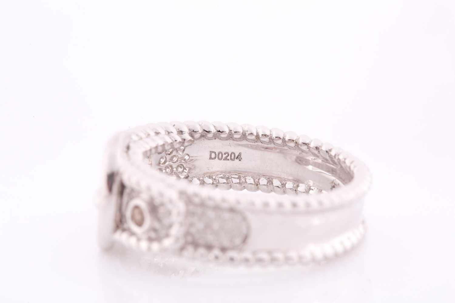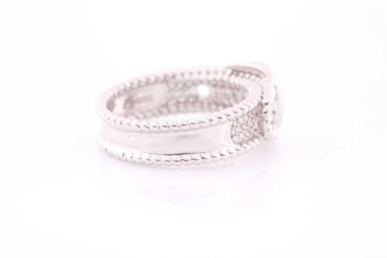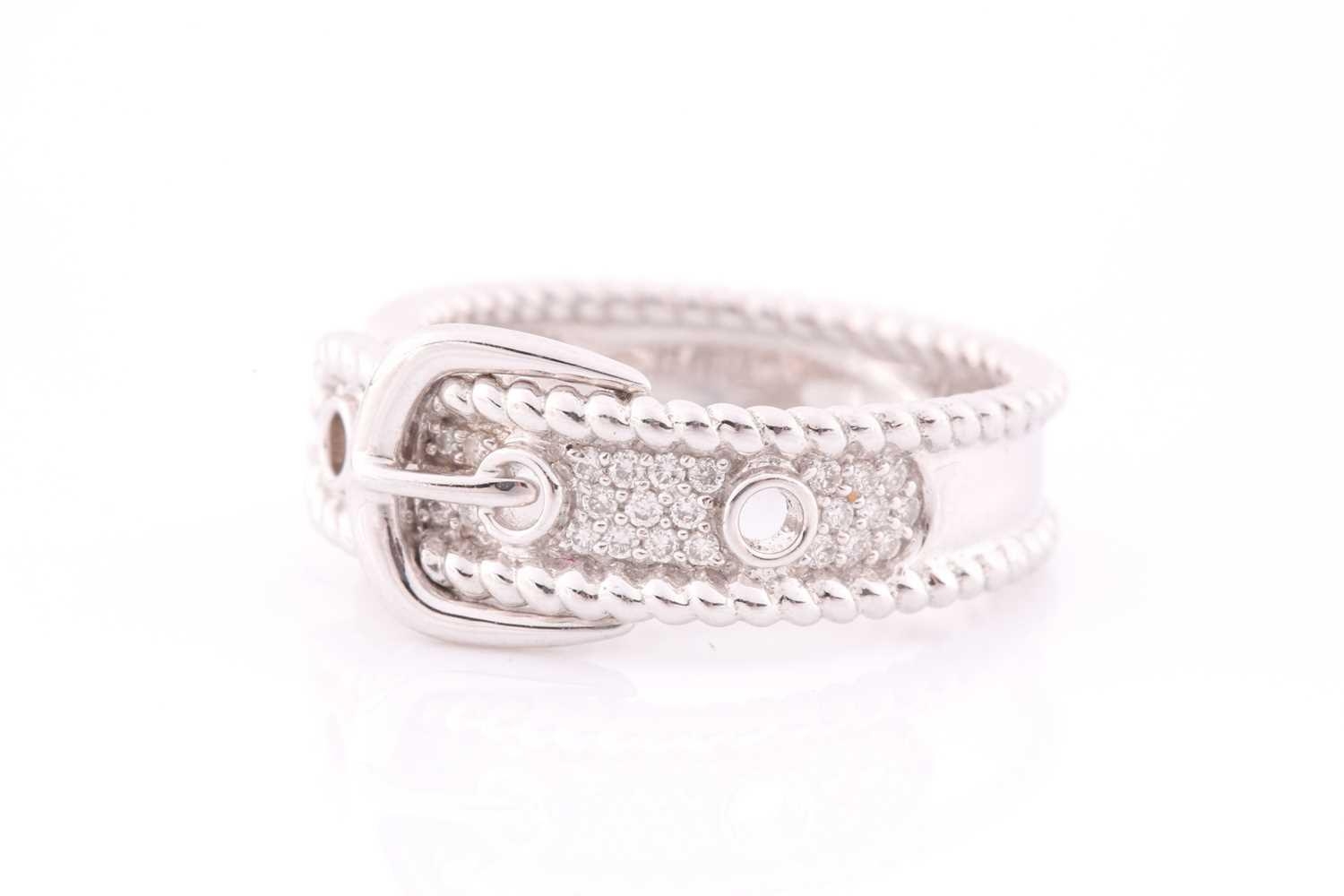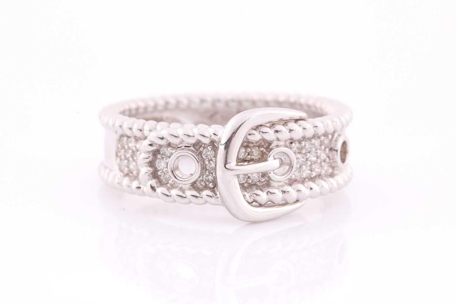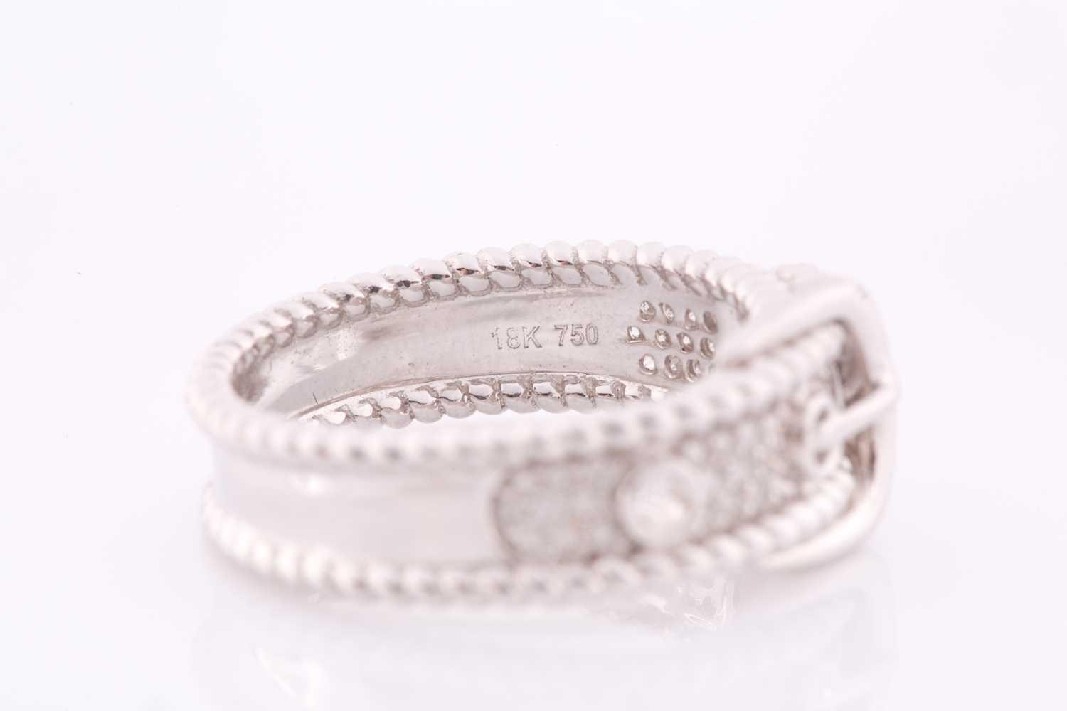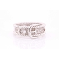 An 18ct white gold and diamond buckle ring, the mount pave-set with round brilliant-cut diamond accents, size N, 6.8 grams.