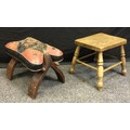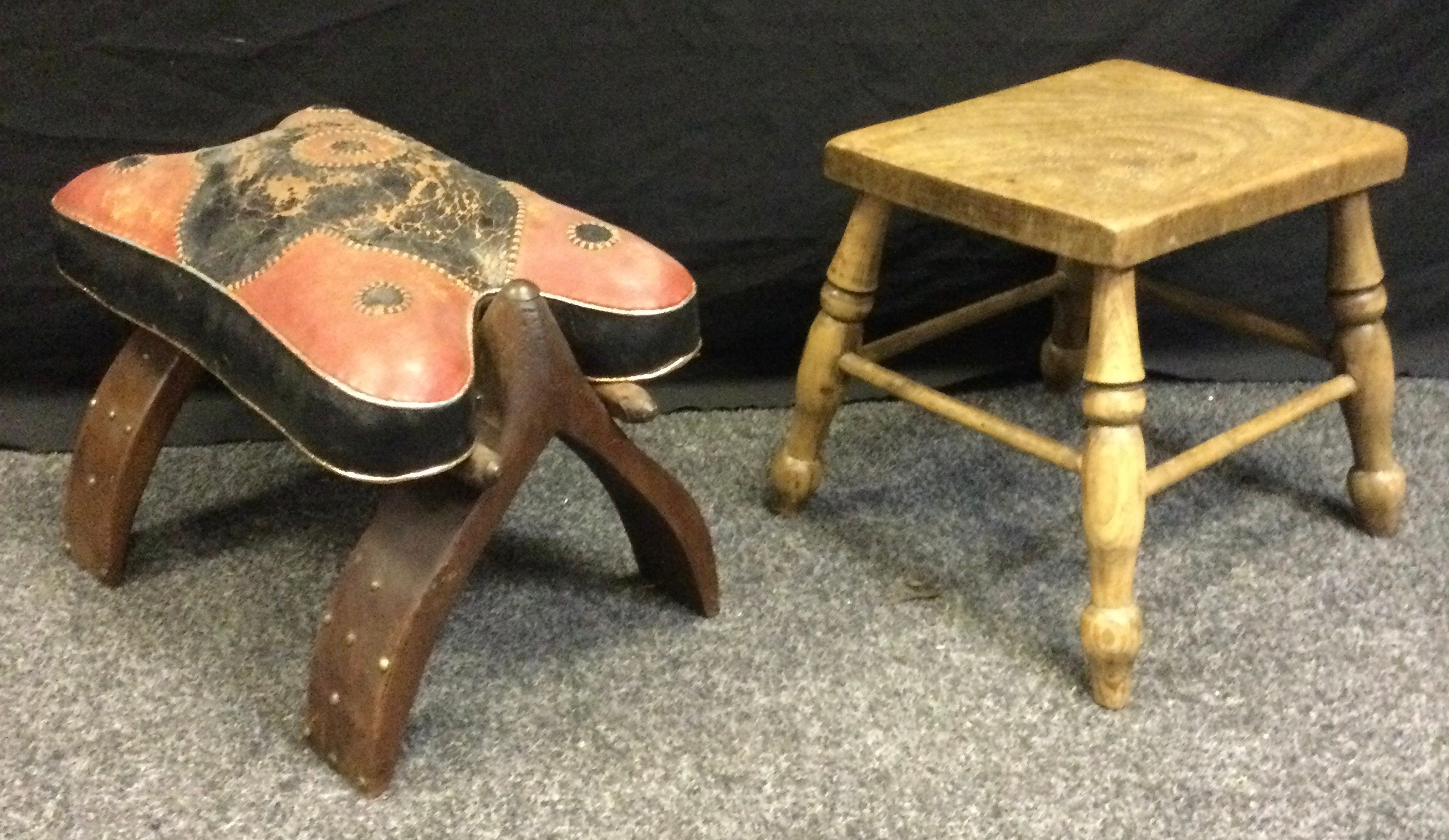 An early 20th century rectangular Elm stool, turned legs, 31cm high, 33cm deep, 26cm wide; a Camel stool, red and black leather padded seat, shaped supports, 36cm high, 46cm long (2)