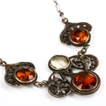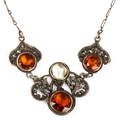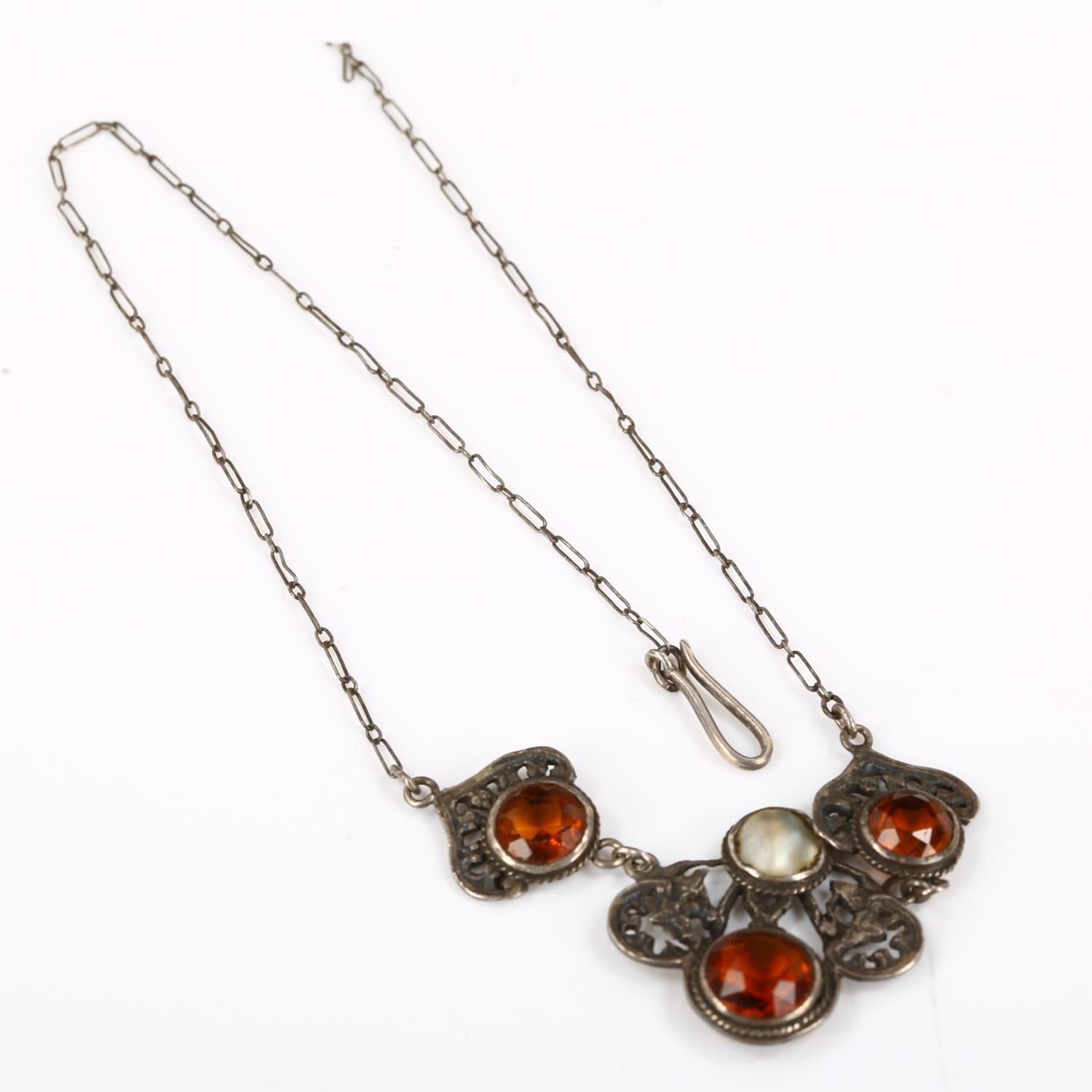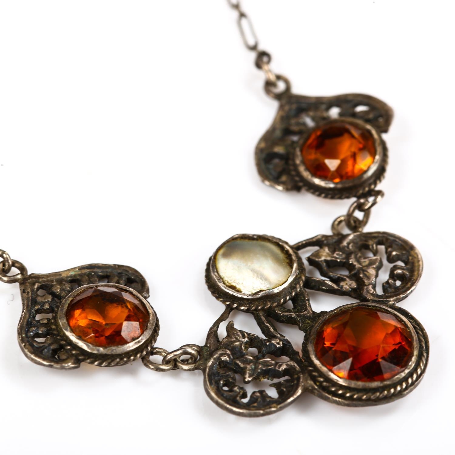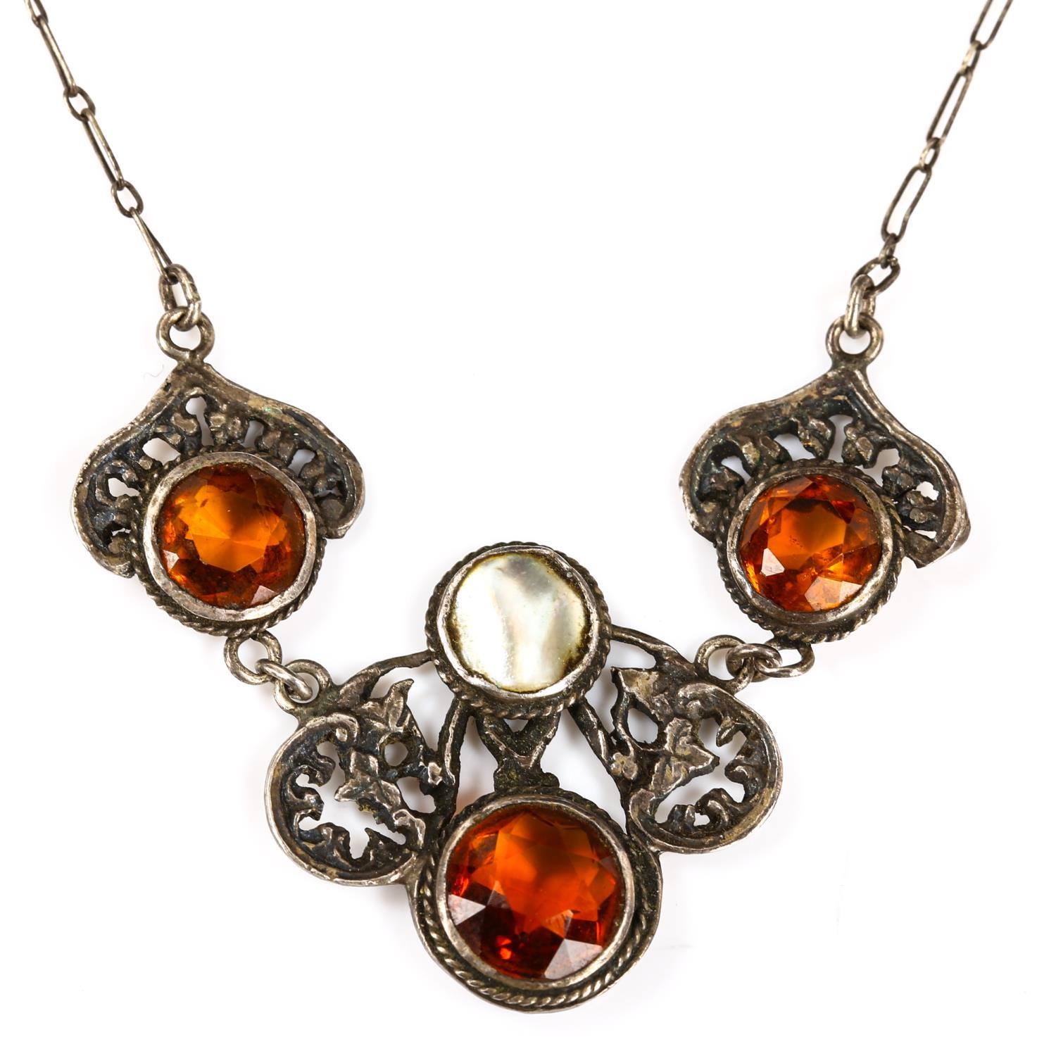 A Continental Arts and Crafts unmarked silver citrine and blister pearl necklace, pierced floral design, length 33cm, 6.4g (lacking section of chain)