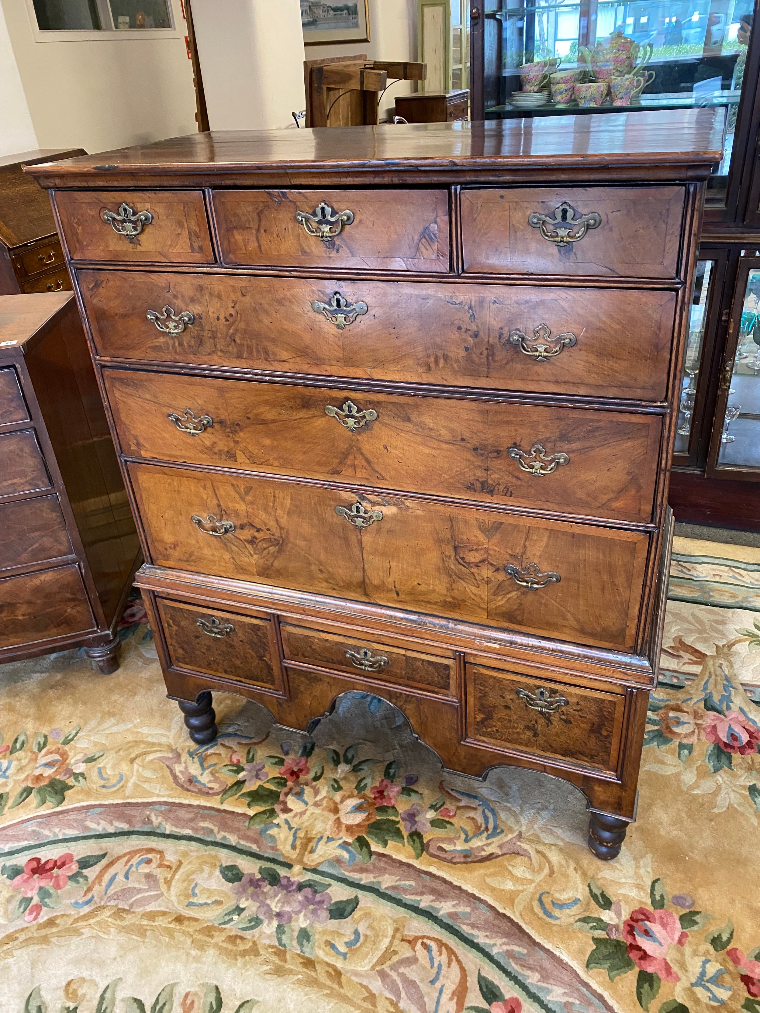 A Queen Anne walnut veneered chest on stand, the upper part fitted three narrow and three wide drawers, the base fitted three drawers, on later turned feet - 40in. wide
