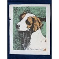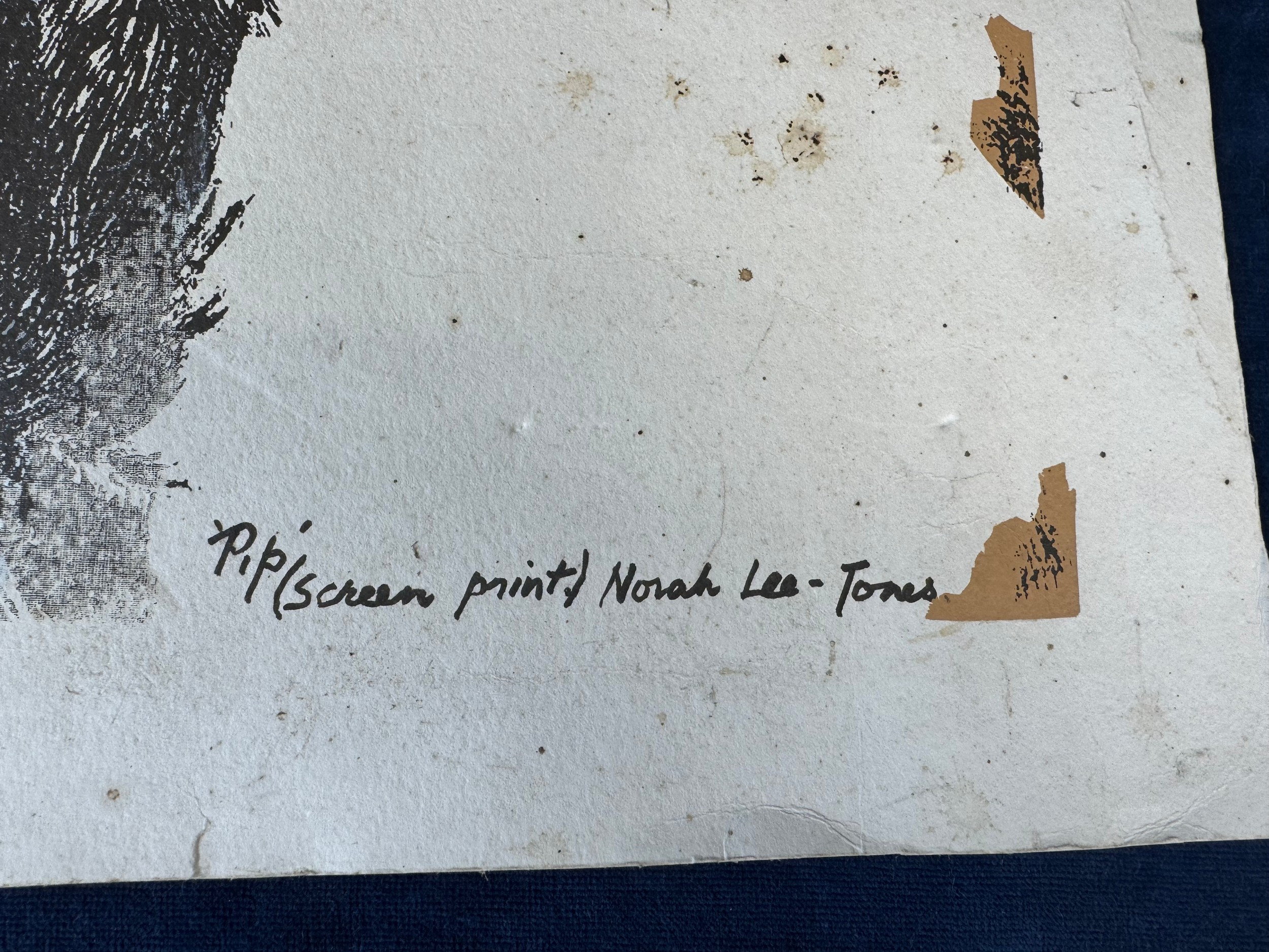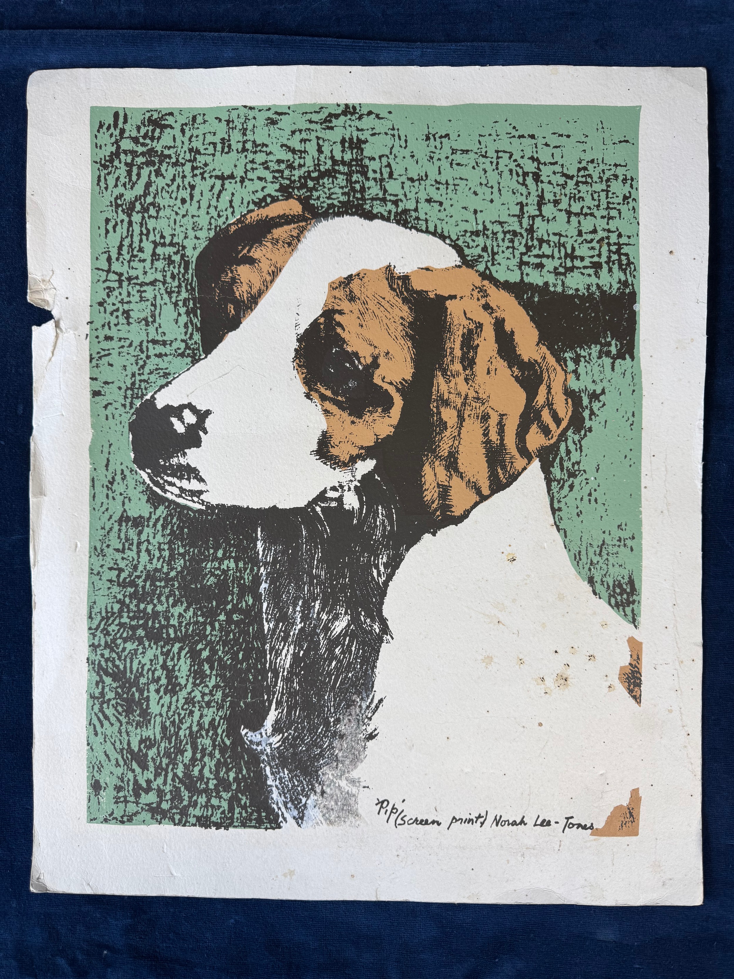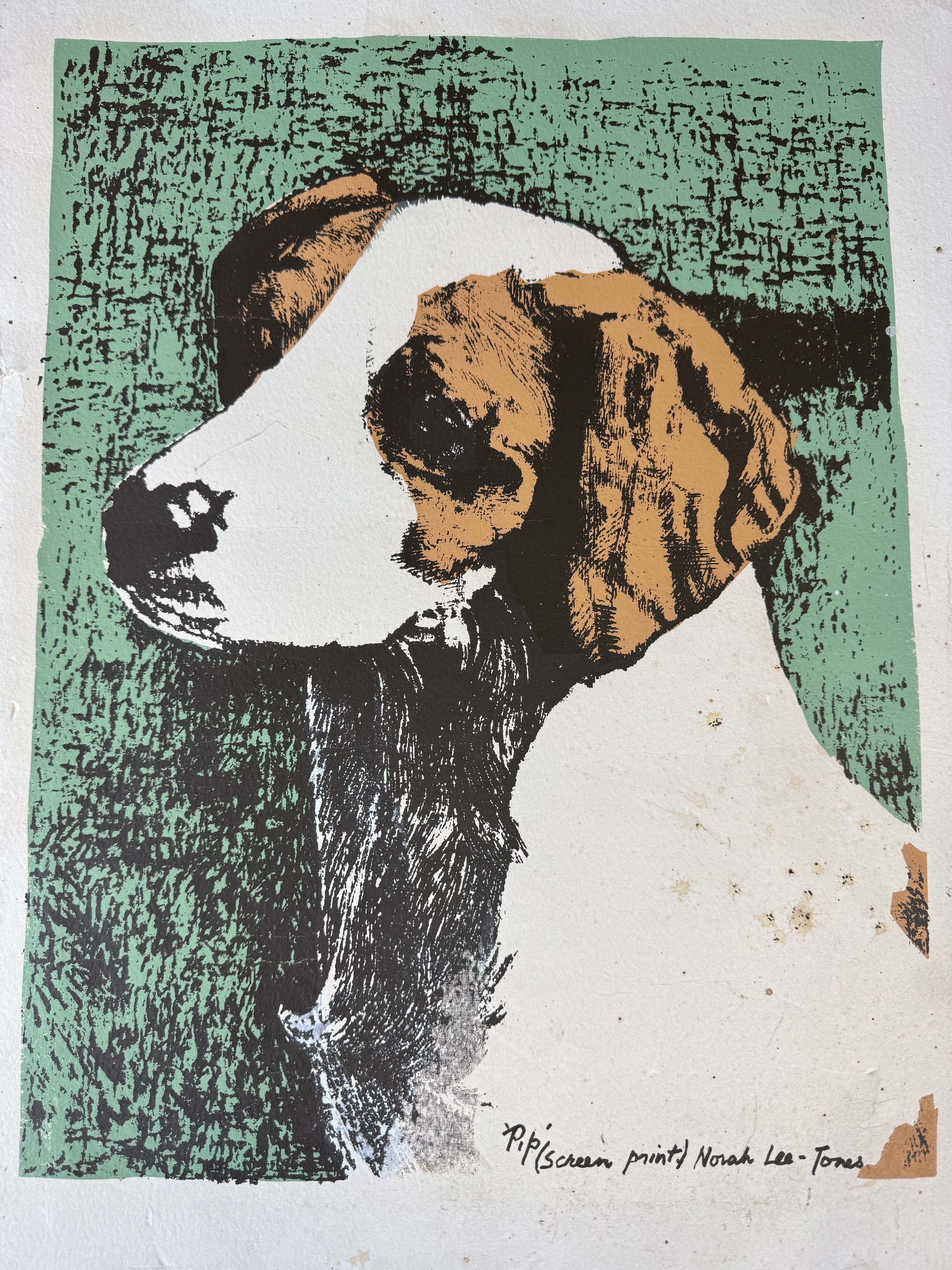 An unframed and unmounted screen print depicting a pointer dog, titled 'Pip', by the artist Norah Lee-Jones. Damage to one edge.