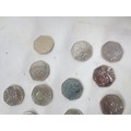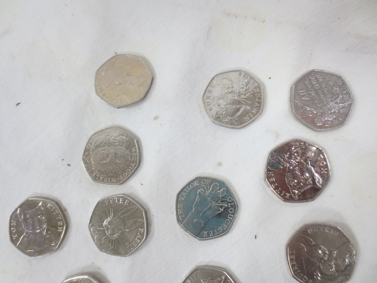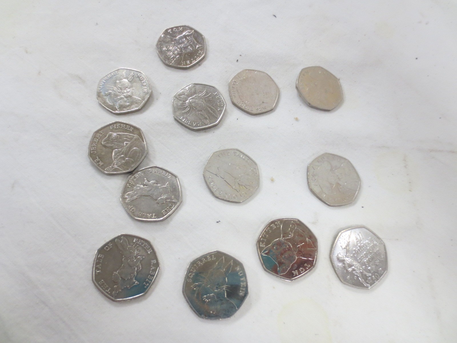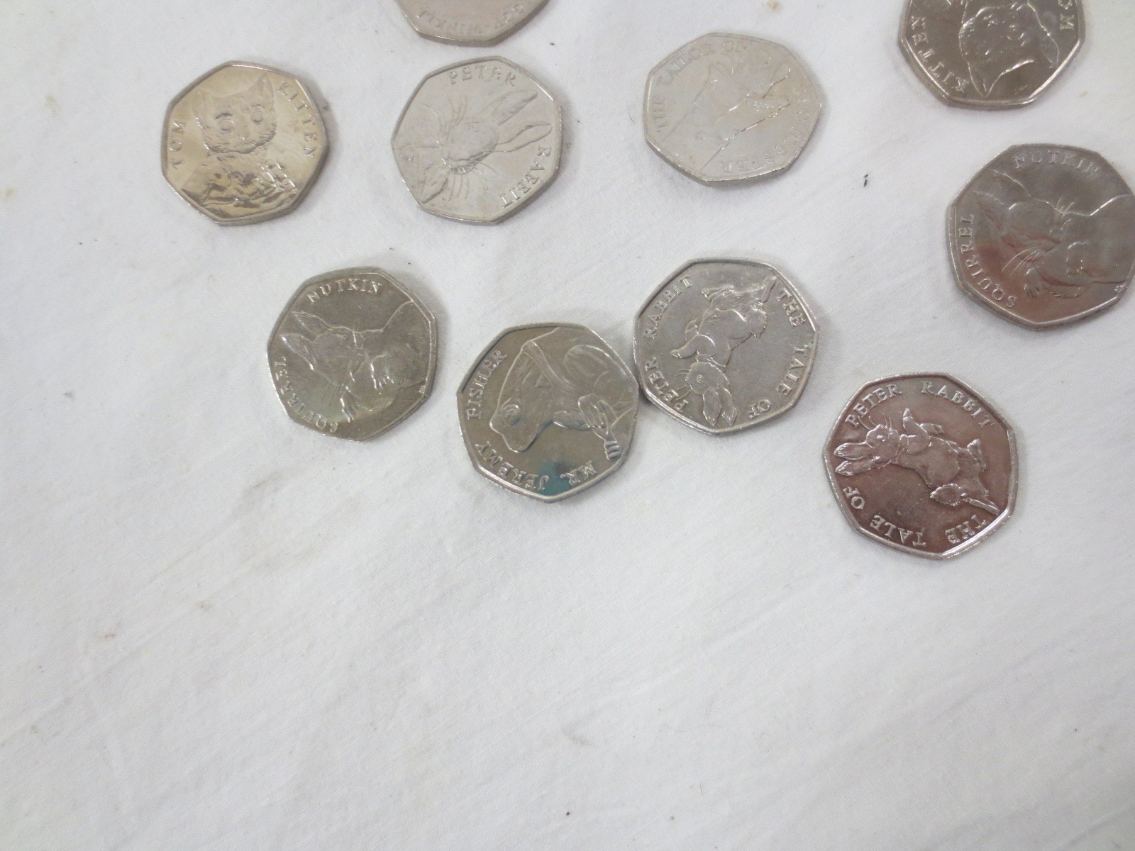 Twelve 2016 and 2017 Beatrix Potter 50 pence coins, and one Isle of Man 50 pence coin Peter Pan All Children Except One Grow Up